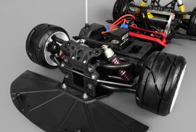 Die Modelle sind auf einem 4mm Alu-Chassis mit Doppelquerlenkern an Hinter- und Vorderachse aufgebaut. Alle Bohrungen des Alu-Chassis zur Befestigung der Fahrwerksteile sind von unten versenkt. An Vorder- und Hinterachse können mittels Spurstangen bzw. Einstellschrauben mit Rechts-/Linksgewinde Radsturz, Nachlauf und Vorspur eingestellt werden.