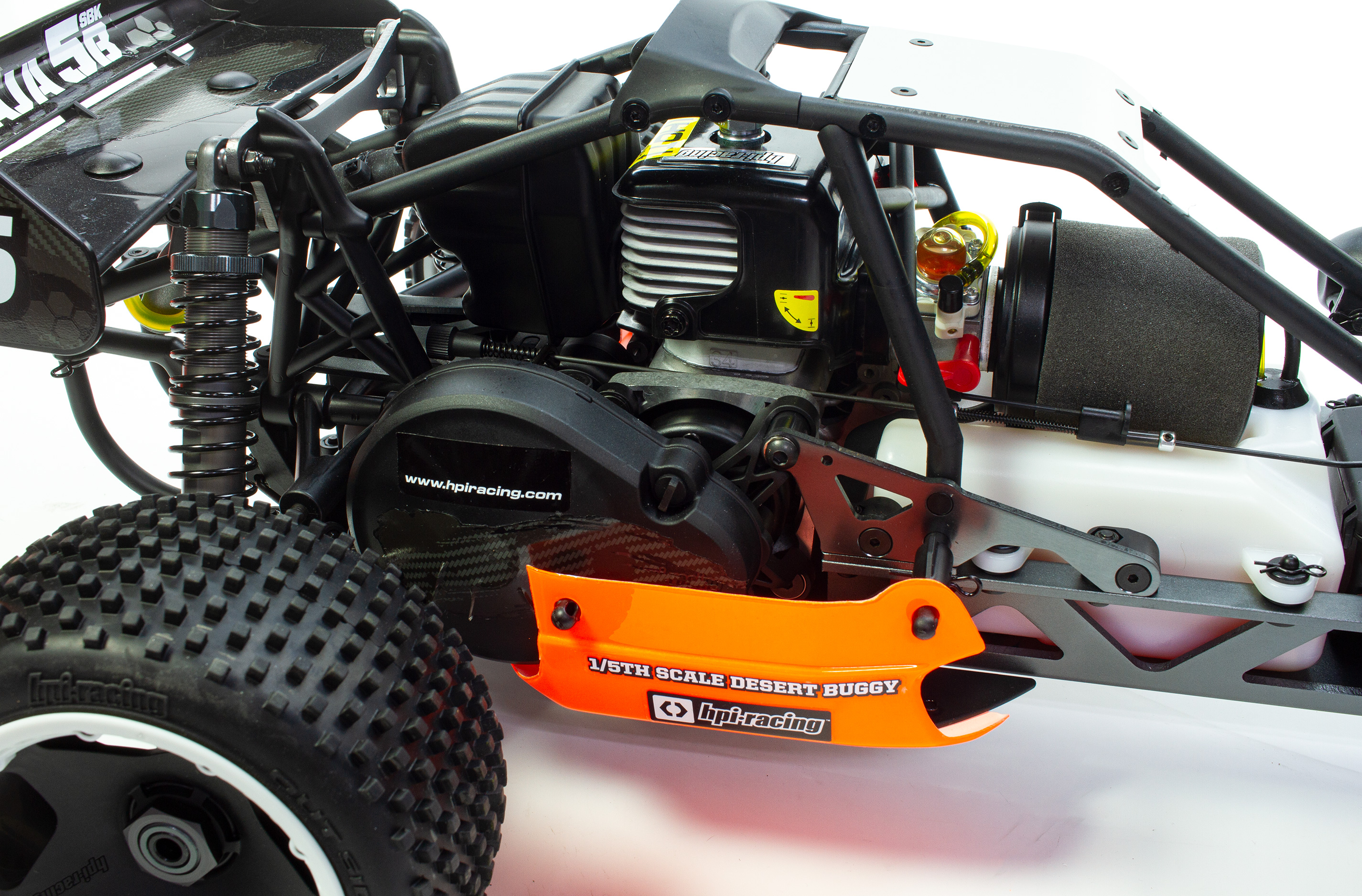 Das schmale Monocoque-Chassis aus steifem 4mm 6061er Flugzeugaluminium verleiht dem HPI Baja 5B SBK eine klassische Desert Race Buggy-Optik und extreme Steifigkeit und Langlebigkeit. Das U-förmige Chassis ist hinten mit einer dicken Kunststoff-Unterfahrschutzplatte geschützt, um Motor und Antriebsstrang zusätzlich zu schützen.