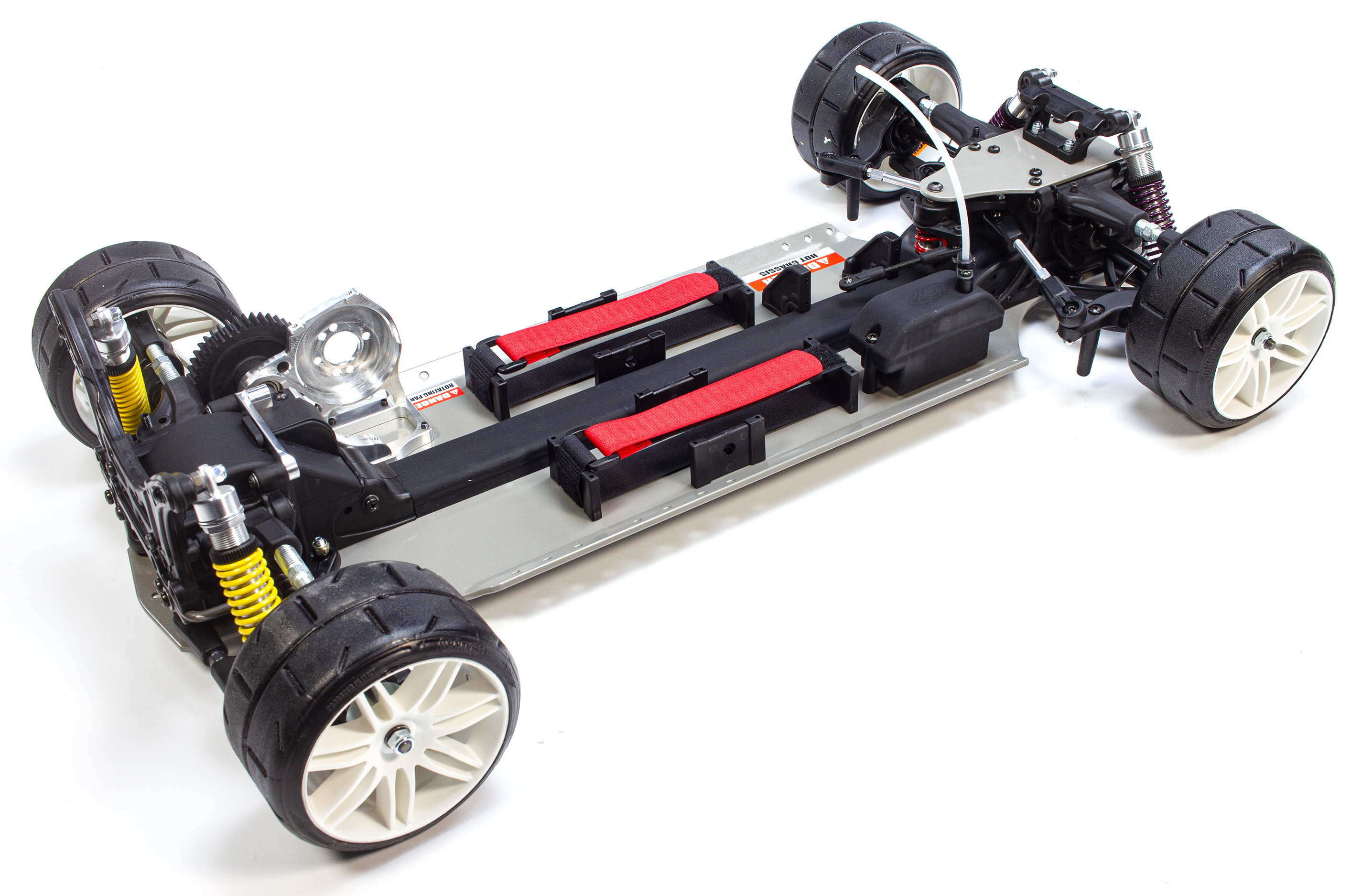 Alu Motorhalterung, Alu Hauptzahnrad, kurzes Getriebe-Übersetzungsverhältnis, Gelenk-Antriebswellen, härtere Stoßdämpfer und Spezial-Slickreifen.
