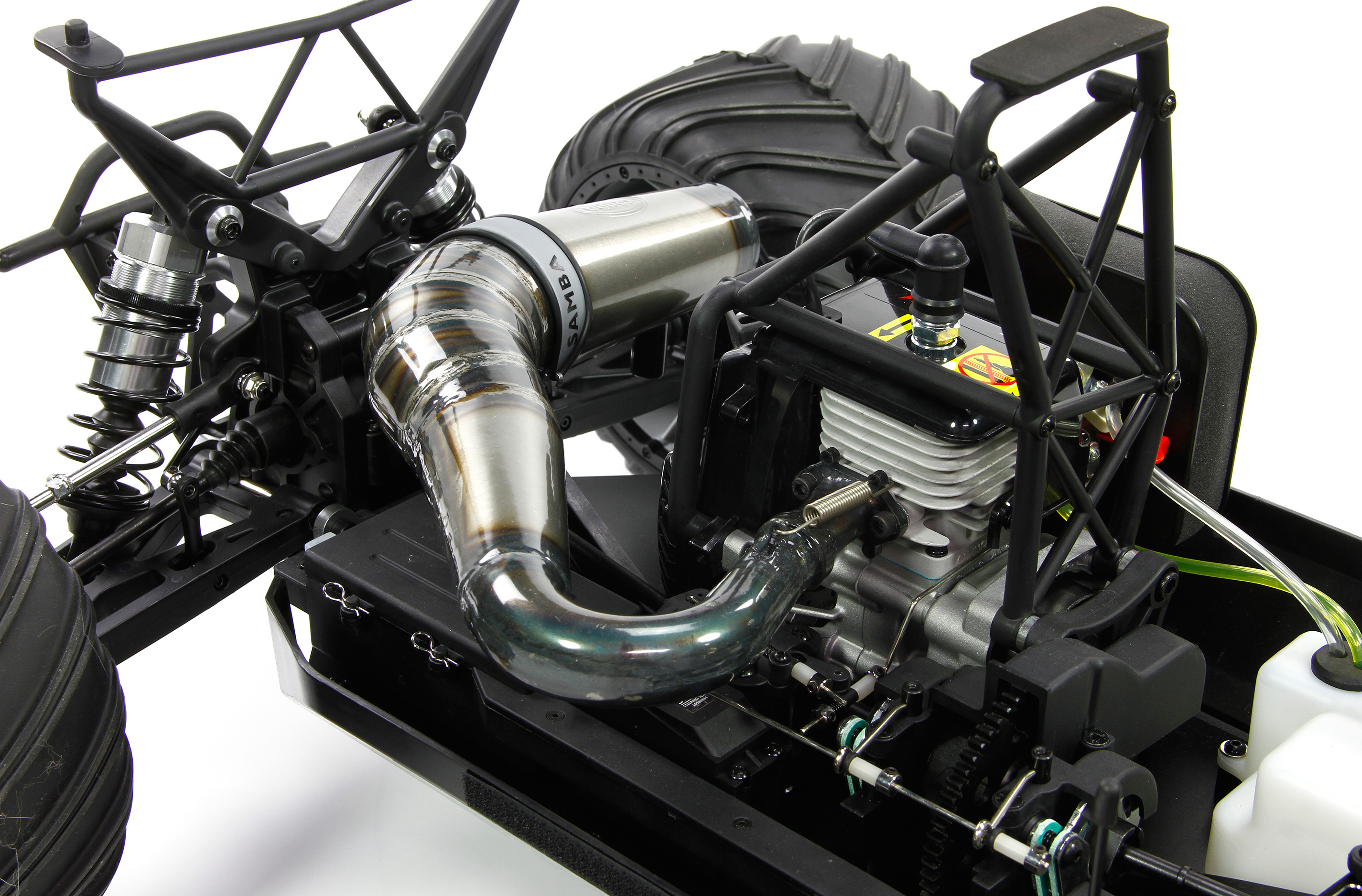 Die Fotos des Resonanzrohrs im montierten Losi 5ive-T dienen nur als Beispielbilder und zeigen die Stahlversion mit der Bestellnummer 4822 der Samba 5ive-T Resonanzrohranlage.
