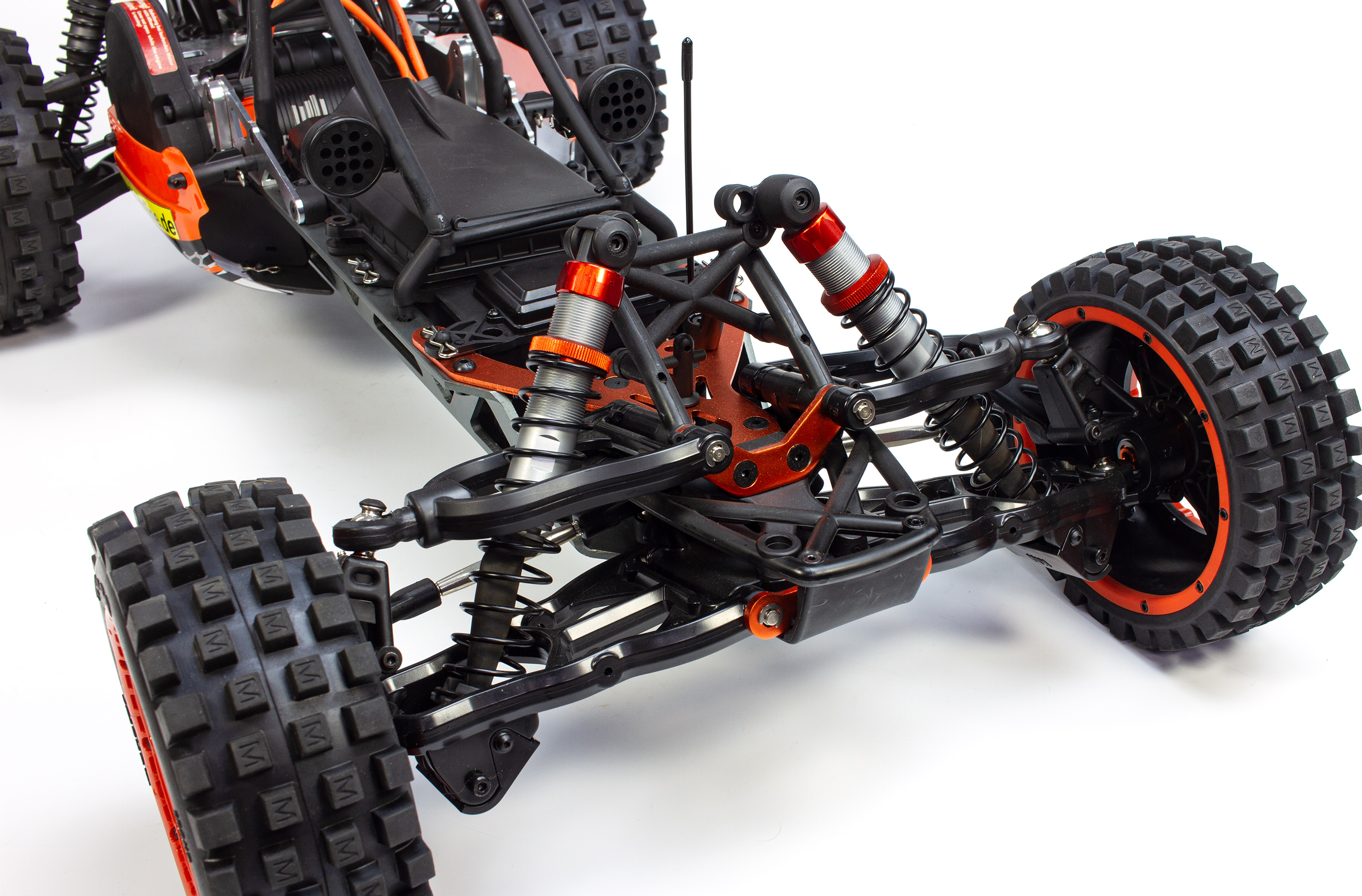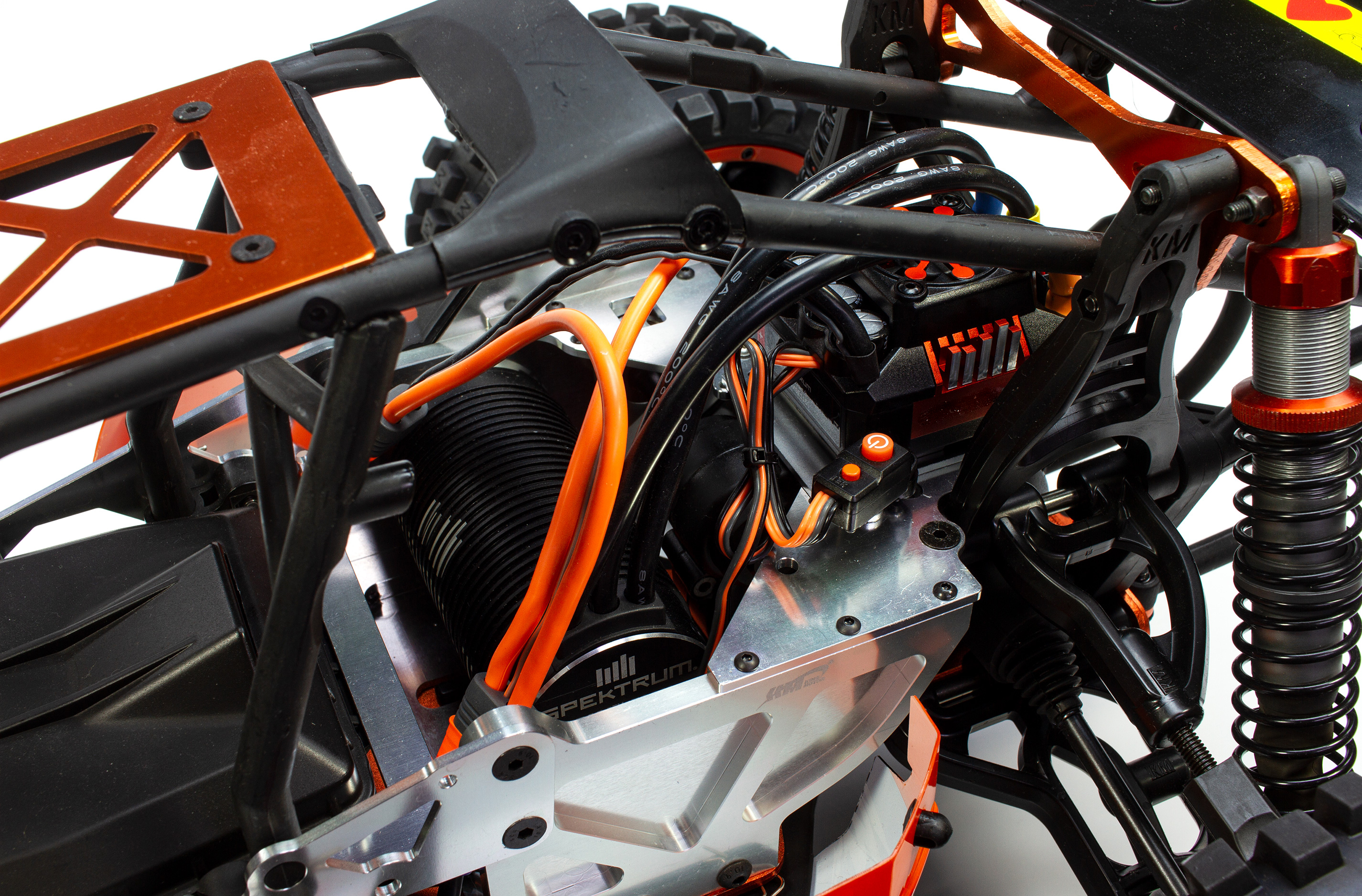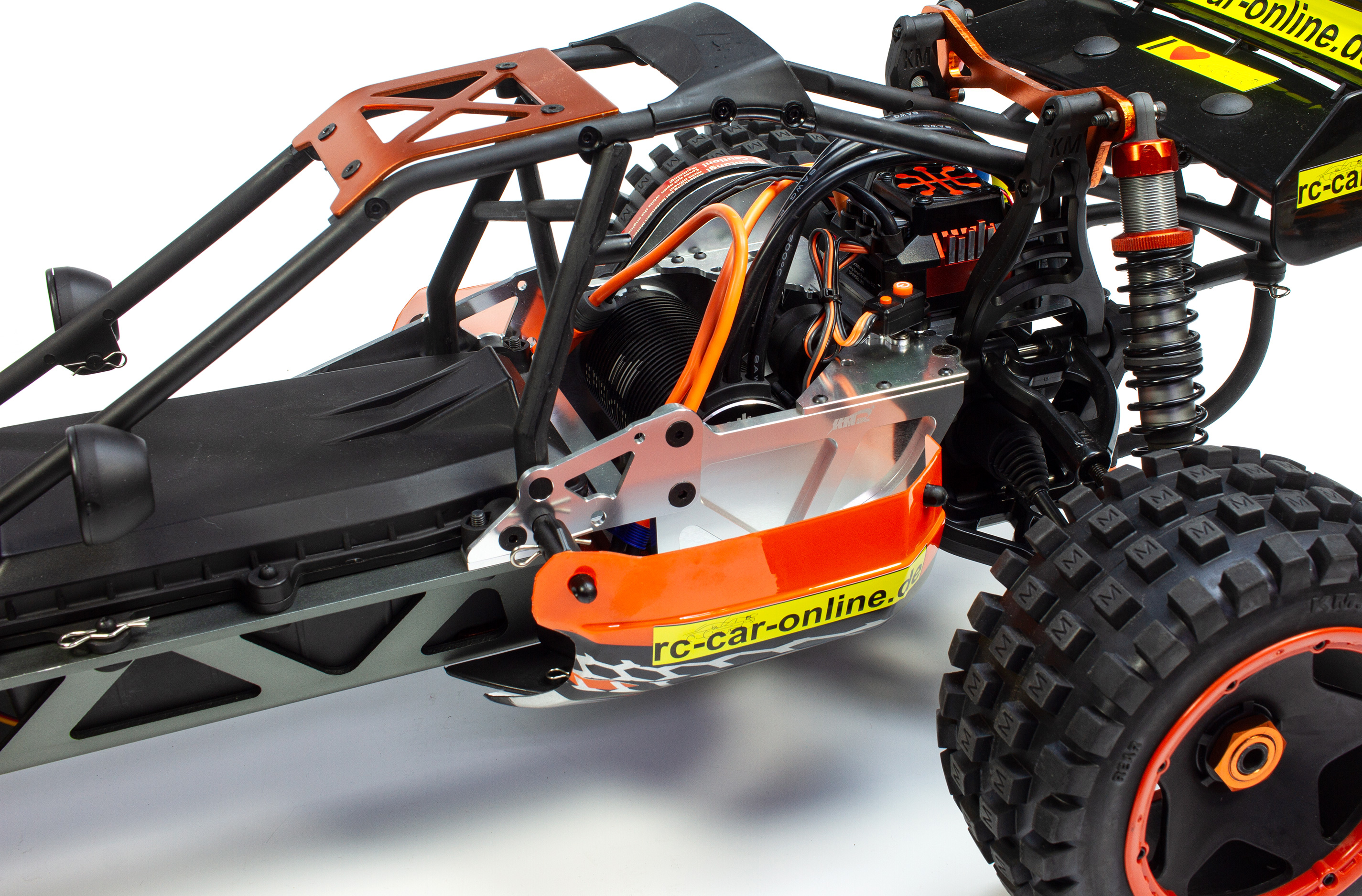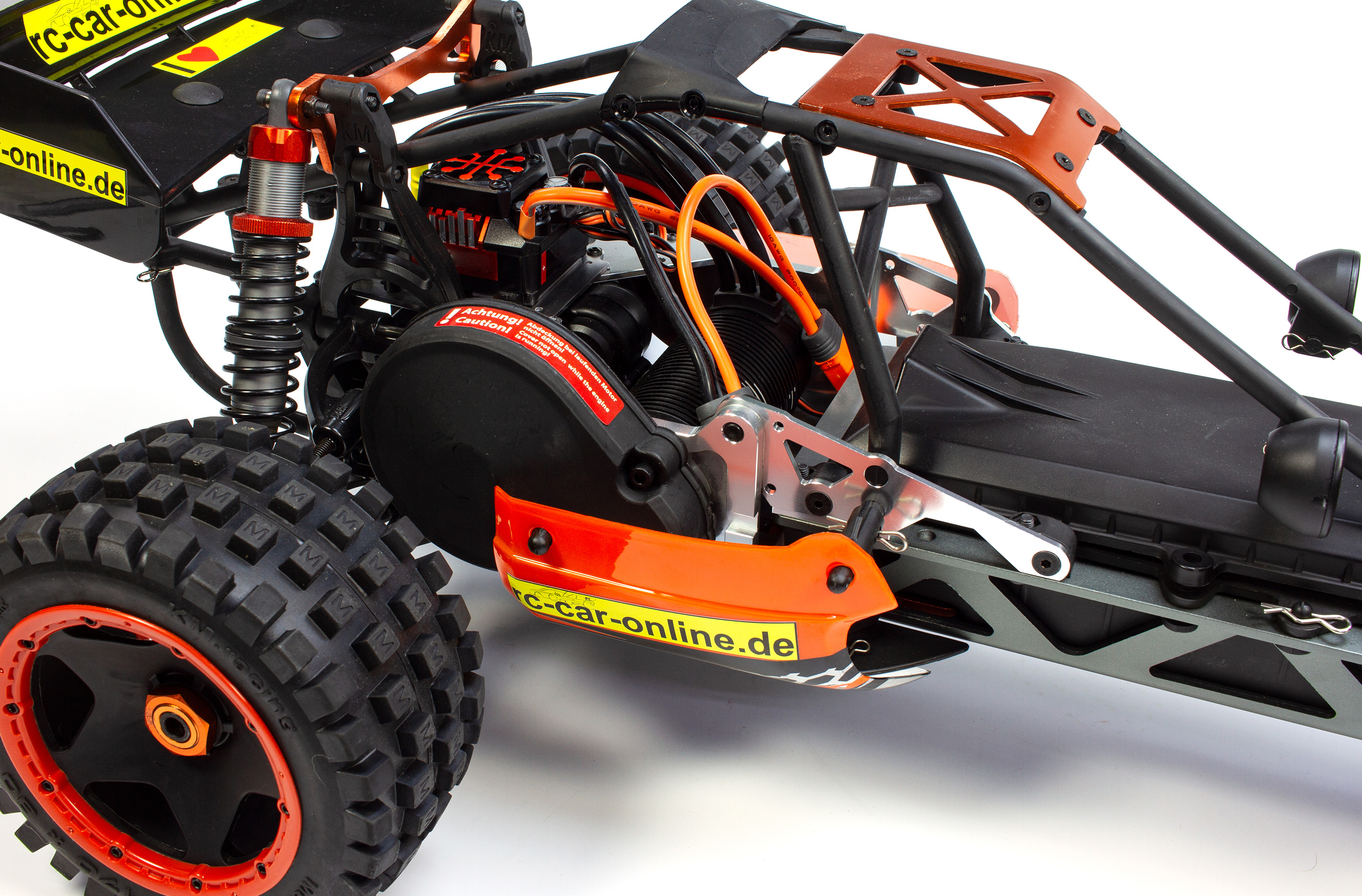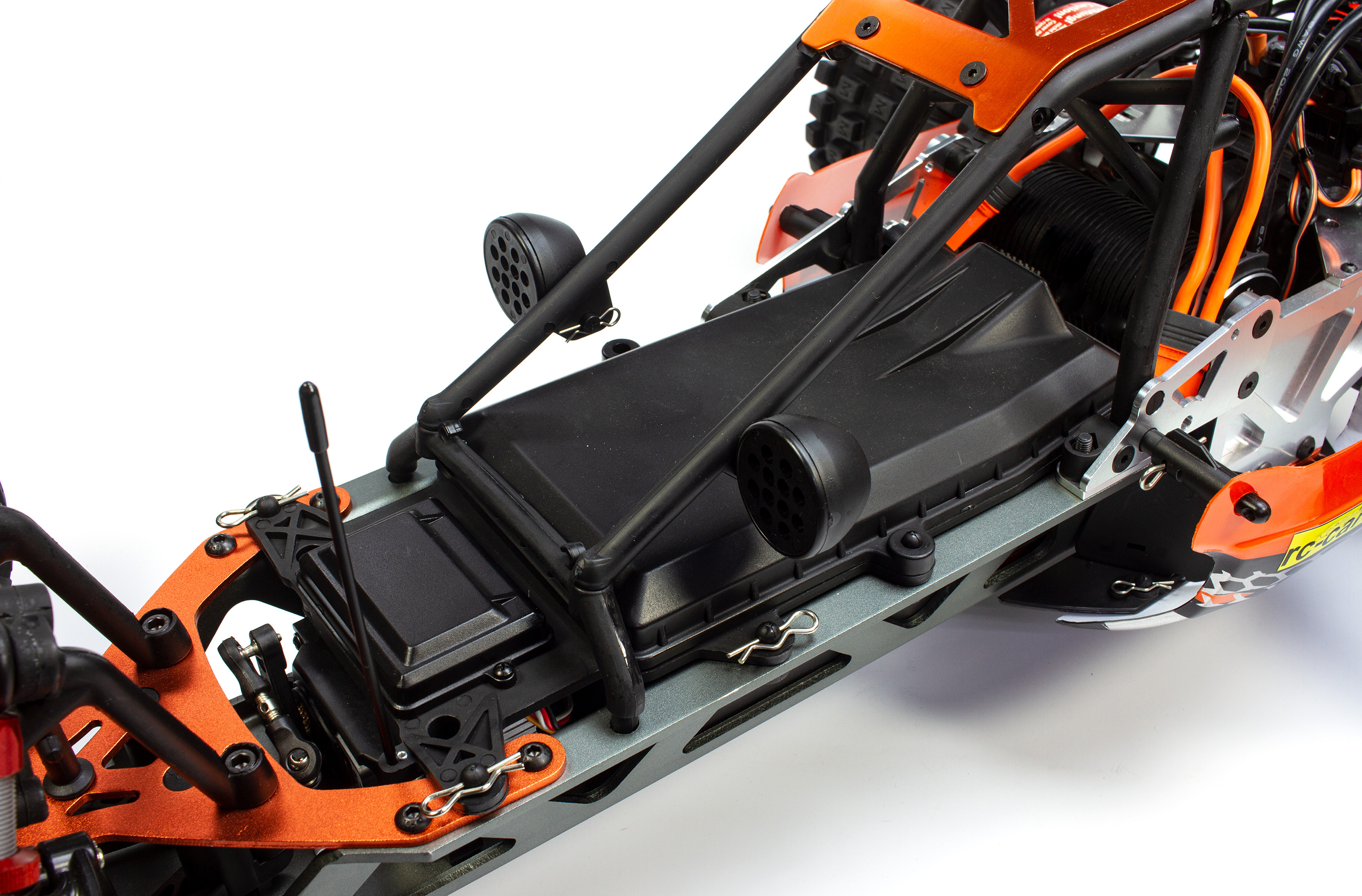 Der Carson Wild E Attack entspricht im Prinzip der GP Ausführung, jedoch sorgt statt des Benzinmotors hier eine Brushless-Antriebseinheit für Vortrieb. Neben der anderen Motorisierung kommt daher auch eine andere Empfängerbox zum Einsatz, in welcher auch der Fahrakku gut geschützt untergebracht wird.