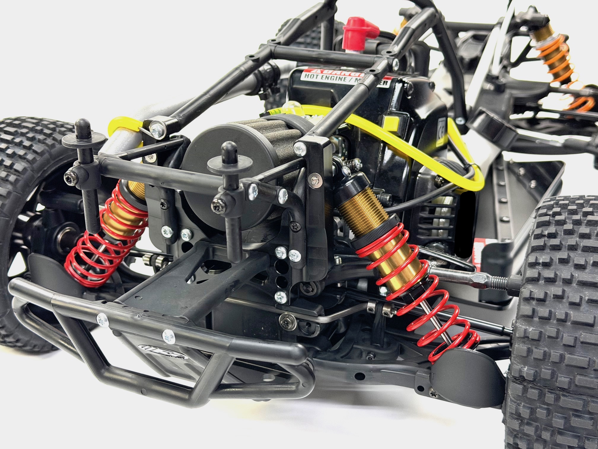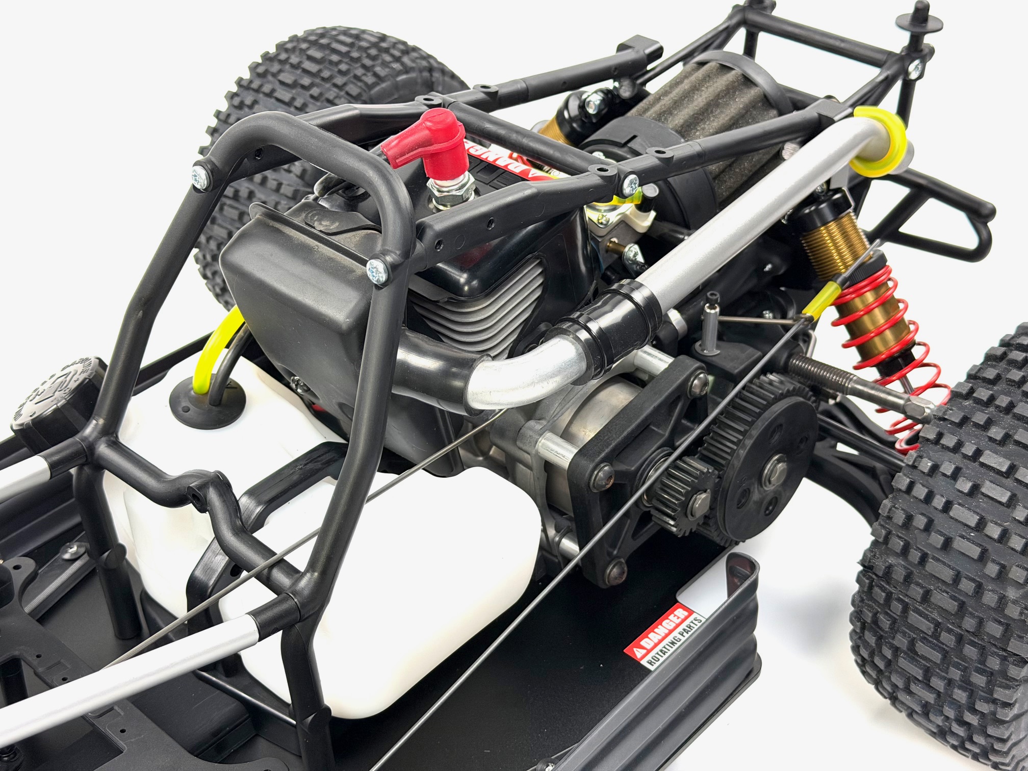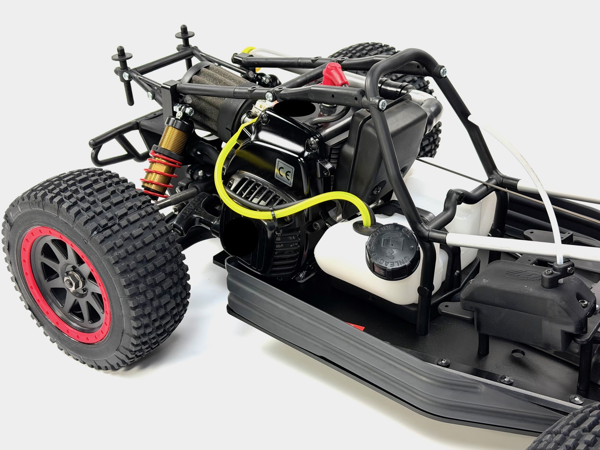 Das Modell ist mit einem leistungsstarken 26 cm³ Verbrennungsmotor mit Schalldämpfer und betriebsfertig eingeölten Luftfilter ausgerüstet. Dieser benötigt normales 2-Takt-Benzin-Ölgemisch (erhältlich an jeder Tankstelle). Der Tankinhalt von 0,7 Liter ermöglicht eine Fahrzeit von etwa 45 Minuten. Durch die eingebaute Zugstarteinrichtung kann der Motor ohne Fremdstarthilfe problemlos gestartet werden.