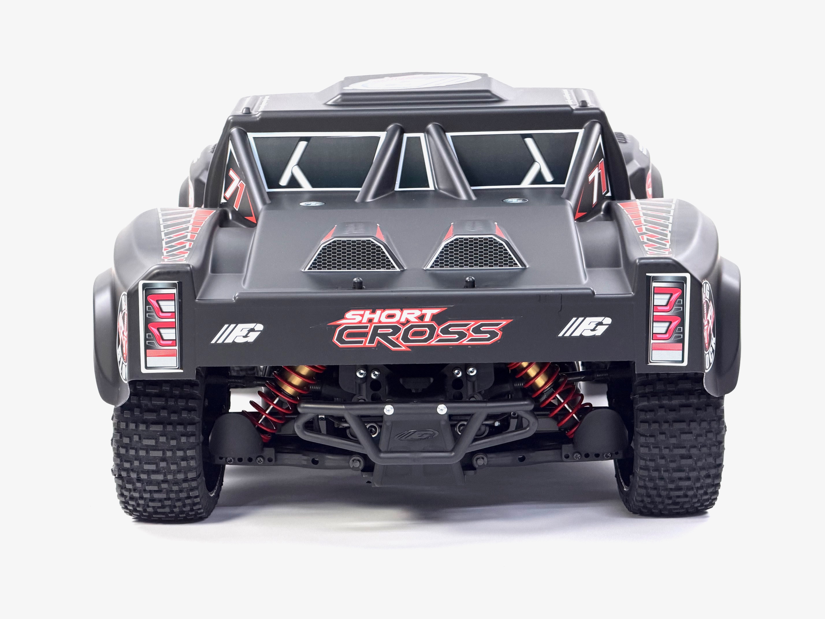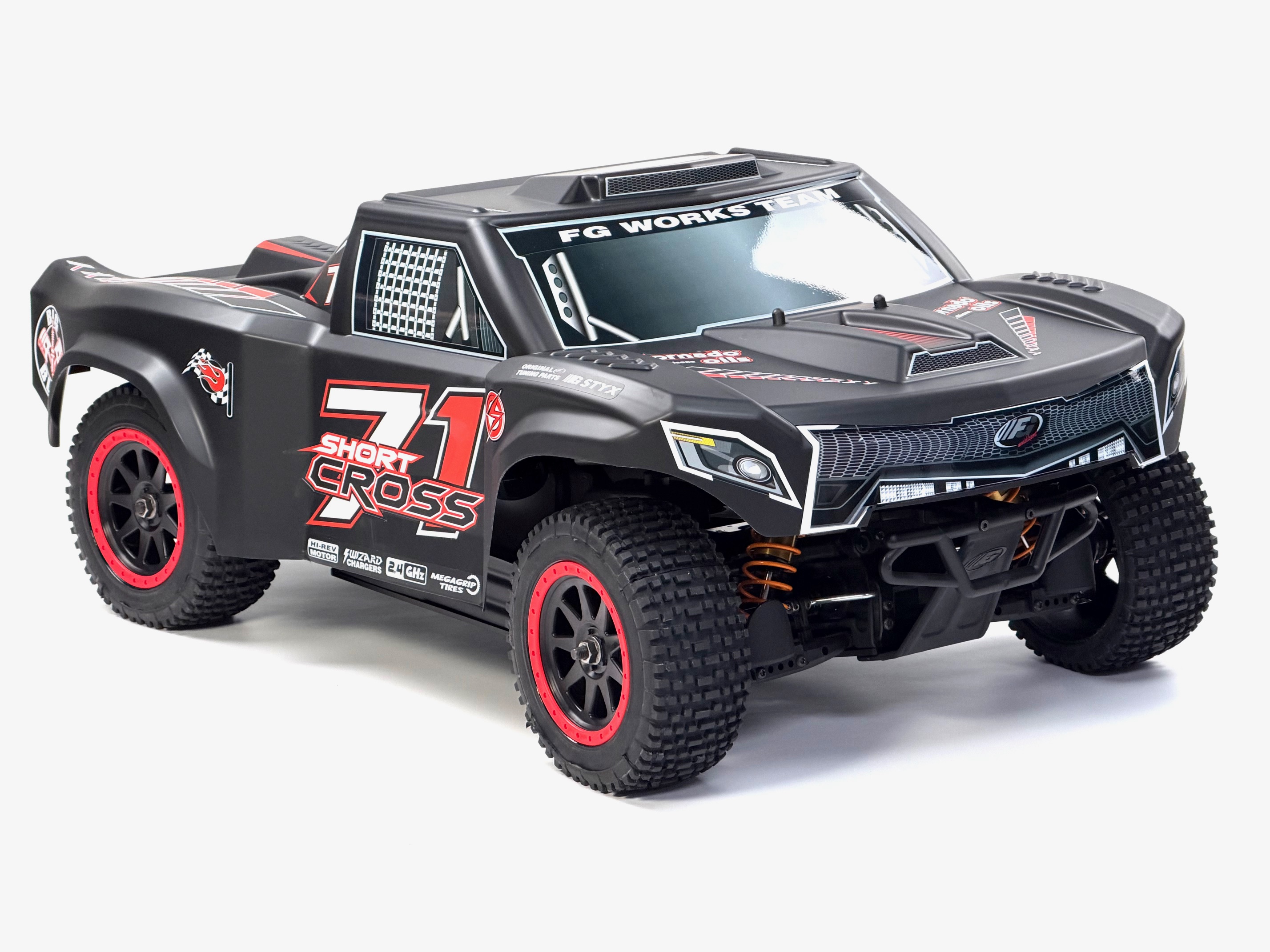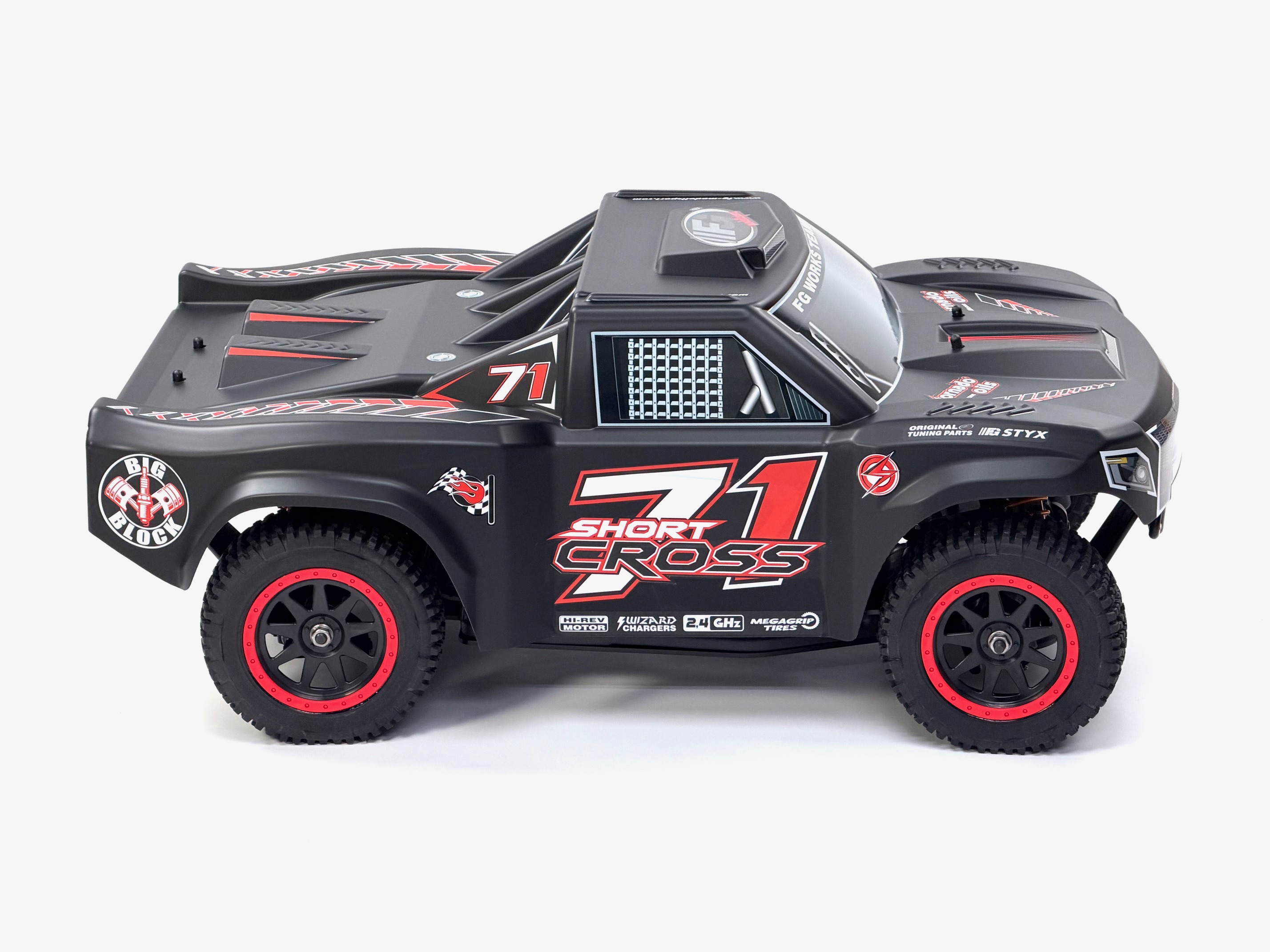 Hier der FG Short Cross 2WD mit 26ccm Chung Yang Motor und lackierter Karosserie.RTR zur Auswahl.Pro-Trucks oder Short Course werden in der Welt des Autorennsports immer beliebter.Sie sind monströse, leistungsstarke Autos mit großen Federwegen, die spektakuläre Gruppenrennen ermöglichen.Der "Short Cross" verfügt über eine zuverlässige Mechanik, die mit Versteifungen und Schutzklappen versehen sind.Eine sehr detaillierte Karosserie aus Polycarbonat passt sich perfekt dem Chassis an.Der 2WD Antrieb sorgt für problemlosen Vortrieb in jedem Gelände.Ausstattung des Fahrzeugs:- abgewinkeltes 4 mm Alu-Chassi- 26ccm Benzin 2Takt Motor- Differentialgetriebe Hinterachse mit gehärteten Kegel-Zahnrädern- Frontrammer und Heckrammer- Doppel-Querlenker an Vorder- und Hinterachse- Getriebebremse- einstellbare Rechts / Linksgewindestangen an den Spurstangen und an den Querlenkern vorne und hinten- Achsschenkel mit Lenkanschlägen vorne- Zahnräder aus einsatzgehärtetem Stahl, komplett kugelgelagert- vier großvolumige Öldruckstoßdämpfer- EmpfängerboxDas Modell ist mit einem leistungsstarken 26 cm³ Verbrennungsmotor mit Schalldämpfer und betriebsfertig eingeölten Luftfilter ausgerüstet. Dieser benötigt normales 2-Takt-Benzin-Ölgemisch (erhältlich an jeder Tankstelle). Der Tankinhalt von 0,7 Liter ermöglicht eine Fahrzeit von etwa 45 Minuten. Durch die eingebaute Zugstarteinrichtung kann der Motor ohne Fremdstarthilfe problemlos gestartet werden.Die RTR-Version wird mit montierter und eingestellter Fernlenkanlage und aufladbaren Akkus ausgeliefert. Für die Komplettierung der nicht RTR-Modelle eignen sich alle gängigen Servos und Fernsteuerungen.Abmessungen und Gewicht:- Länge 770 mm- Breite 480 mm- Höhe 320 mm- Radstand 485 mm- Gewicht ca. 11 kg1 Stück