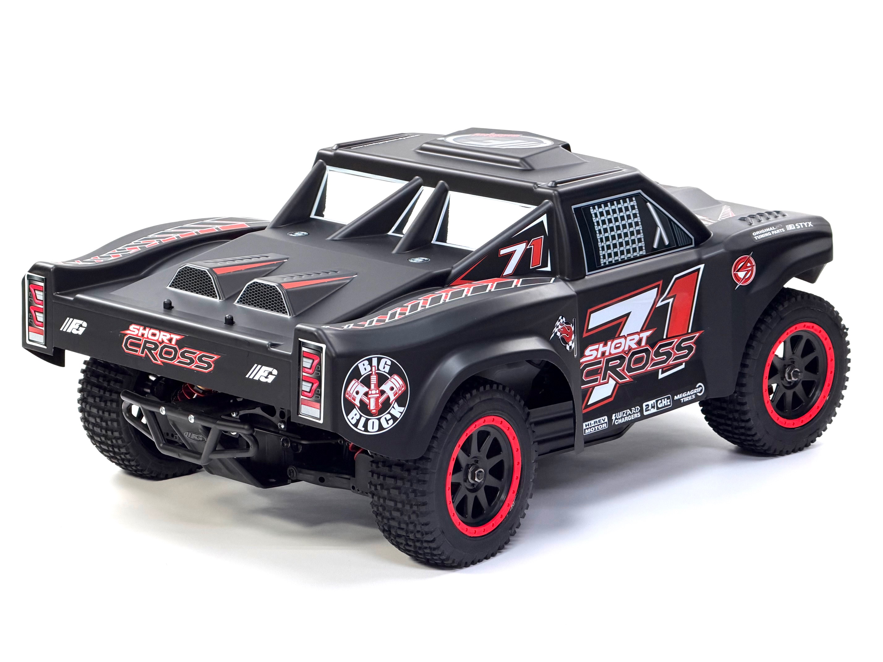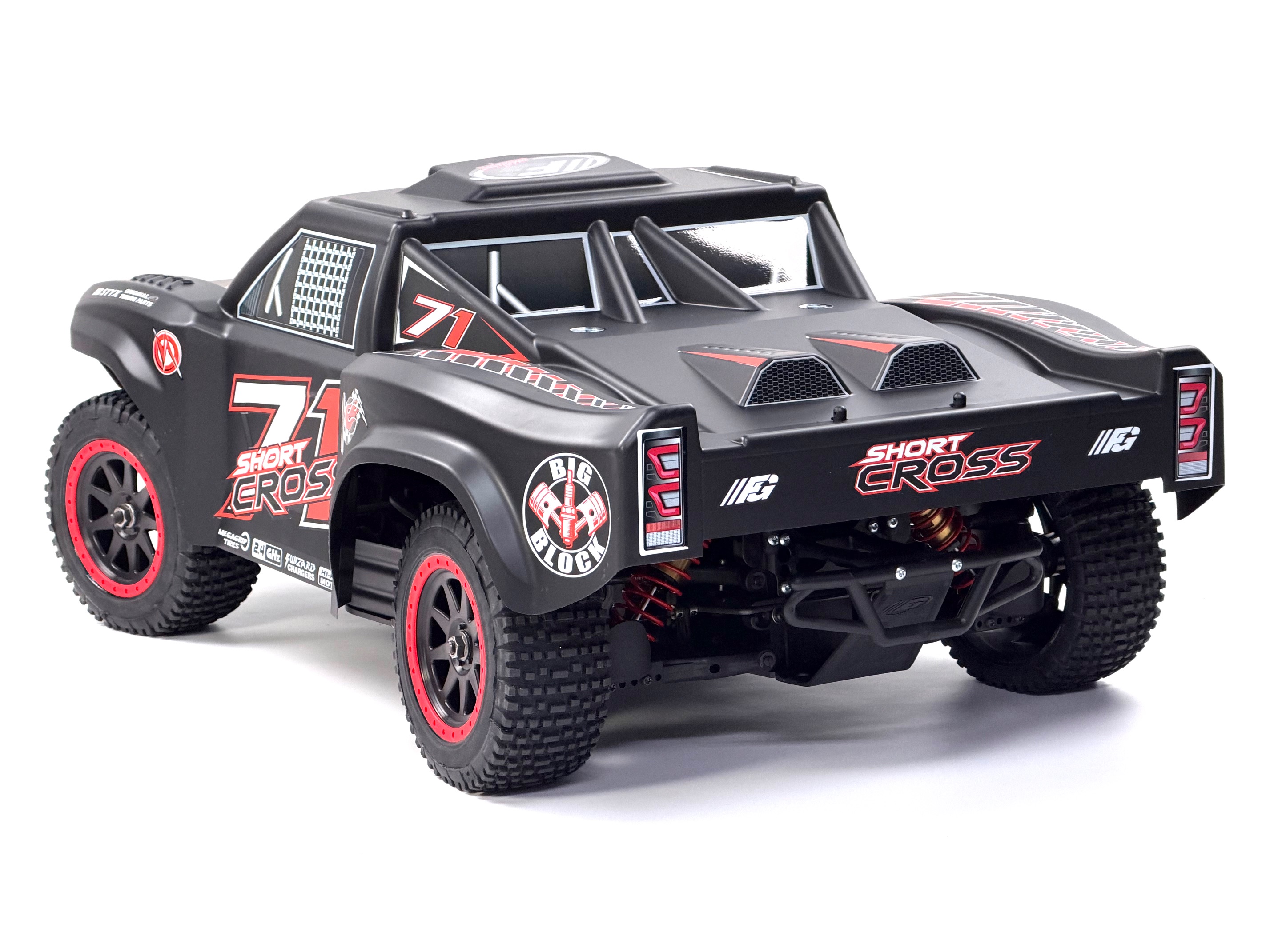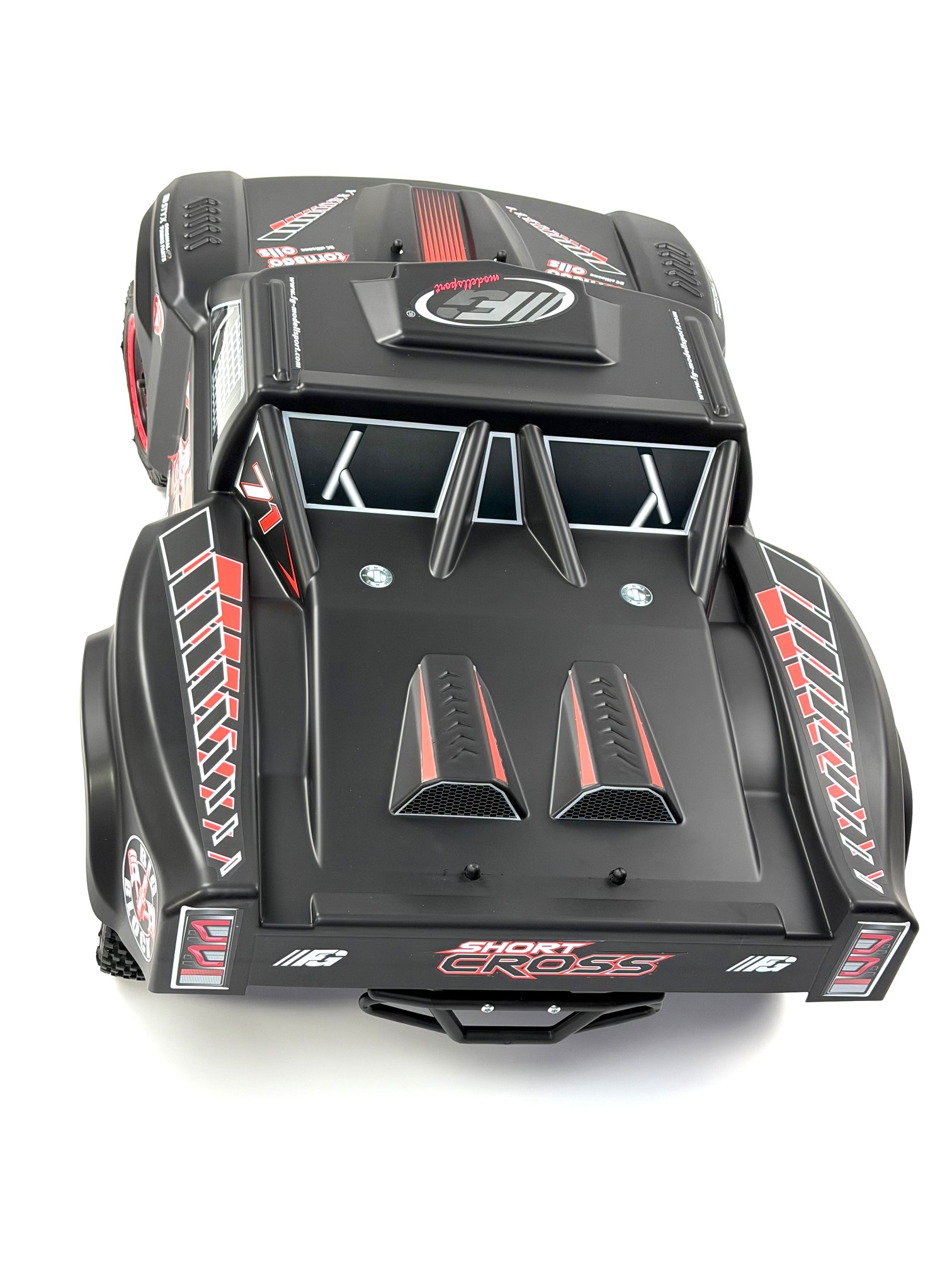 Hier der FG Short Cross 2WD mit 26ccm Chung Yang Motor und lackierter Karosserie.RTR zur Auswahl.Pro-Trucks oder Short Course werden in der Welt des Autorennsports immer beliebter.Sie sind monströse, leistungsstarke Autos mit großen Federwegen, die spektakuläre Gruppenrennen ermöglichen.Der "Short Cross" verfügt über eine zuverlässige Mechanik, die mit Versteifungen und Schutzklappen versehen sind.Eine sehr detaillierte Karosserie aus Polycarbonat passt sich perfekt dem Chassis an.Der 2WD Antrieb sorgt für problemlosen Vortrieb in jedem Gelände.Ausstattung des Fahrzeugs:- abgewinkeltes 4 mm Alu-Chassi- 26ccm Benzin 2Takt Motor- Differentialgetriebe Hinterachse mit gehärteten Kegel-Zahnrädern- Frontrammer und Heckrammer- Doppel-Querlenker an Vorder- und Hinterachse- Getriebebremse- einstellbare Rechts / Linksgewindestangen an den Spurstangen und an den Querlenkern vorne und hinten- Achsschenkel mit Lenkanschlägen vorne- Zahnräder aus einsatzgehärtetem Stahl, komplett kugelgelagert- vier großvolumige Öldruckstoßdämpfer- EmpfängerboxDas Modell ist mit einem leistungsstarken 26 cm³ Verbrennungsmotor mit Schalldämpfer und betriebsfertig eingeölten Luftfilter ausgerüstet. Dieser benötigt normales 2-Takt-Benzin-Ölgemisch (erhältlich an jeder Tankstelle). Der Tankinhalt von 0,7 Liter ermöglicht eine Fahrzeit von etwa 45 Minuten. Durch die eingebaute Zugstarteinrichtung kann der Motor ohne Fremdstarthilfe problemlos gestartet werden.Die RTR-Version wird mit montierter und eingestellter Fernlenkanlage und aufladbaren Akkus ausgeliefert. Für die Komplettierung der nicht RTR-Modelle eignen sich alle gängigen Servos und Fernsteuerungen.Abmessungen und Gewicht:- Länge 770 mm- Breite 480 mm- Höhe 320 mm- Radstand 485 mm- Gewicht ca. 11 kg1 Stück