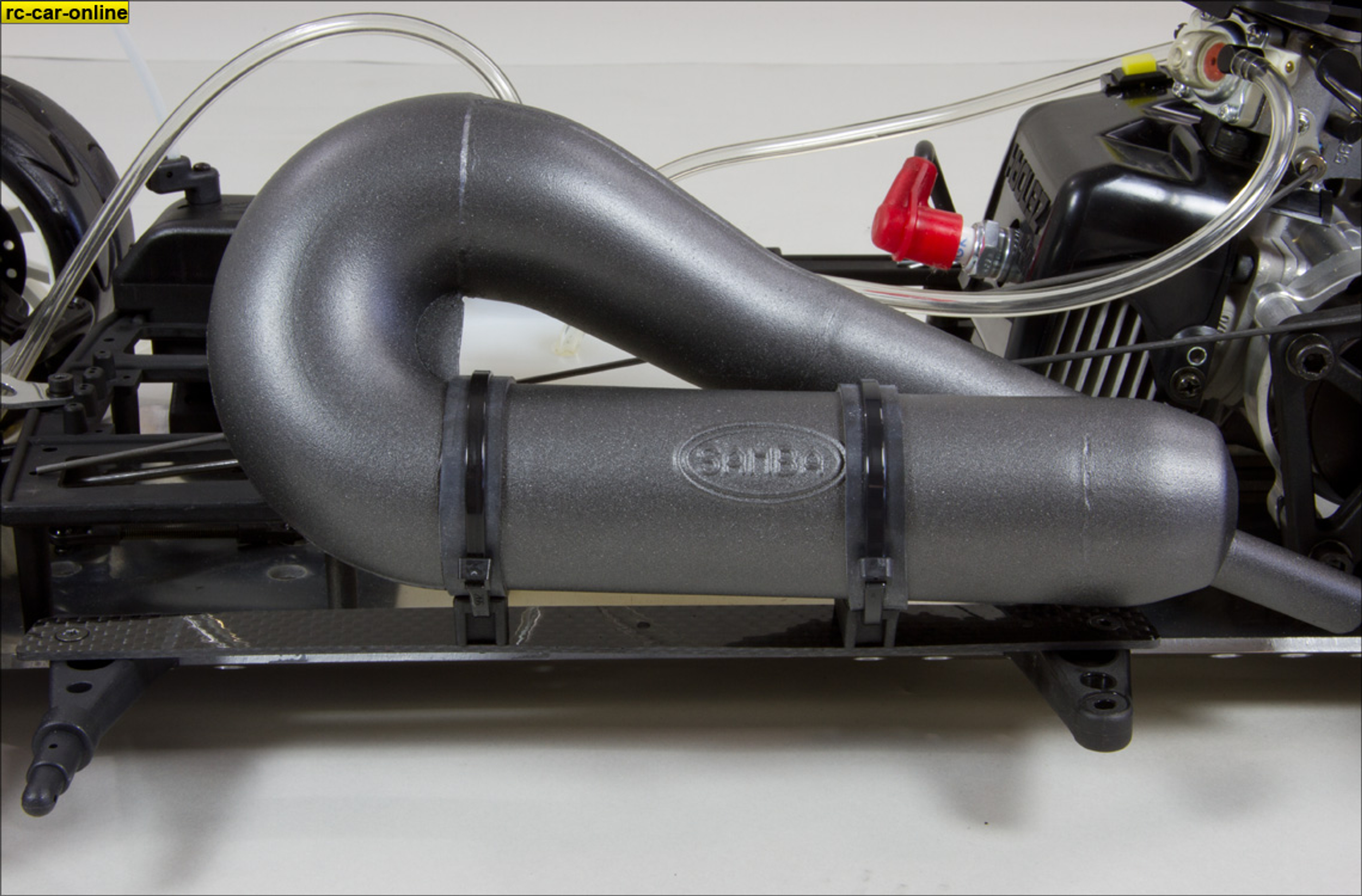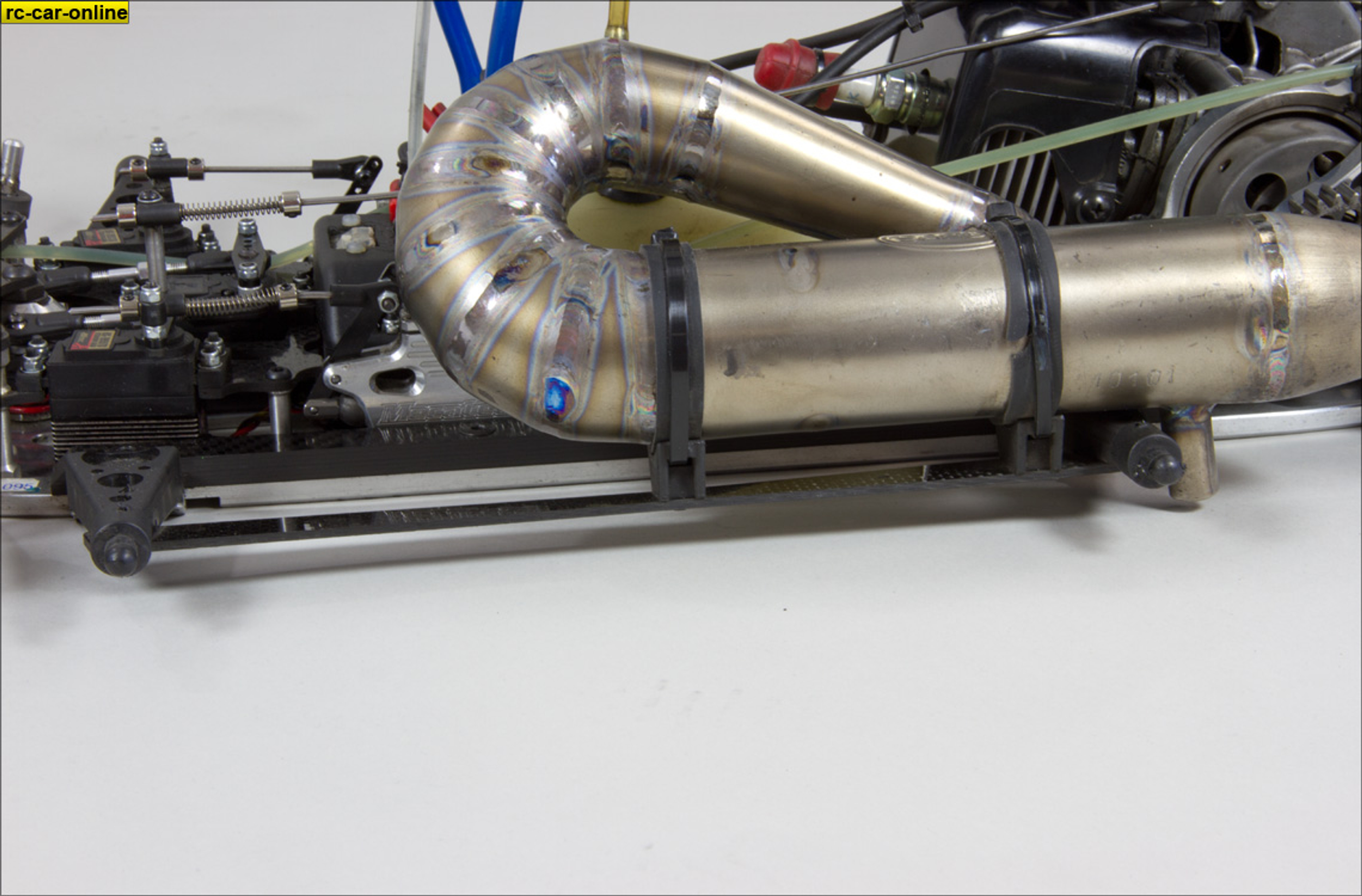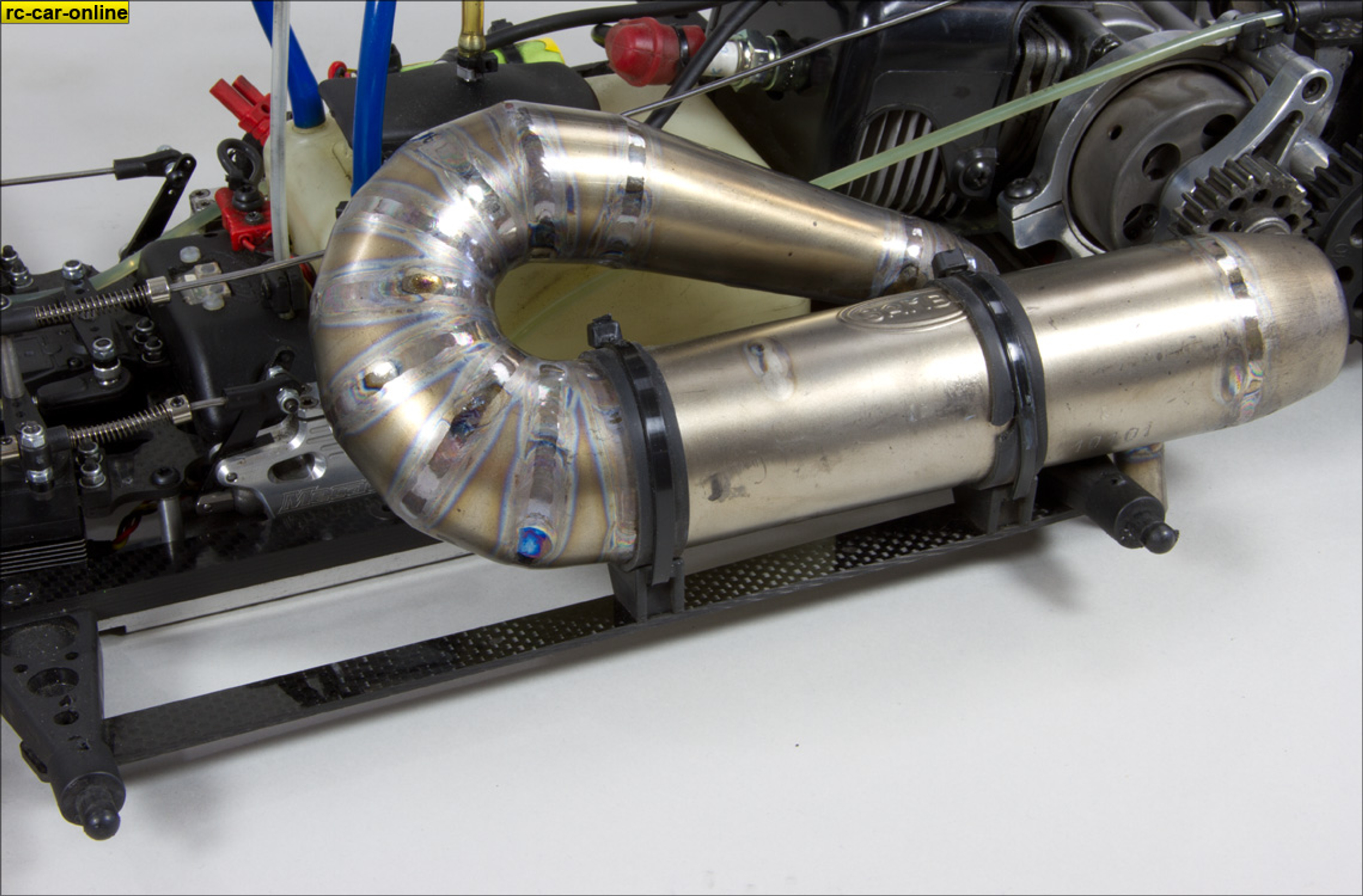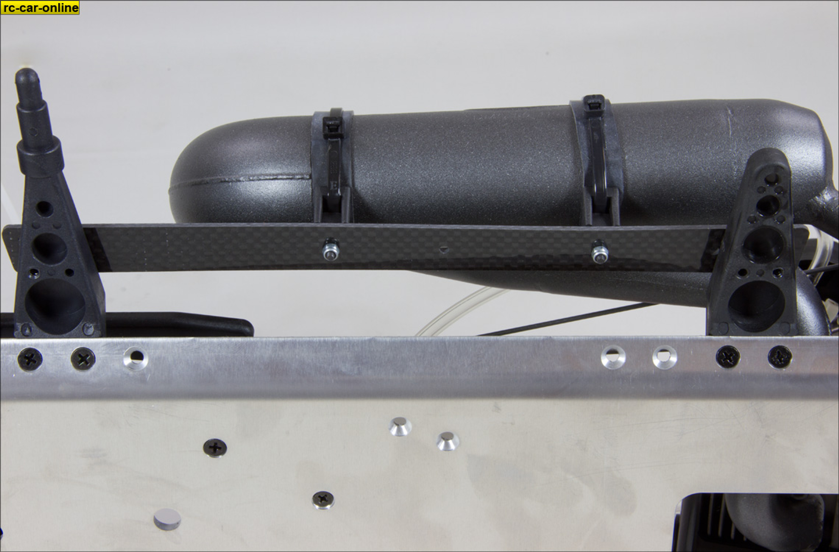 Kohlefaser-Haltestrebe mit Halterungen und Befestigungsmaterial für die FG Competition, EVO und 1:5 Sportsline-Modelle 2WD und 4WD zur seitlichen Befestigung der Resonanz- Schalldämpfer mit einem Durchmesser von ca. 50mm.