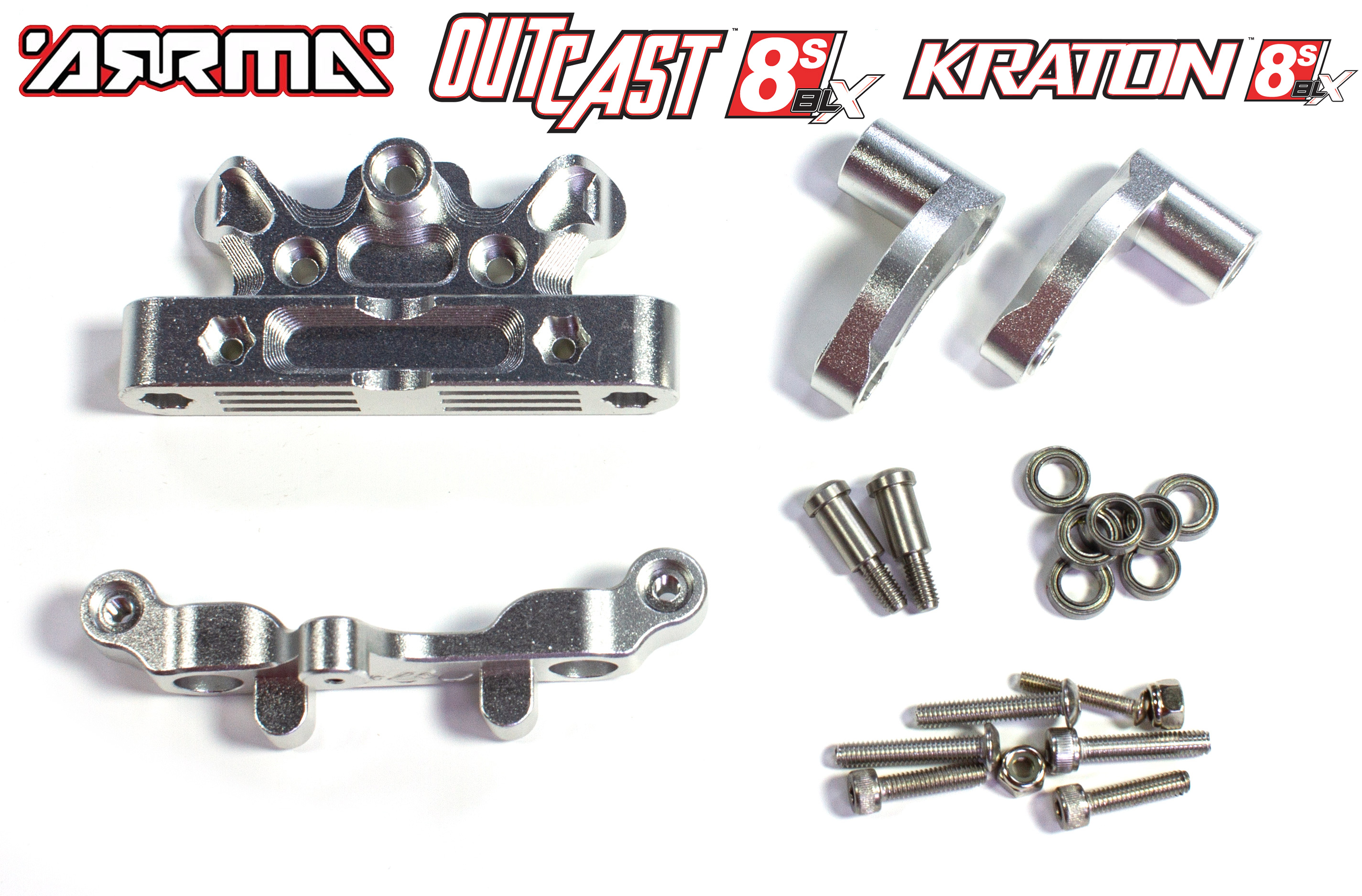 GPM Lenkeinheit für Arrma Kraton/Outcast 8S, CNC-gefräst aus 6061-T6 Aluminium und 8-fach kugelgelagert. Verwindungssteifer, spielärmer und leichtgängiger als die serienmäßigen Kunststoffteile.