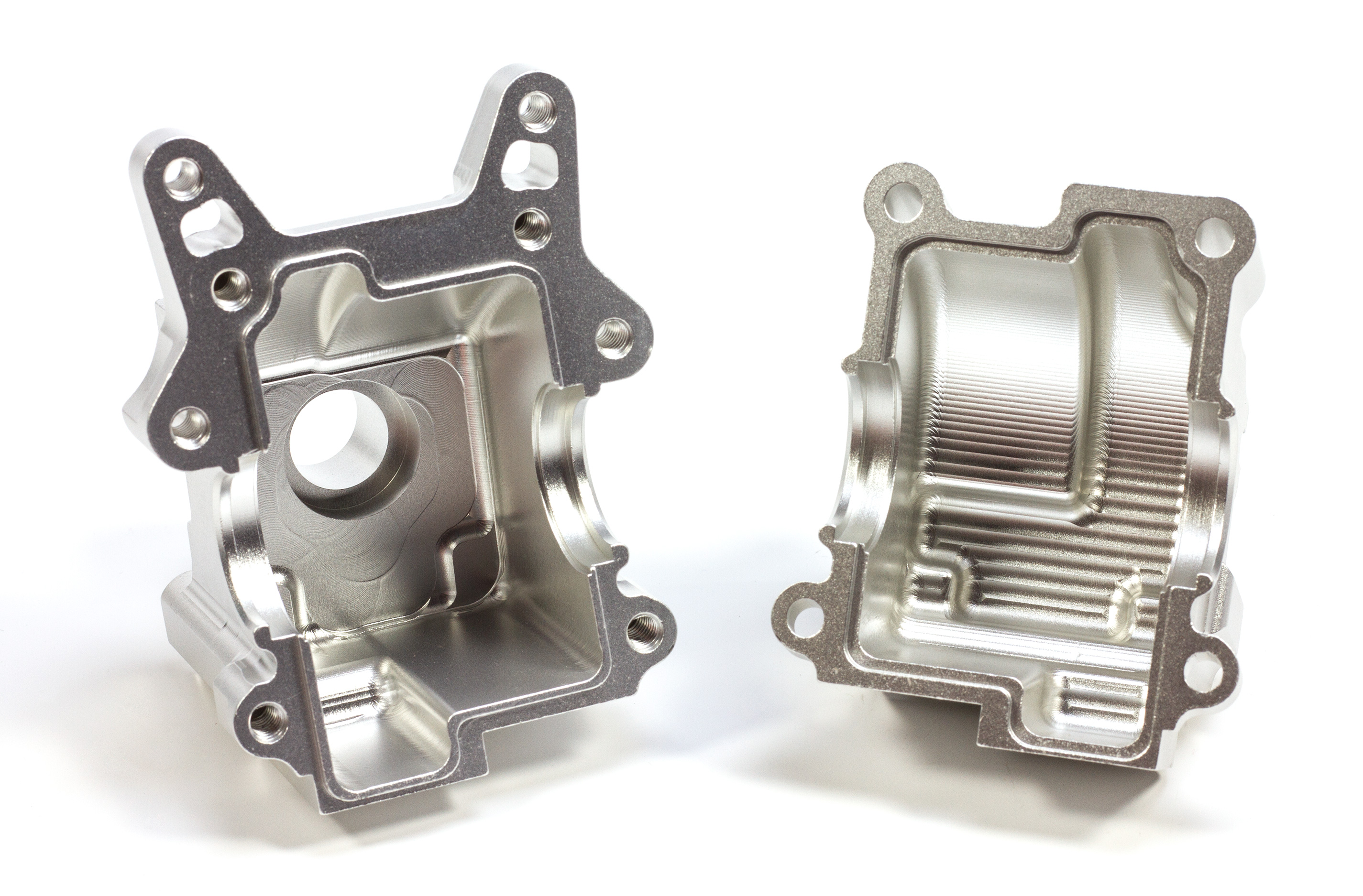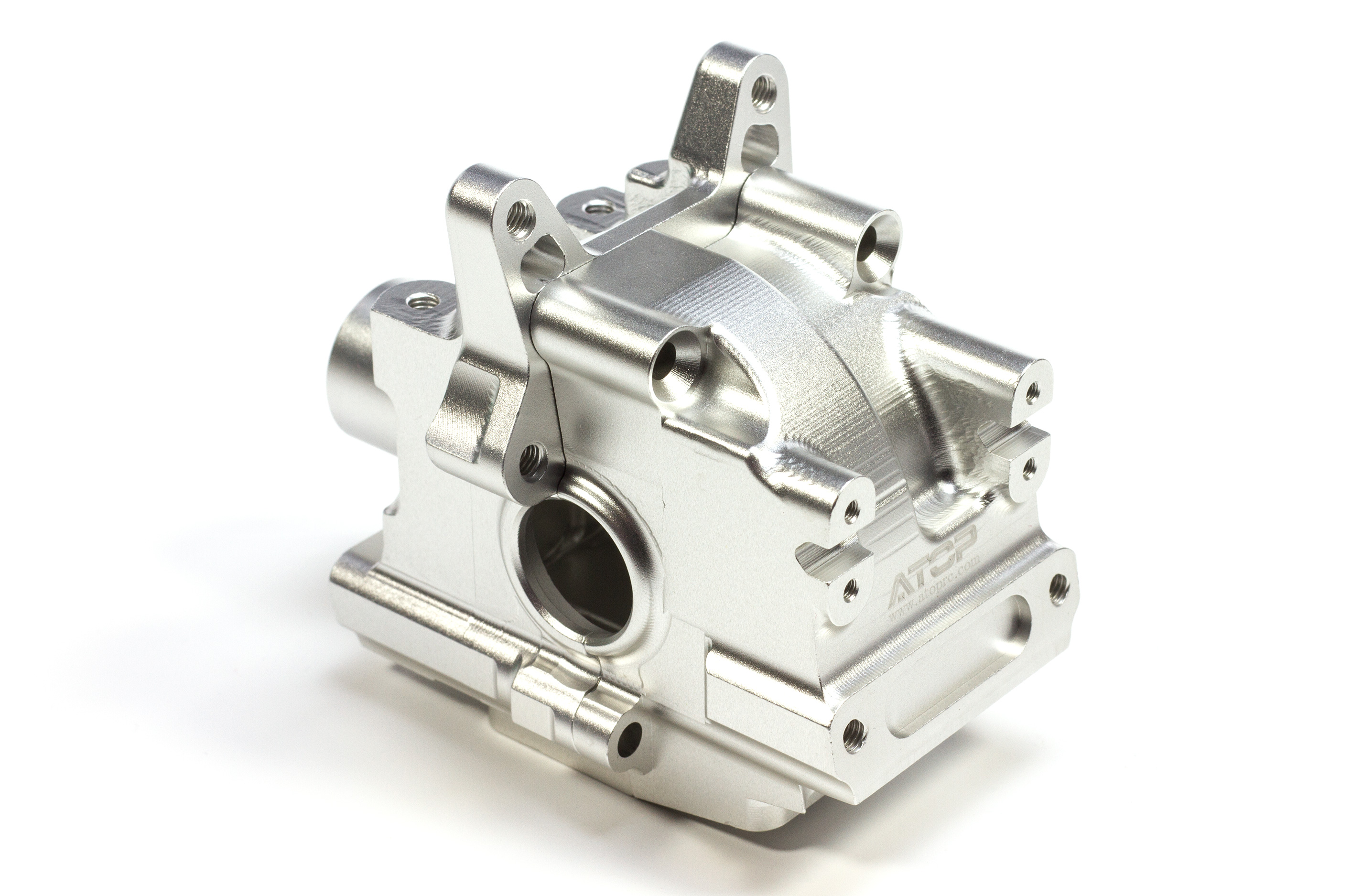 Komplett gefrästes Getriebegehäuse aus 6061-T6 Aluminium für die Vorderachse von Atop. Durch seine Formstabilität ergibt sich eine höhere Belastbarkeit und Lebensdauer von Kegeltrieb und Kugellagern.