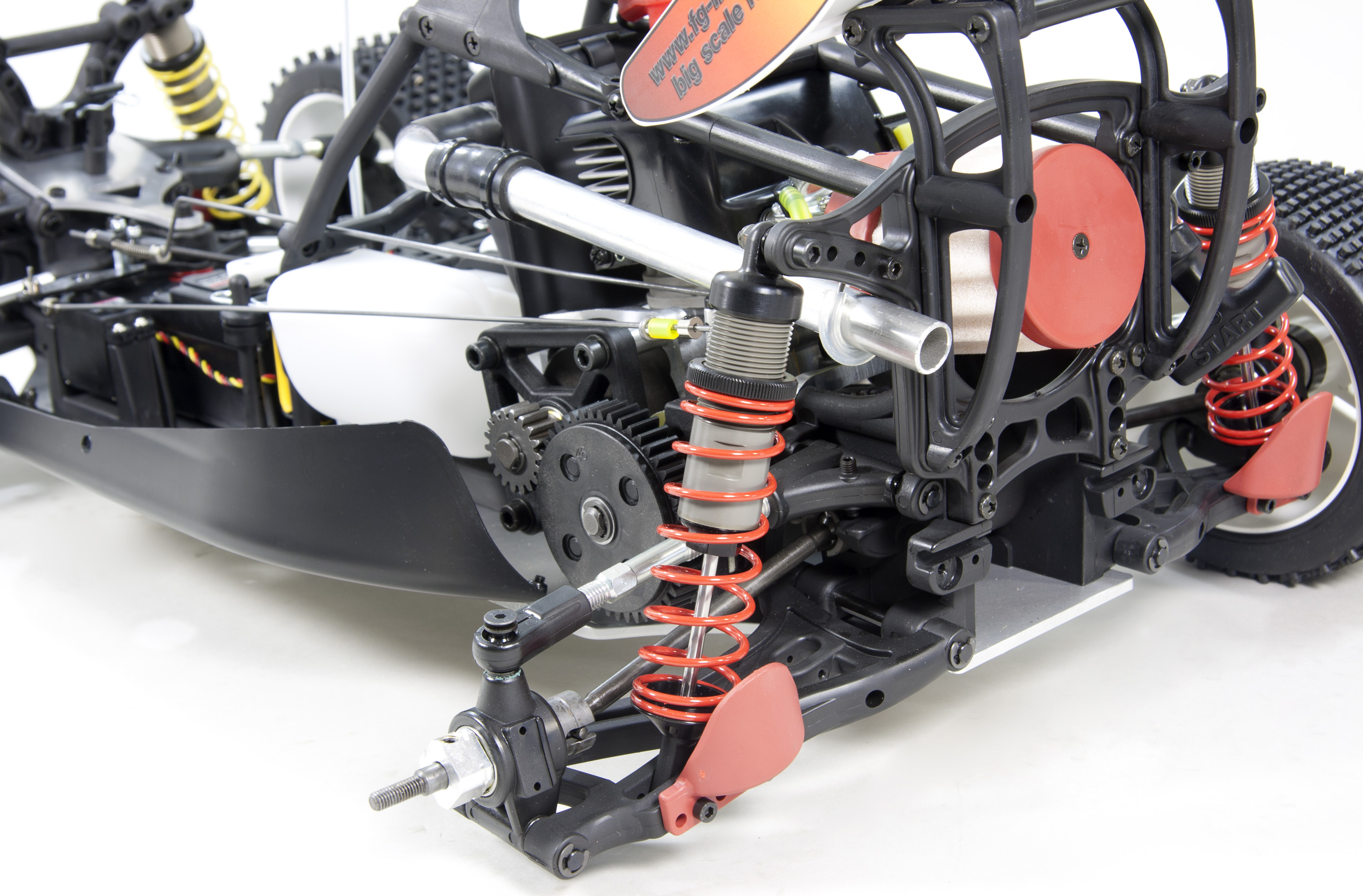 Die Fahrwerksteile sind auf einem 4mm Aluminium-Chassis montiert. Durch die extrem langen Doppel-Querlenker an Vorder- und Hinterachse ergibt sich eine Fahrzeugbreite von 470mm. Der lange Radstand von 530mm sowie die großvolumigen Öldruck-Stoßdämpfer sorgen für ein ausgewogenes Fahrverhalten. Der seitliche Spritzschutz und die weitgehend geschlossene Karosserie verhindern größere Verunreinigungen von Servos, Motor usw.