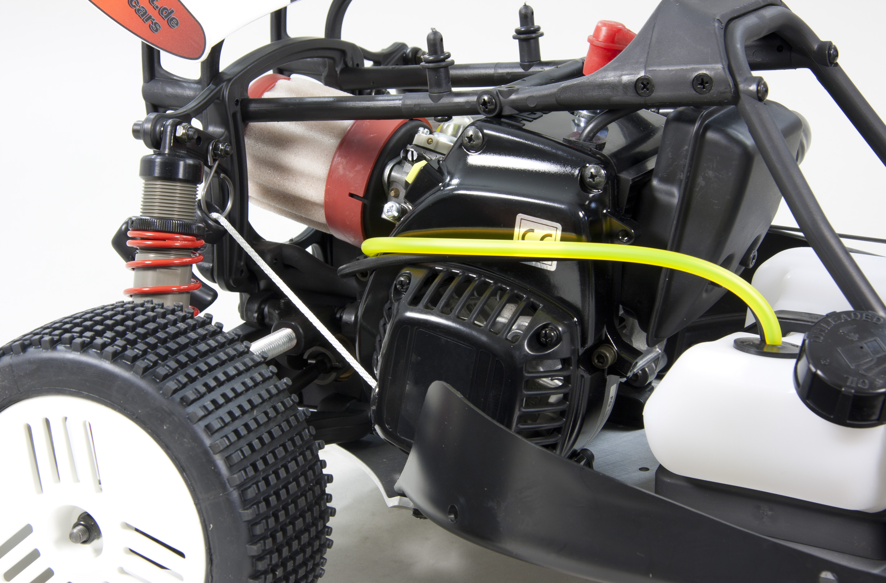 Das Modell ist mit einem leistungsstarken 26 cm³ Verbrennungsmotor mit Schalldämpfer und betriebsfertig eingeöltem Luftfilter ausgerüstet. Dieser benötigt normales 2-Takt-Benzin-Ölgemisch (erhältlich an jeder Tankstelle). Der Tankinhalt von 0,7 Liter ermöglicht eine Fahrzeit von etwa 45 Minuten. Durch die eingebaute Zugstarteinrichtung kann der Motor ohne Fremdstarthilfe problemlos gestartet werden.