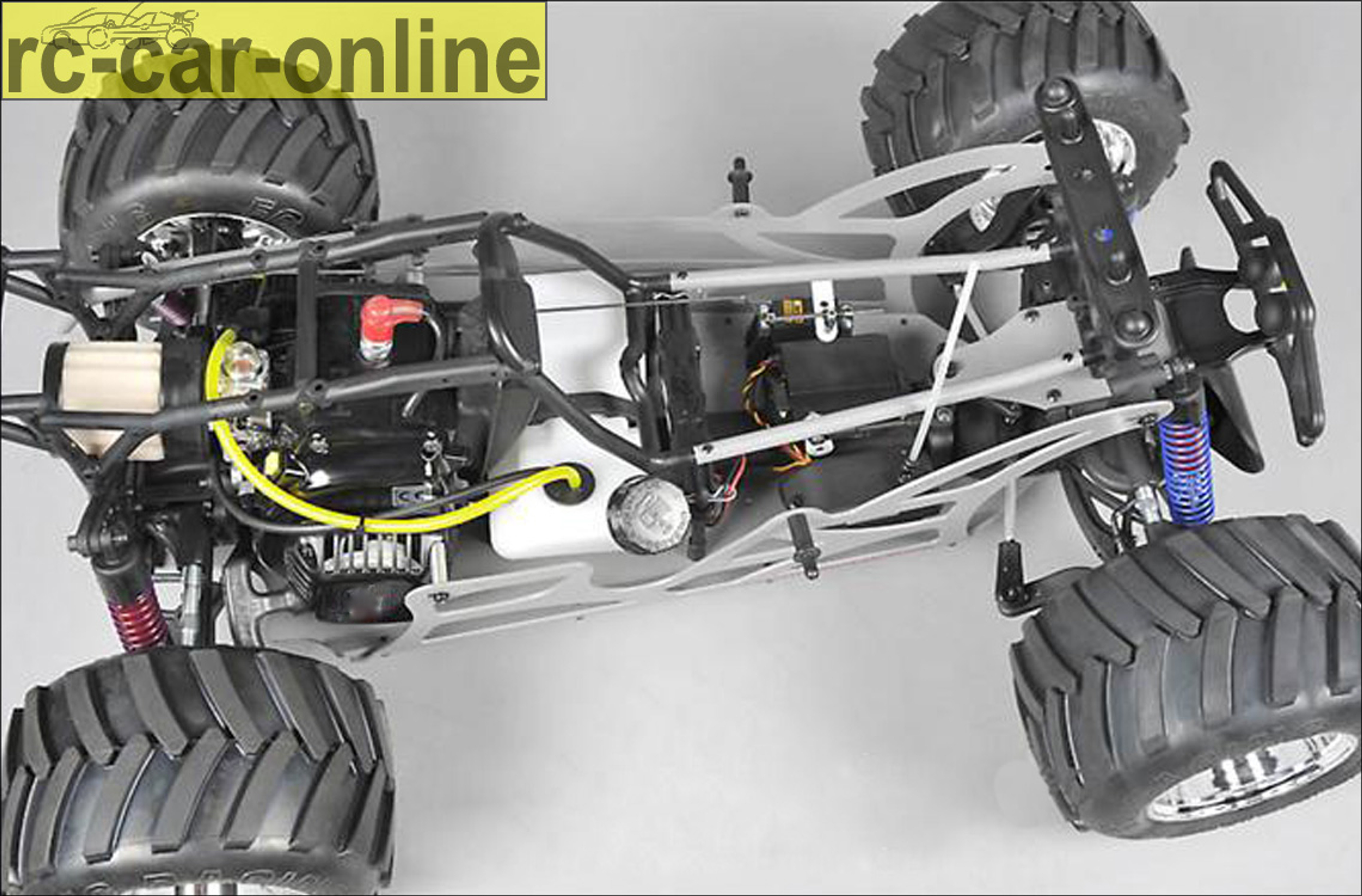Abgewinkeltes 4 mm Alu-Chassis mit abgesenkten Bohrungen an der Unterseite, Allradantrieb über Riemen, Riemenabdeckung, Differentialgetriebe an Vorder- und Hinterachse mit geerdeten Kegel-Zahnrädern, geschlossenes Vorderachsgehäuse, geschlossener Riemenantrieb hinten, einstellbare Doppel-Querlenker an Vorder- und Hinterachse, alle Antriebsteile und Getriebe-Zahnräder aus einsatzgehärtetem Stahl, Servo-Saver einstellbar, 4 Öldruck-Stoßdämpfer einstellbar, Getriebebremse hinten, Alu-Seitenplatinen, Monster-Reifen mit Chromfelgen, gelber oder schwarzer Polycarbonat-Karosserie, Aufklebersatz.