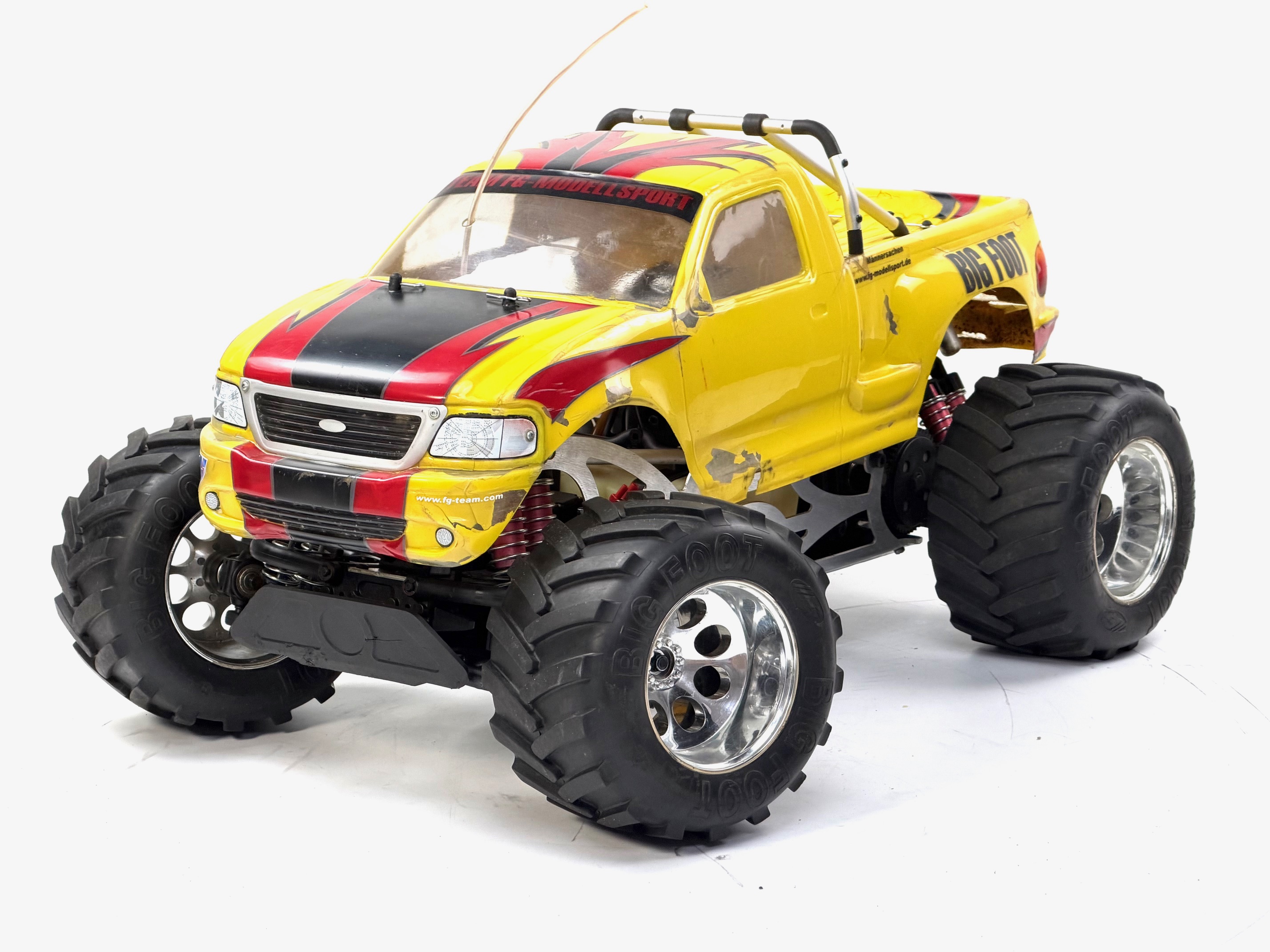 Gebrauchter gut gepflegter FG Monster Truck mit gelb lackierter Karosserie und Überrollbügel.