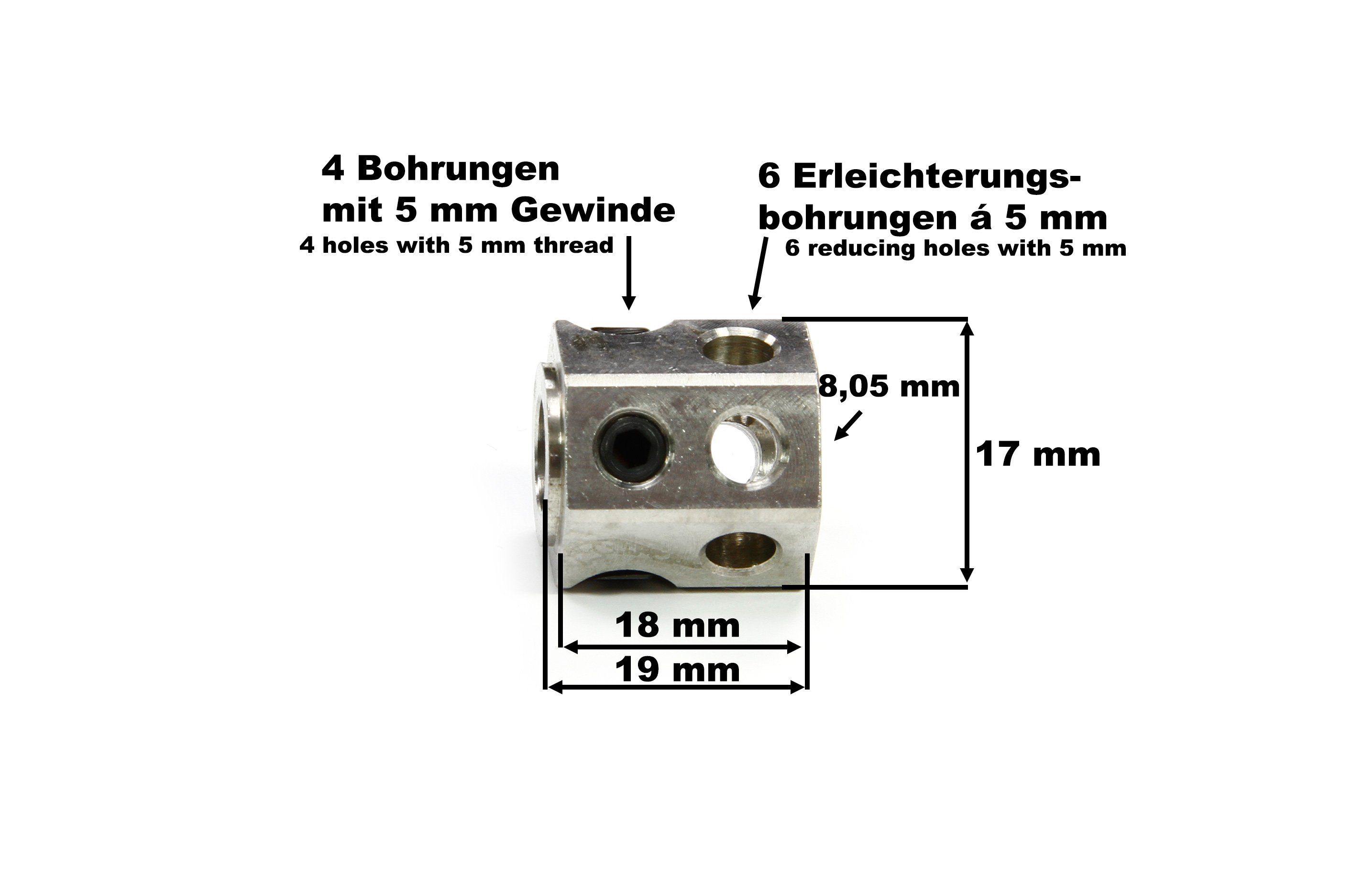 Felgenmitnehmer mit 17 mm Sechskant, 19 mm breit und Bohrung für 8 mm Welle. Gewicht 20 Gramm.
