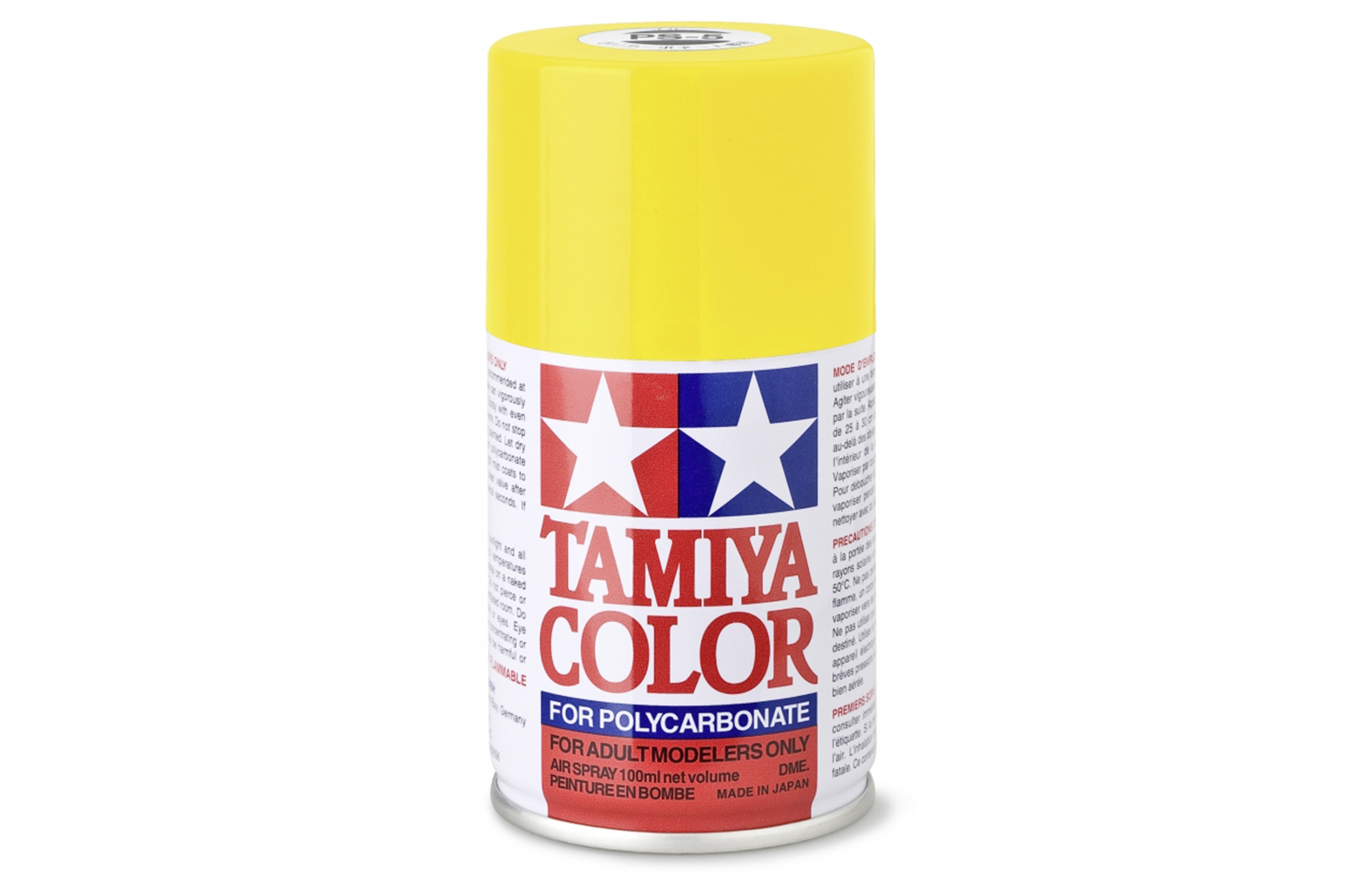 TAMIYA PS = Polycarbonat "Lexan" Sprayfarben sind speziell entwickelt, um unlackierte Bausatzkarosserien zu lackieren. Zahlreiche Farbtöne stehen zur Auswahl und erlauben die individuelle Gestaltung von Modellen. Jede Dose enthält 100 ml hochdeckender Farbe, die Öl- und Kraftstoffresistent sind, dies erlaubt den Einsatz an Nitro-Modellen.