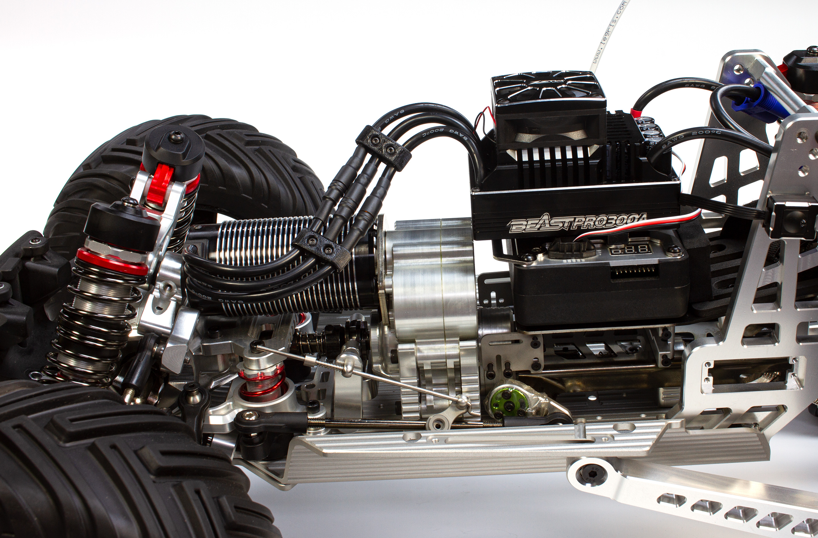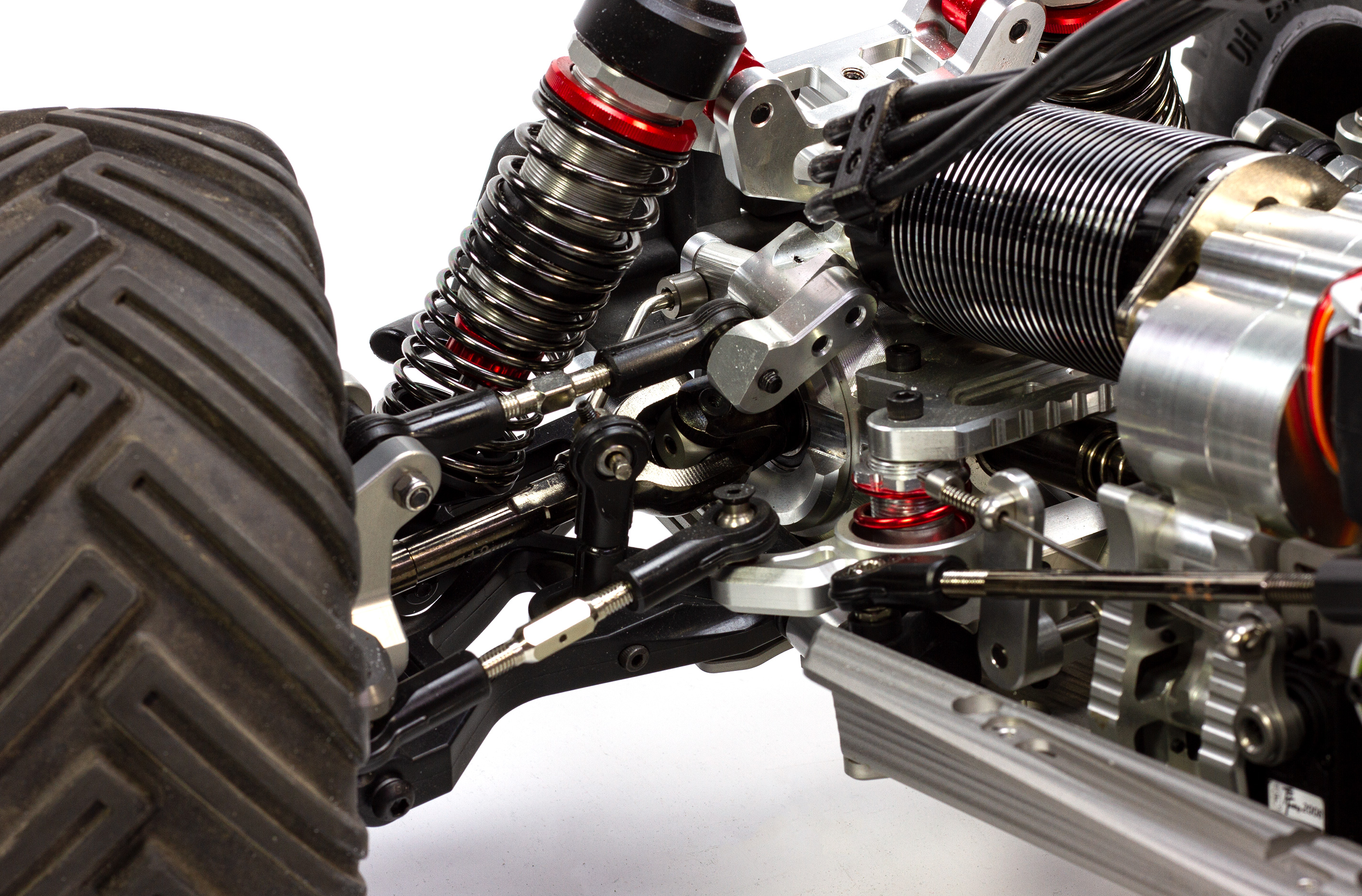 - Die Dimensionierung aller Teile ist auf große Zuverlässigkeit ausgelegt, z.B. sind die Kugelgelenke in den unteren Längslenkern genormte Industrie-Schwenklager mit 6 mm Innendurchmesser und der Antriebsstrang verträgt bei Bedarf 12S ohne Wenn und Aber. Aber nach unseren Erfahrungen ist 12S Betrieb schlichtweg überflüssig. Dennoch bieten wir eine 12S-Ausstattung im Optionsmenu an.