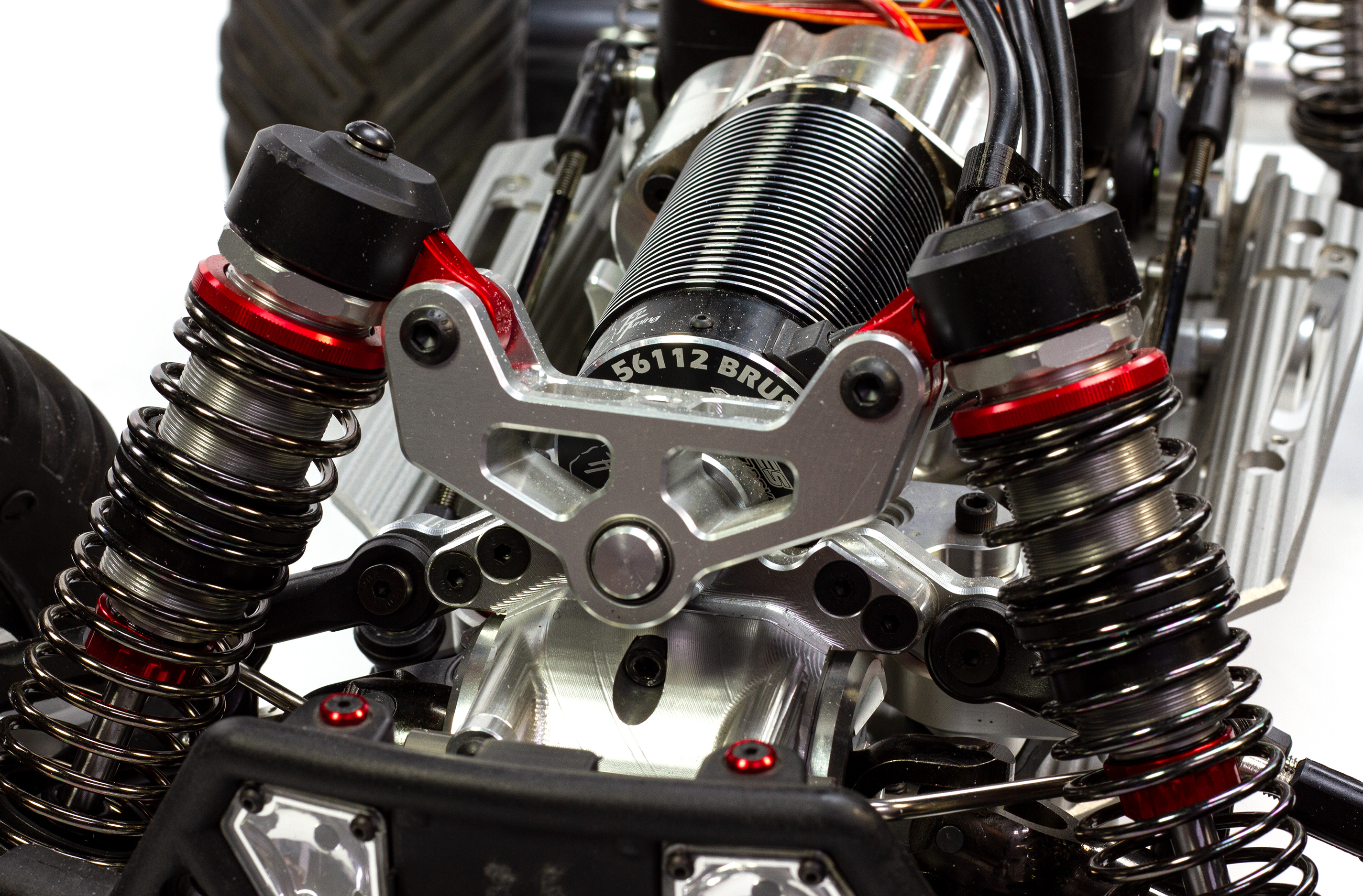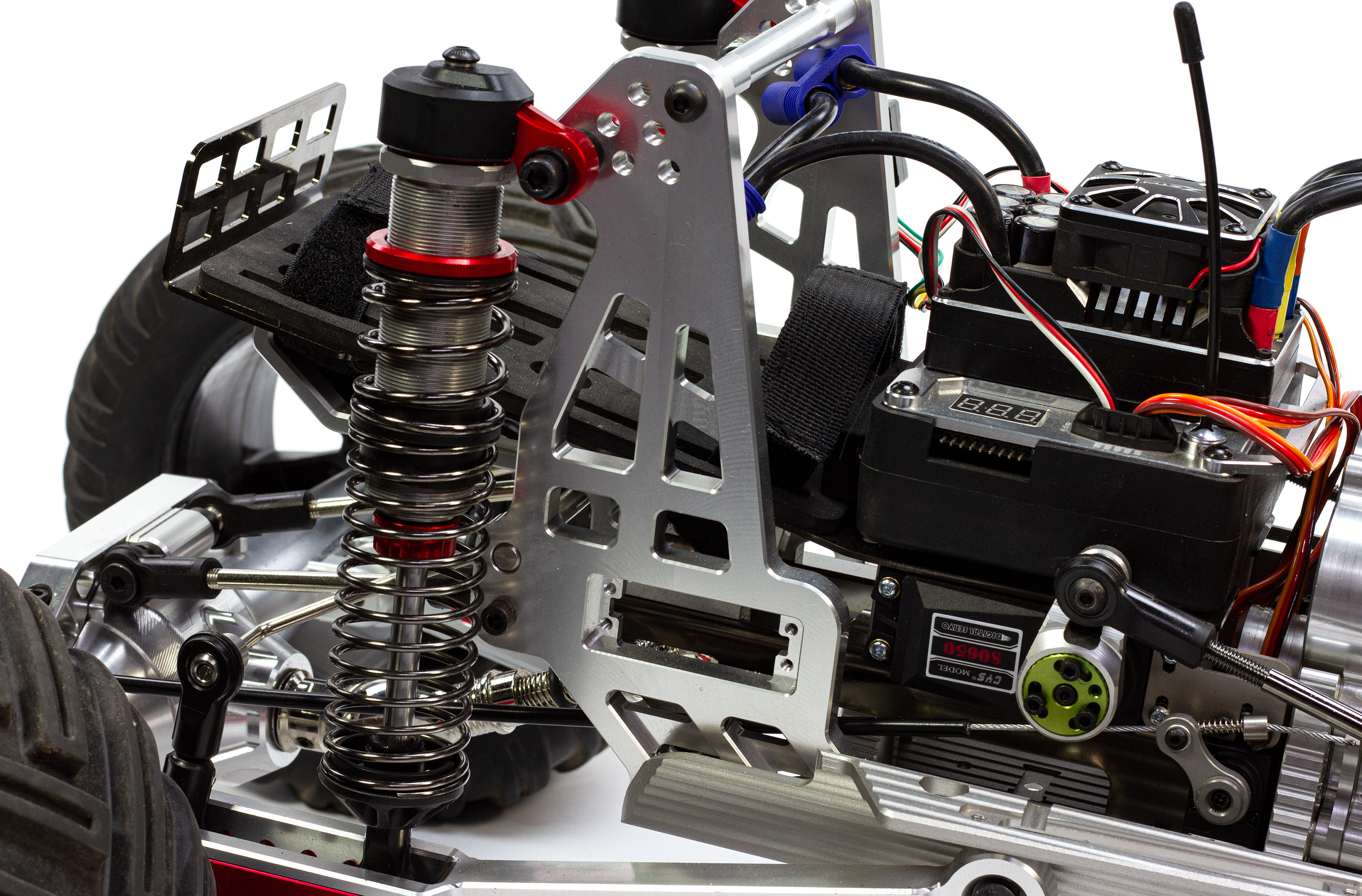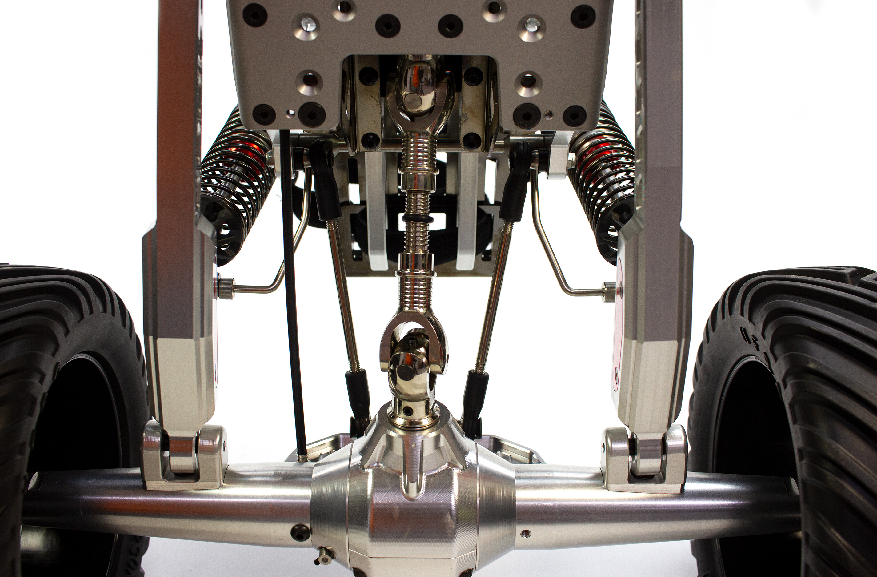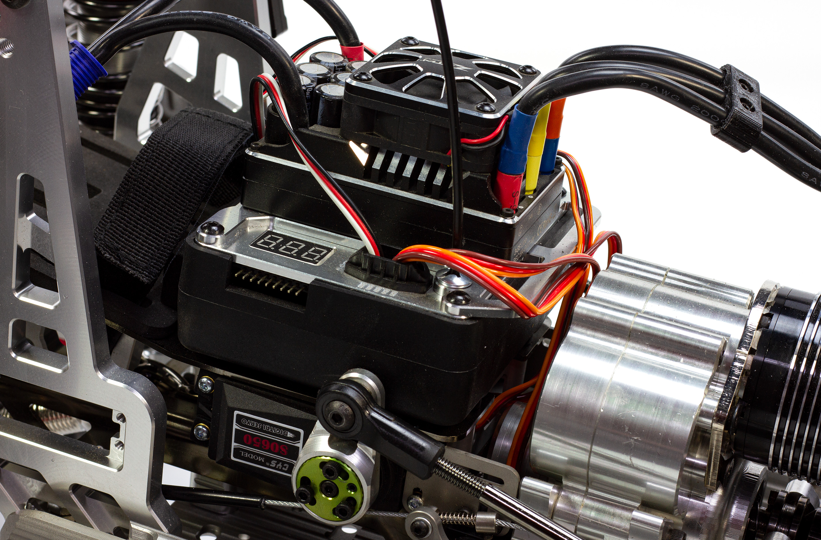 - Die Dimensionierung aller Teile ist auf große Zuverlässigkeit ausgelegt, z.B. sind die Kugelgelenke in den unteren Längslenkern genormte Industrie-Schwenklager mit 6 mm Innendurchmesser und der Antriebsstrang verträgt bei Bedarf 12S ohne Wenn und Aber. Aber nach unseren Erfahrungen ist 12S Betrieb schlichtweg überflüssig. Dennoch bieten wir eine 12S-Ausstattung im Optionsmenu an.