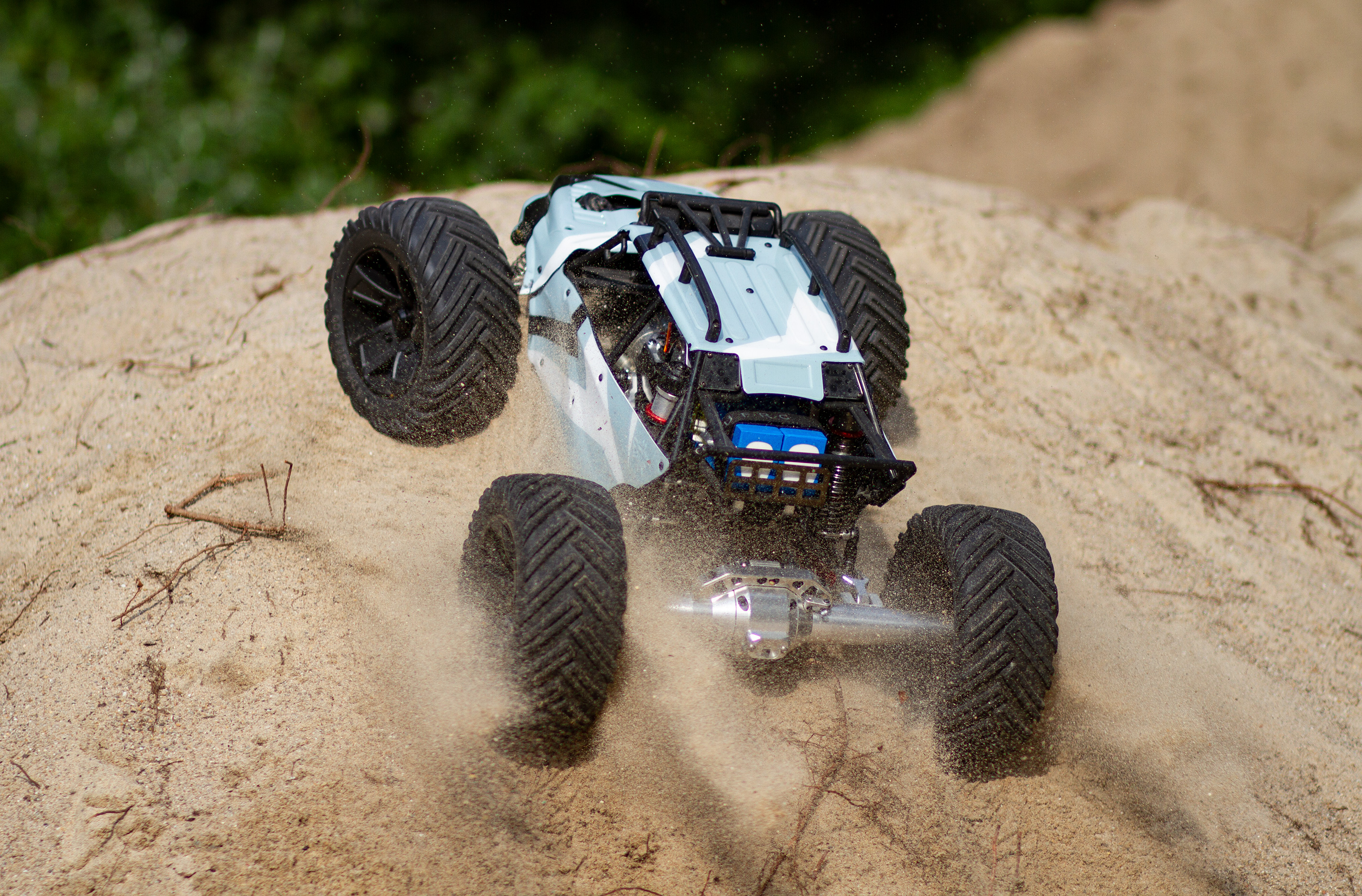 - Seine äußeren Abmessungen sind kaum größer als die eines 1:6er, dabei ist sein Radstand jedoch auf dem Level vieler 1:5er und er hat keine Überhänge, seine Reifen passen zu einem Monstertruck (230 mm Durchmesser!). Daraus resultiert eine für Großmodelle erstaunliche Handlichkeit in Verbindung mit überragender Geländegängigkeit.