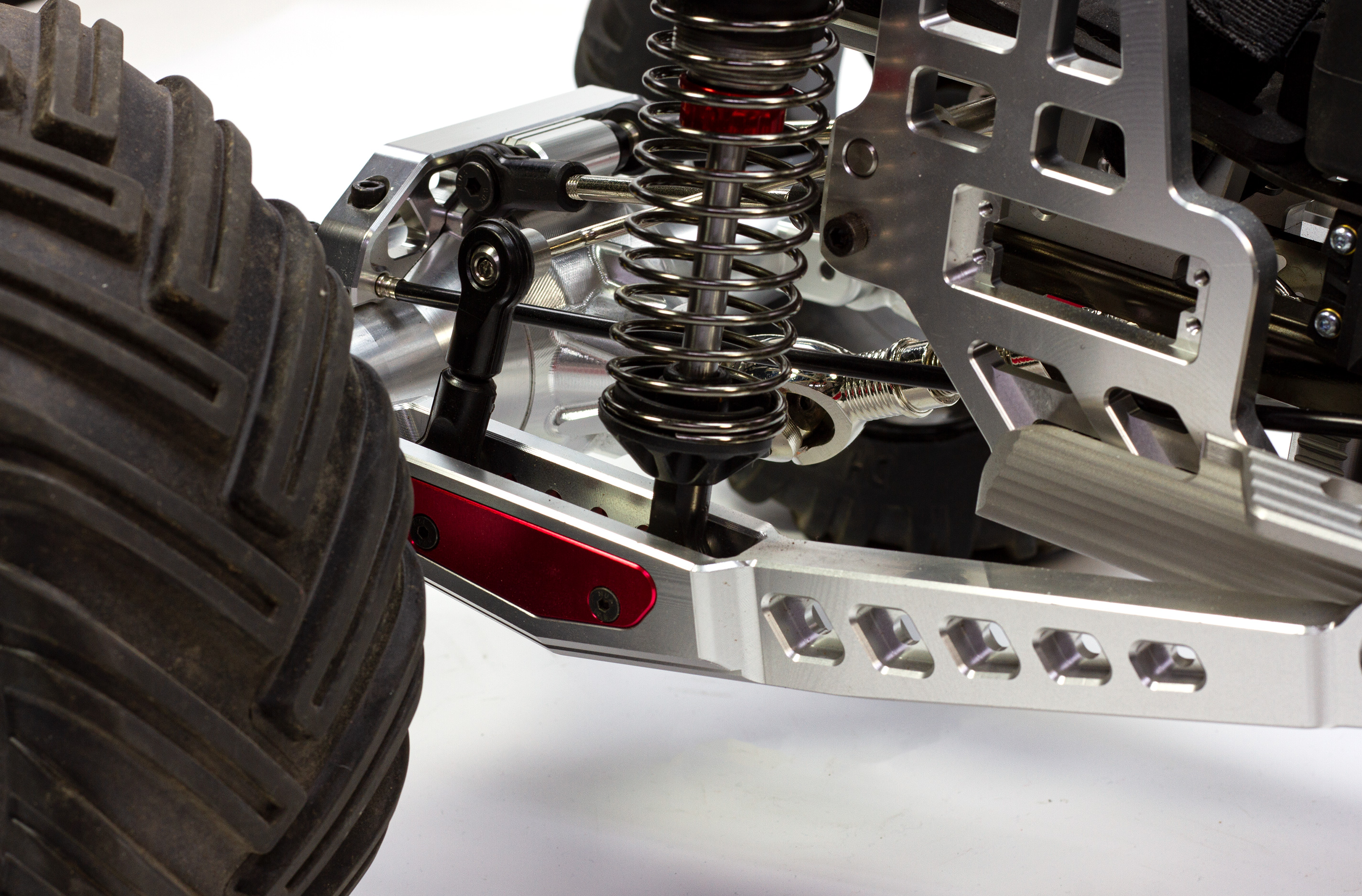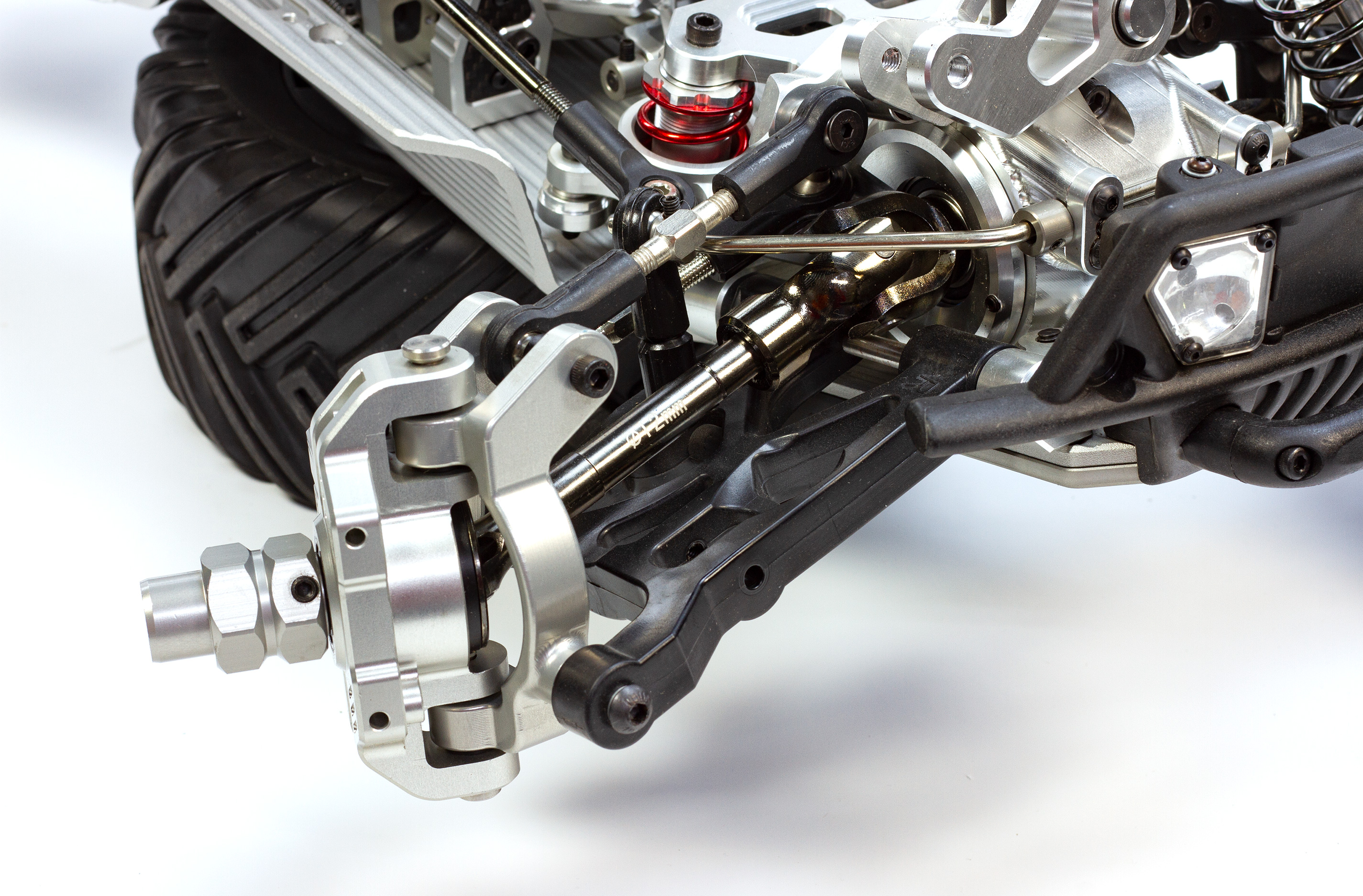 - Die Dimensionierung aller Teile ist auf große Zuverlässigkeit ausgelegt, z.B. sind die Kugelgelenke in den unteren Längslenkern genormte Industrie-Schwenklager mit 6 mm Innendurchmesser und der Antriebsstrang verträgt bei Bedarf 12S ohne Wenn und Aber.