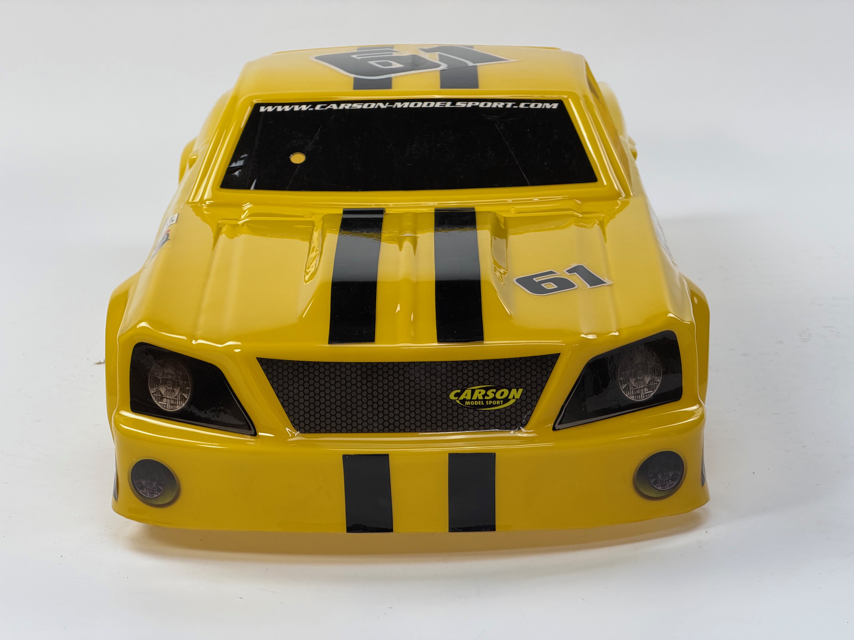 Original Carson/Smartech Artikel.Leider hat die Karosserie im Heckbereich einen Riss und wird deshalb als gebraucht verkauft.Die linke Seitenscheibe ist zur besseren Belüftung ausgeschnitten.Dieser Riss kann aber mit Karosseriekleber y0565 repariert werdenSiehe Fotos.Die aufgeklebten Streifen bei den Karosserien nicht besonders sorgfältig verklebt und sollten individuell nachgearbeitet werden, wenn man darauf Wert legt. Die Karosserie wurde aus 2 mm dickem Lexan tiefgezogen.MaßeLänge: 890 mmBreite: 392 mmHöhe: 220 mmBenötigte Karosserieträger:Frontteil: FG 7020/16 FrontrammerHeckträger: FG 7152/01 Karosserieauflage hintenSeite Front: FG 3014 KarosseriehalterSeite Heck: FG 3014 Karosseriehalter