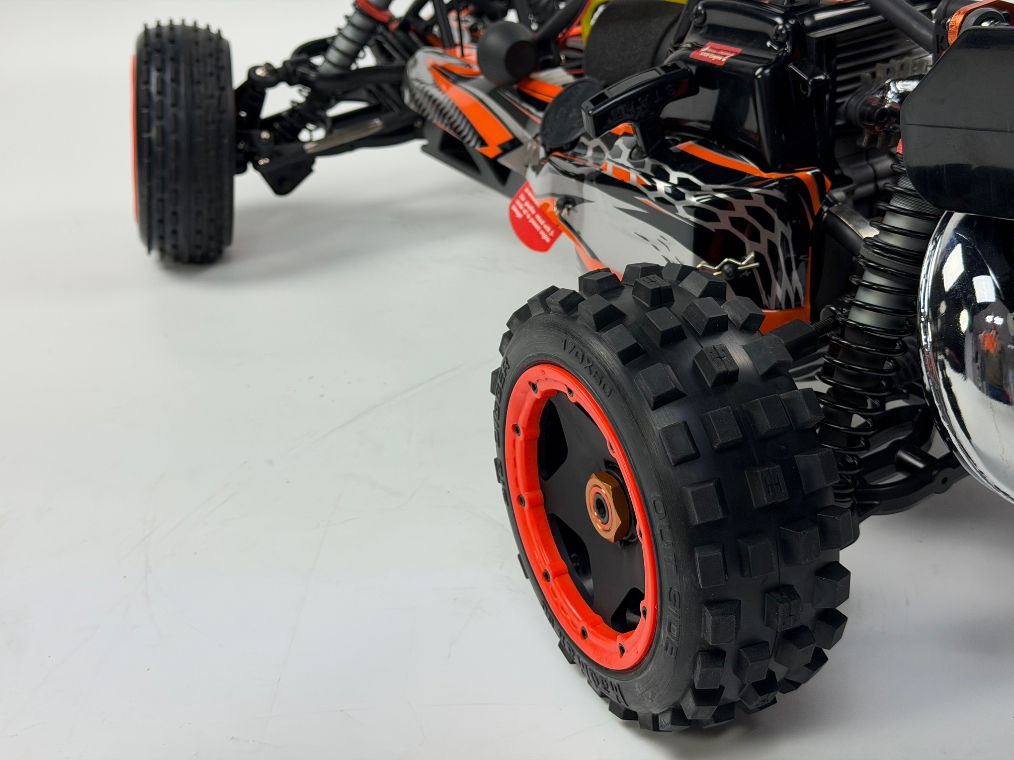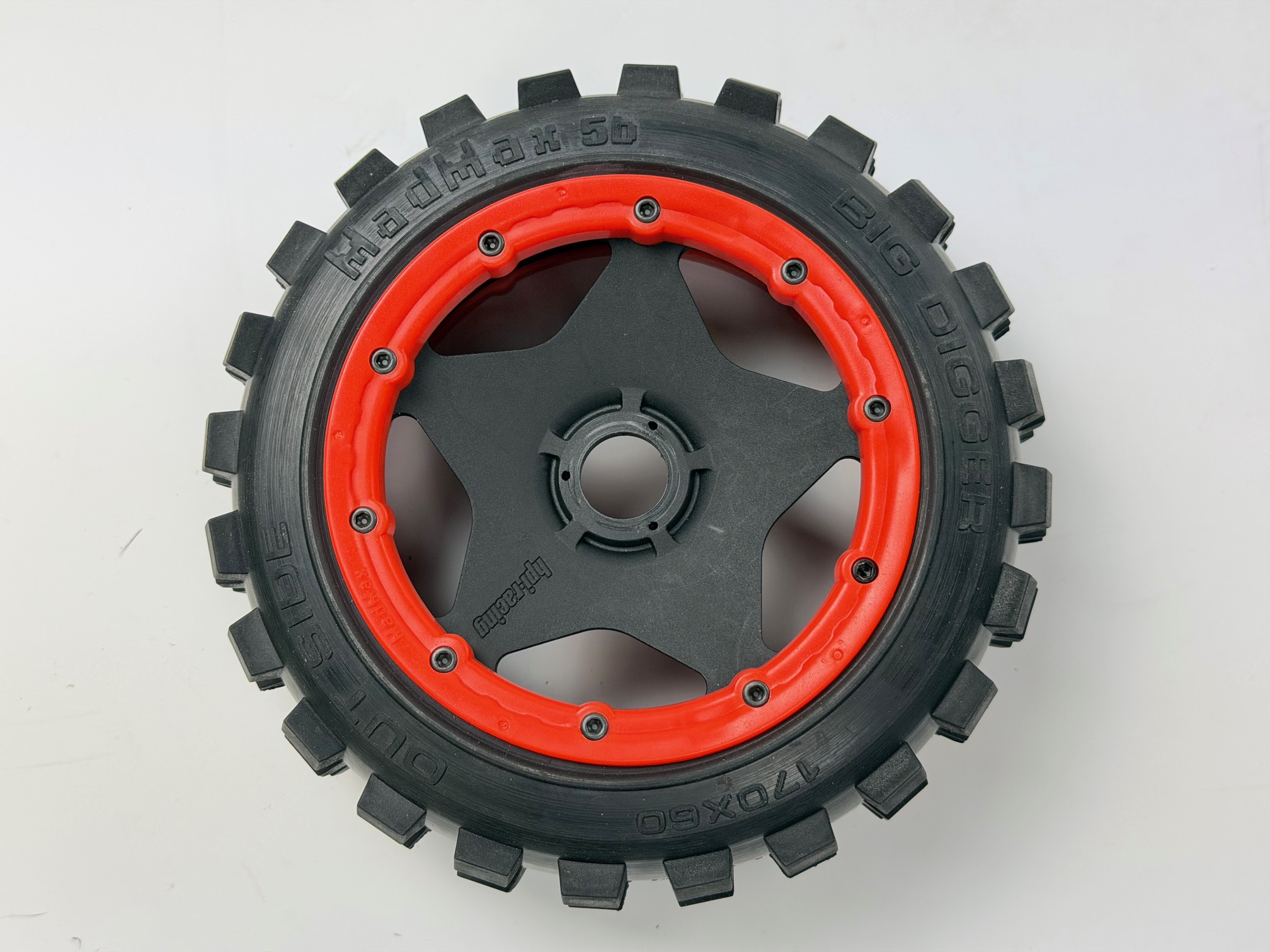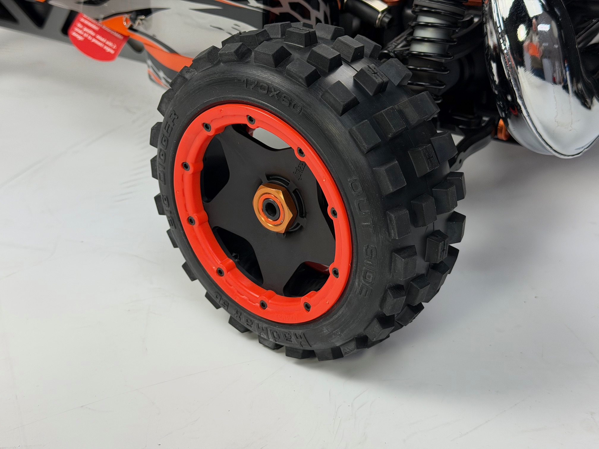 BIG DIGGER 170x60 mit schwarzen HPI Felgen 20-fach verschraubt, mit 24 mm 6-Kant-Aufnahme und verstärkten orangenen Felgenringen für Losi, HPI, Carson und viele mehr. .
