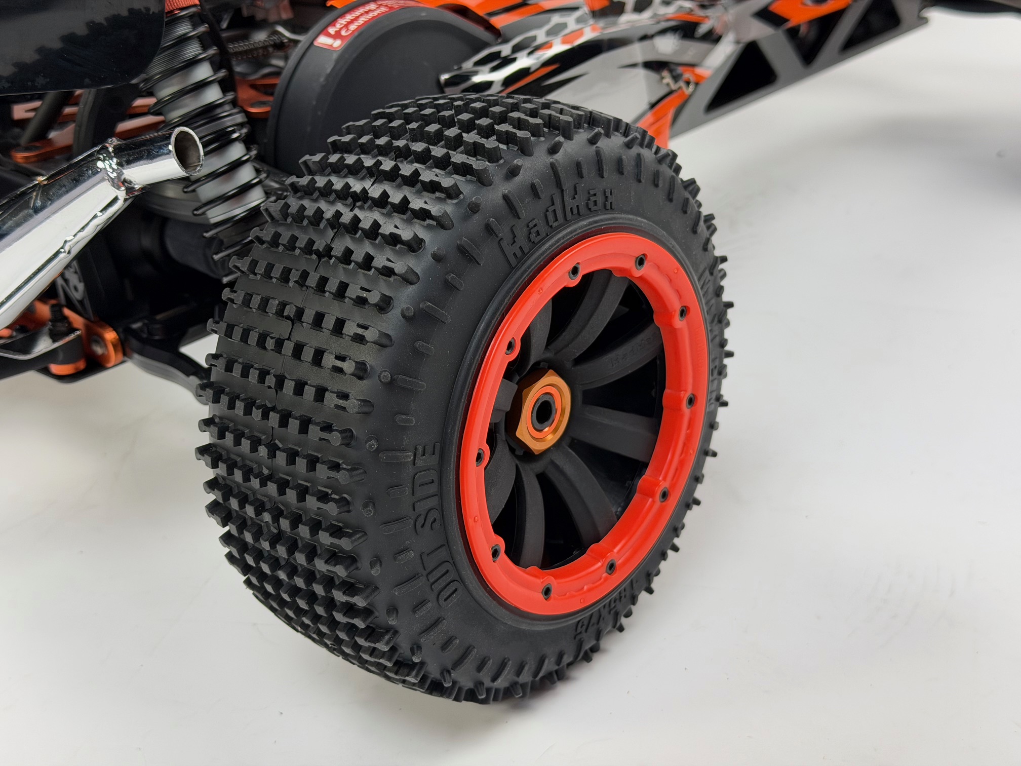 Die 3-teiligen 80 mm MadMax Felgen sorgen für perfekten Sitz des Reifens auf der Felge. So wird kein Klebstoff benötigt um den Reifen zu fixieren und die Felge kann immer wieder mit neuen Reifen verwendet werden.