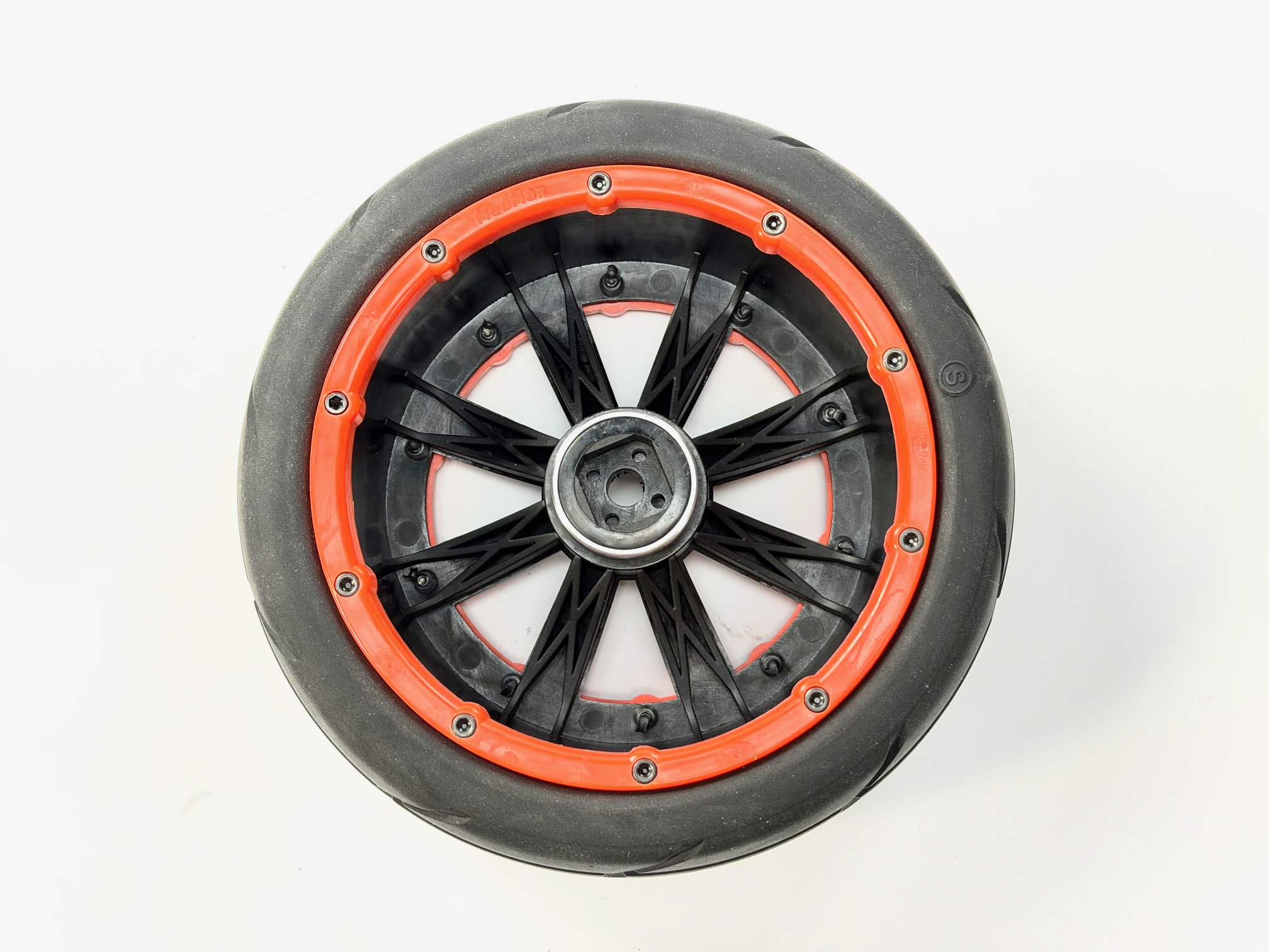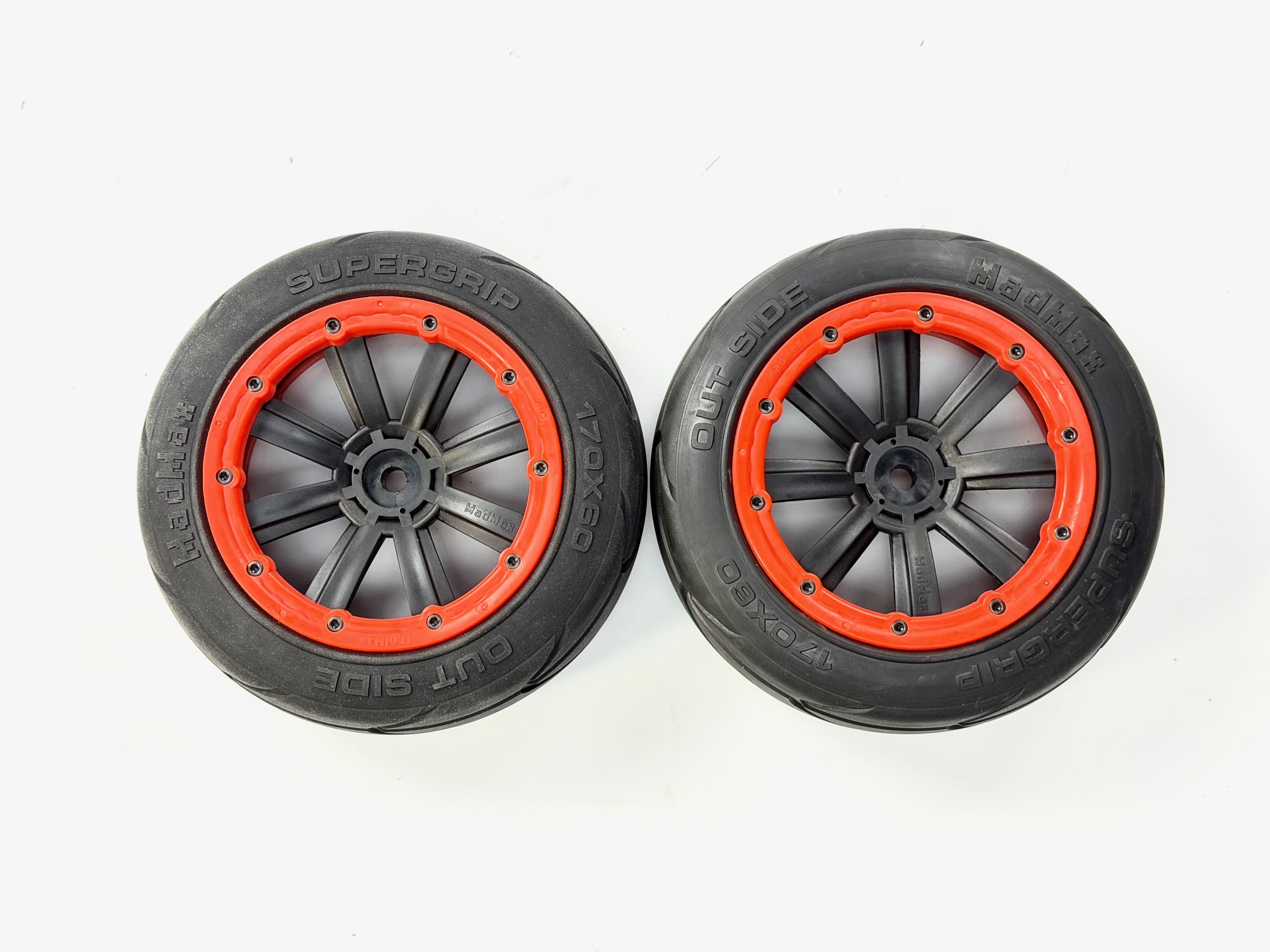 SUPER GRIP Medium Reifen 170 x 60 mm mit schwarzen MadMax Extreme Felgen 20-fach verschraubt mit 18 mm Vierkant-Aufnahme und orangenen verstärkten Felgenringen für FG, Smartech und viele weitere Modelle.
