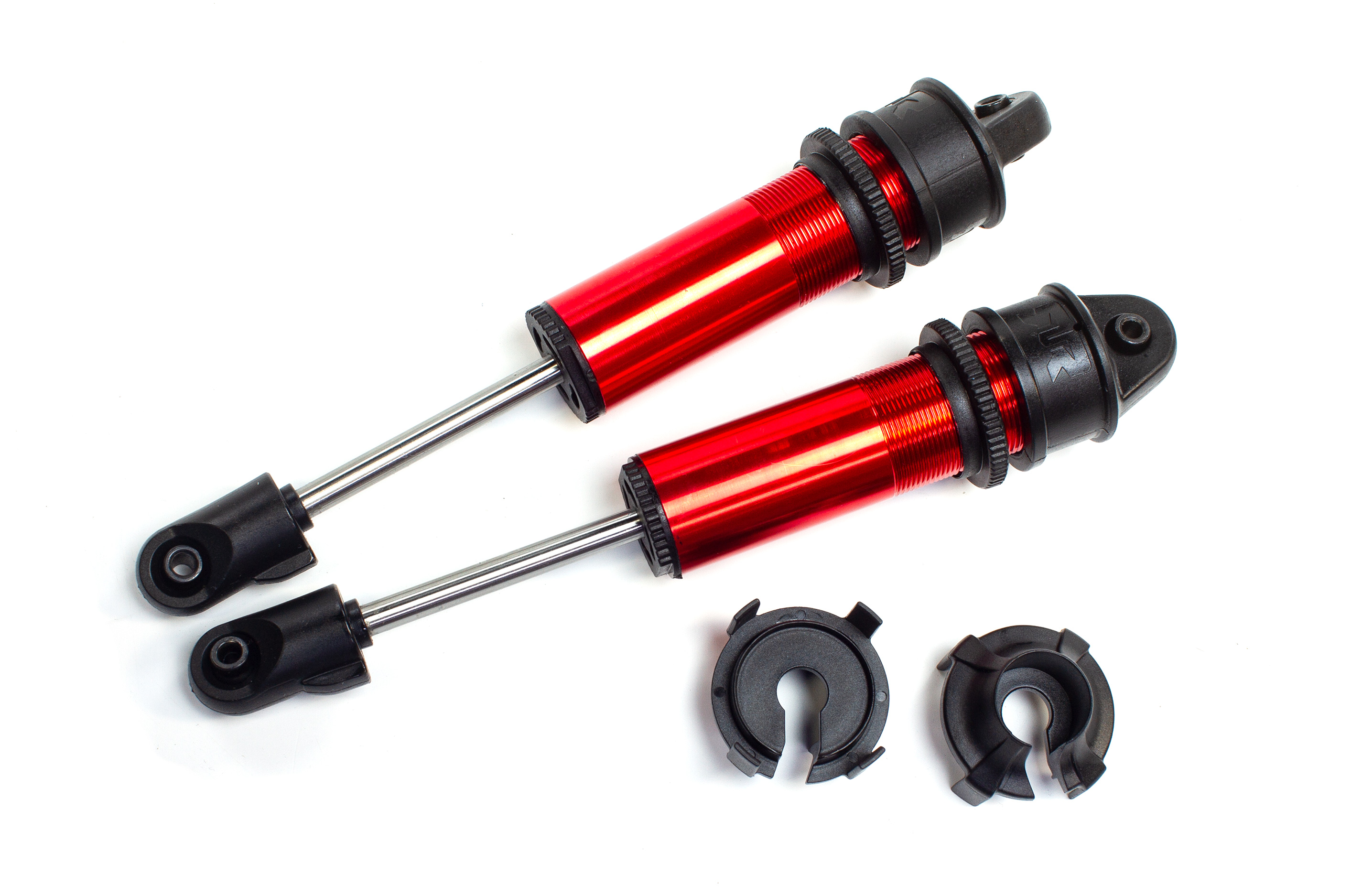 Präzisionsgefertigte rot eloxiertem Aluminium Gehäuse - Glatt polierte Edelstahl Kolbenstangen - Tough Composite-Formteile - Geliefert montiert ohne Federn - Mit 6 mm dicken Kolbenstangen und schweren Stangenenden für großartige Haltbarkeit - Vorgefüllt mit 700 cSt Silikonöl - Geliefert mit 8 Loch 1,4 mm Kolben ausgestattet - Montagefertig nach Aufsetzen der gewünschten Federn - Einsteller mit Gewinde für die Federvorspannung zur Feinabstimmung der Fahrhöhe enthalten