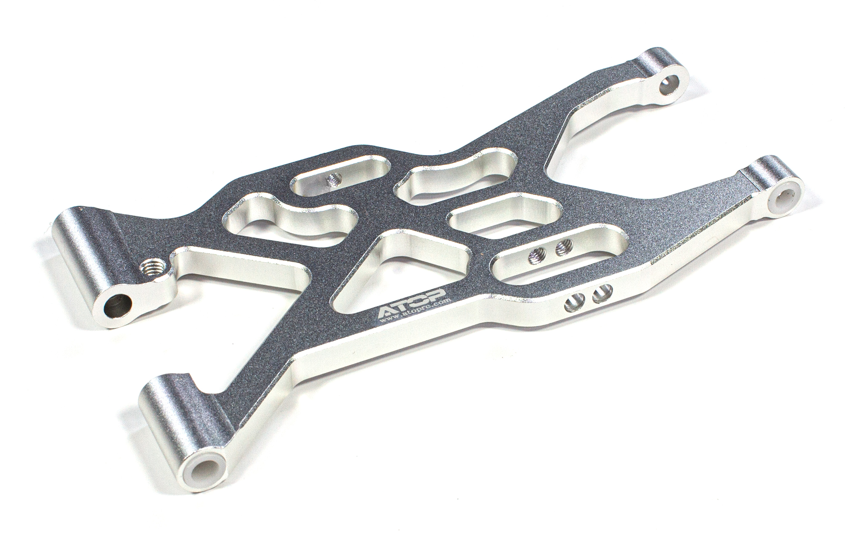 Besonders leichte (119 Gramm/Stück), CNC-gefräste Querlenker für die Losi 5ive-T Hinterachse aus 6061-T6 Aluminium von ATOP. Die Querlenker sind chassisseitig breiter als die Serienteile, um das hohe Spiel in Längsrichtung an dieser Stelle auf ein sinnvolles Maß zu reduzieren.