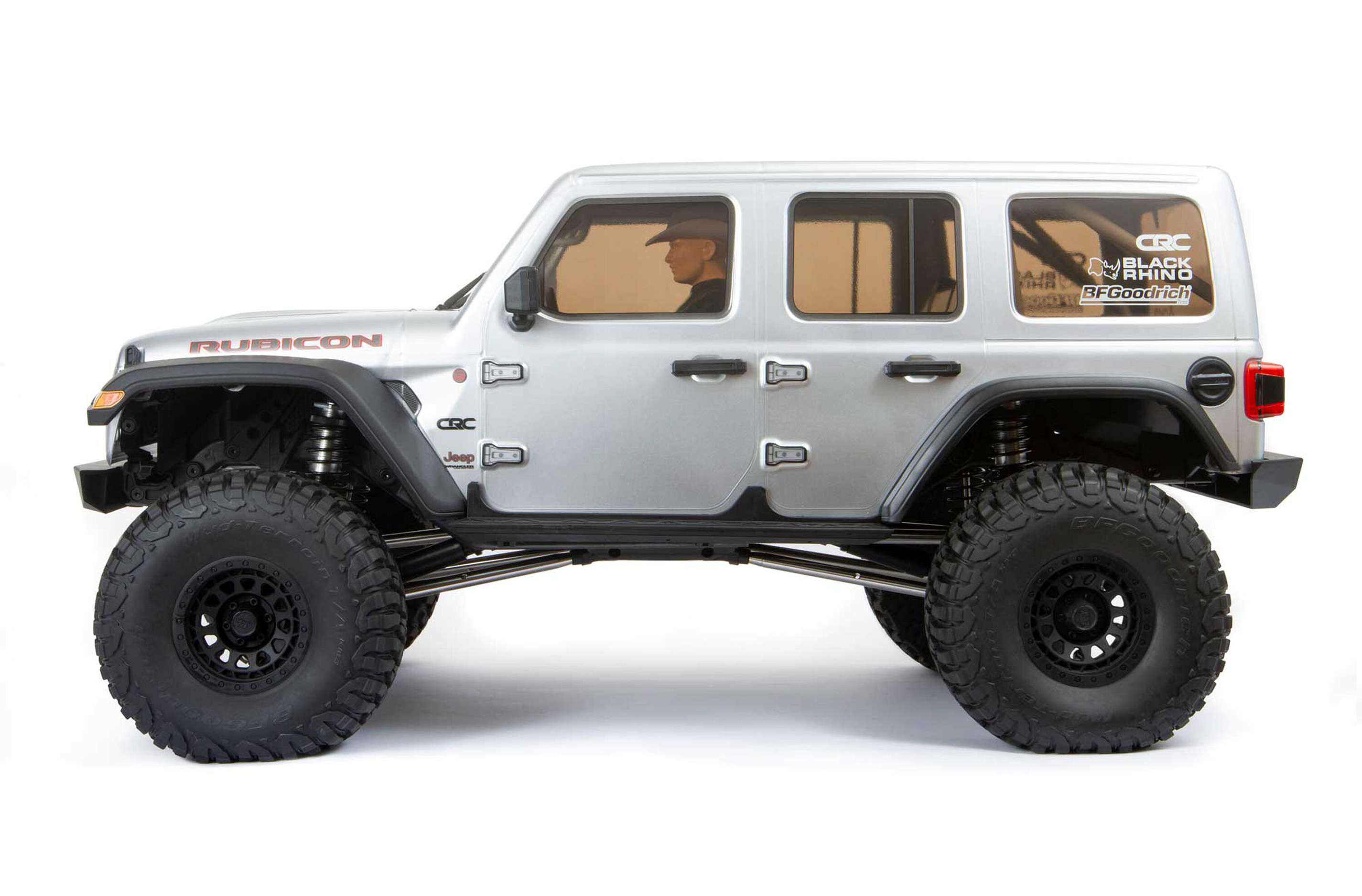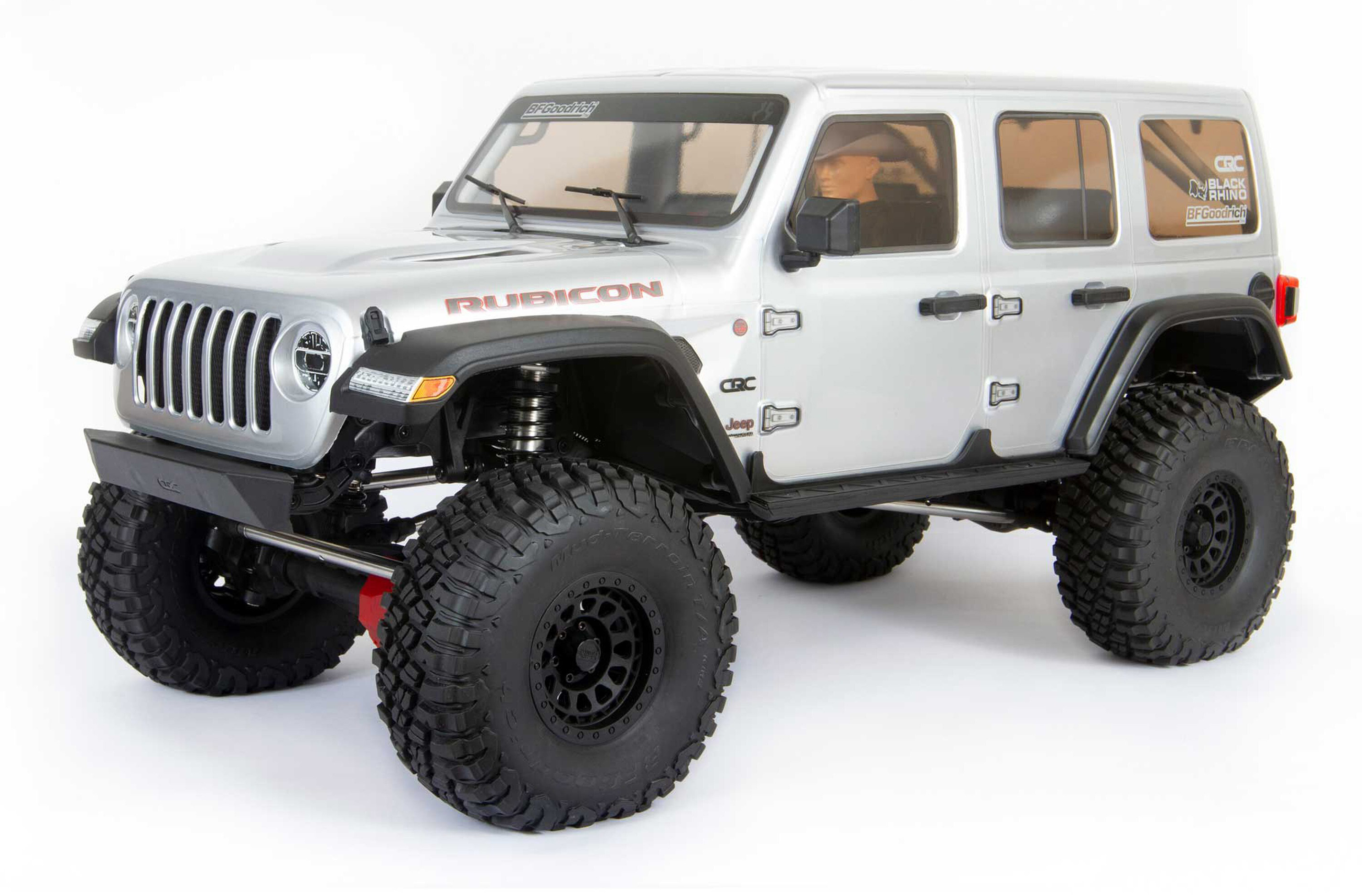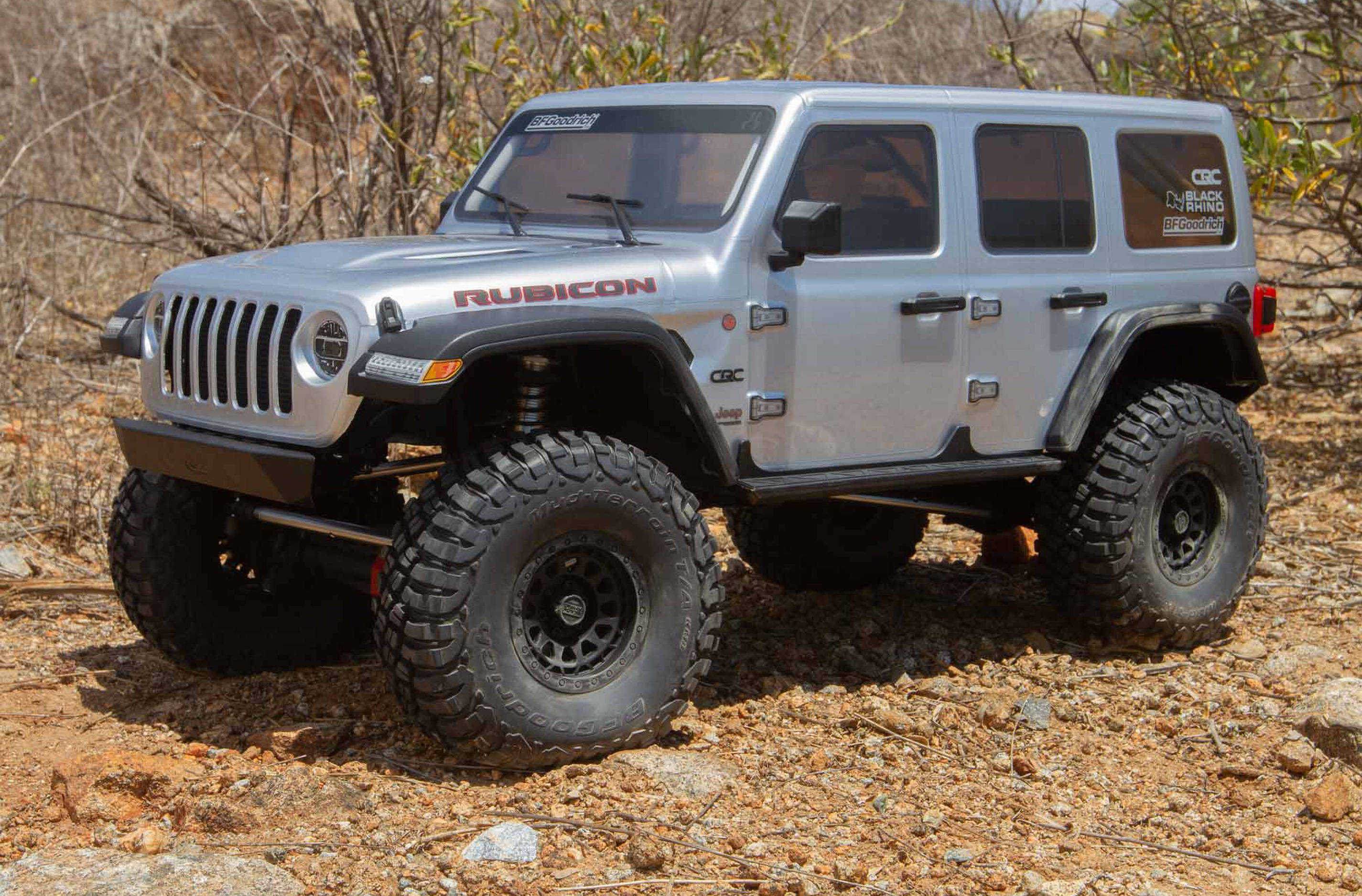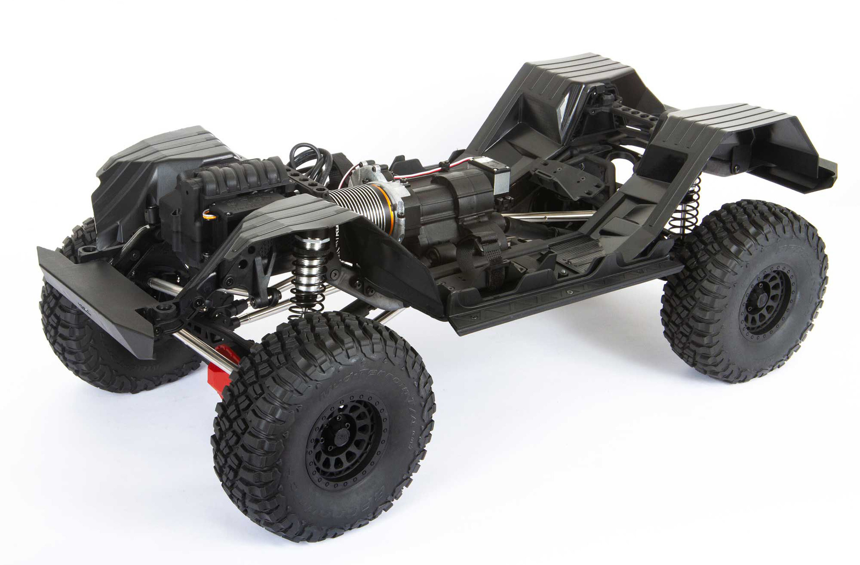 Massive, 7" (177,8mm) hohe BFGoodrich® KM3 Reifen bieten hervorragenden Grip und Bodenfreiheit für Dreck, Felsen und alle anderen Offroad-Terrains. Sie sind auf lizenzierten 3-teiligen Black Rhino "Primm" Beadlock-Felgen aus Spritzguss aufgezogen und können so jederzeit leicht ohne Klebstoff ausgetauscht werden. Egal ob Wald, Wüste, See oder Berge... Der SCX6 Jeep® JLU Wrangler 4WD ist dazu bereit überall hin zu fahren.