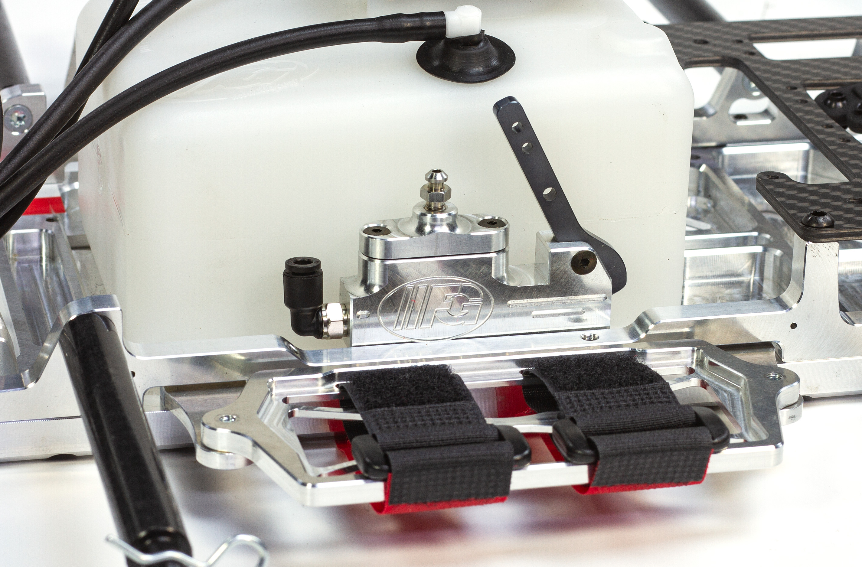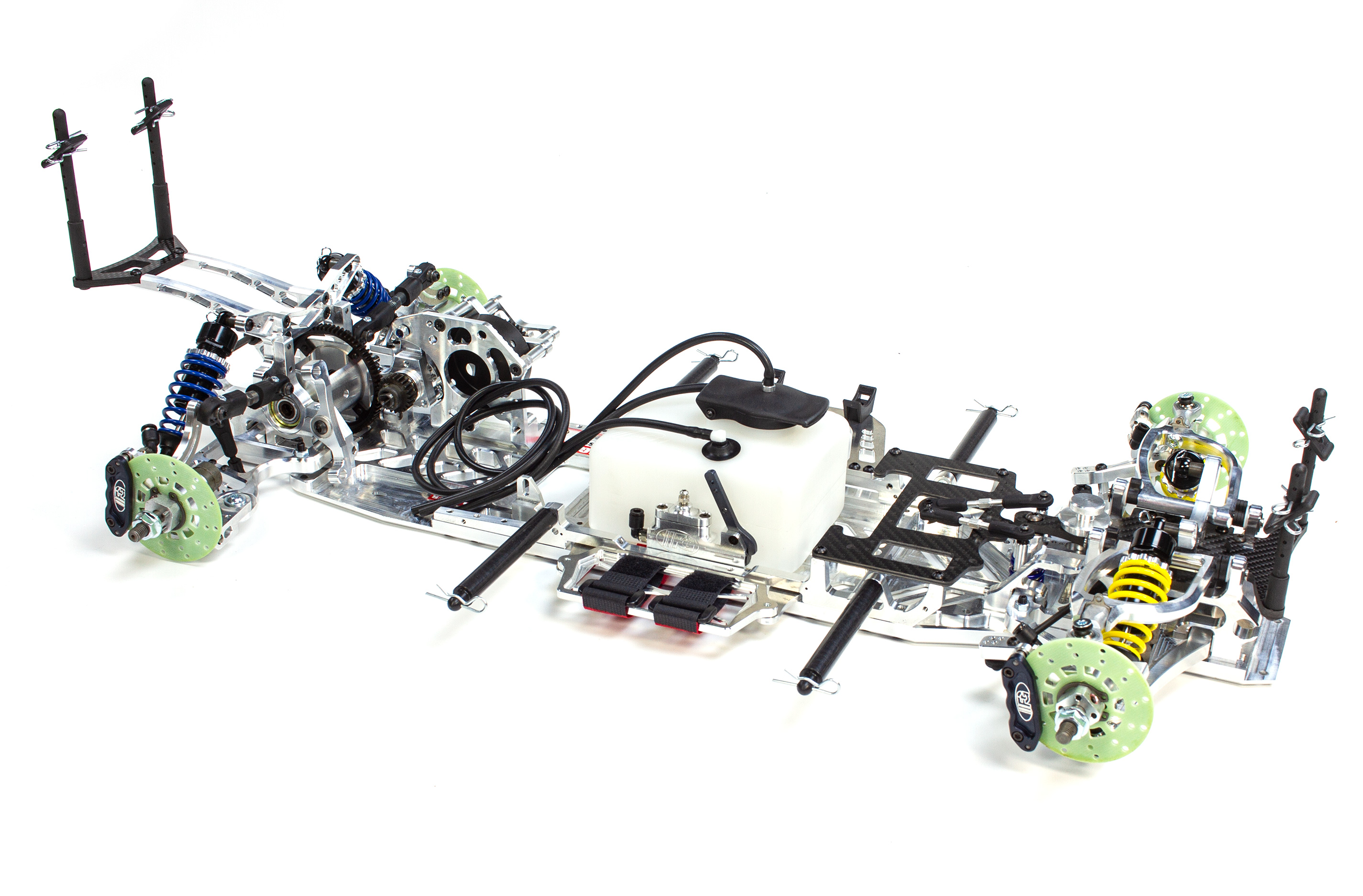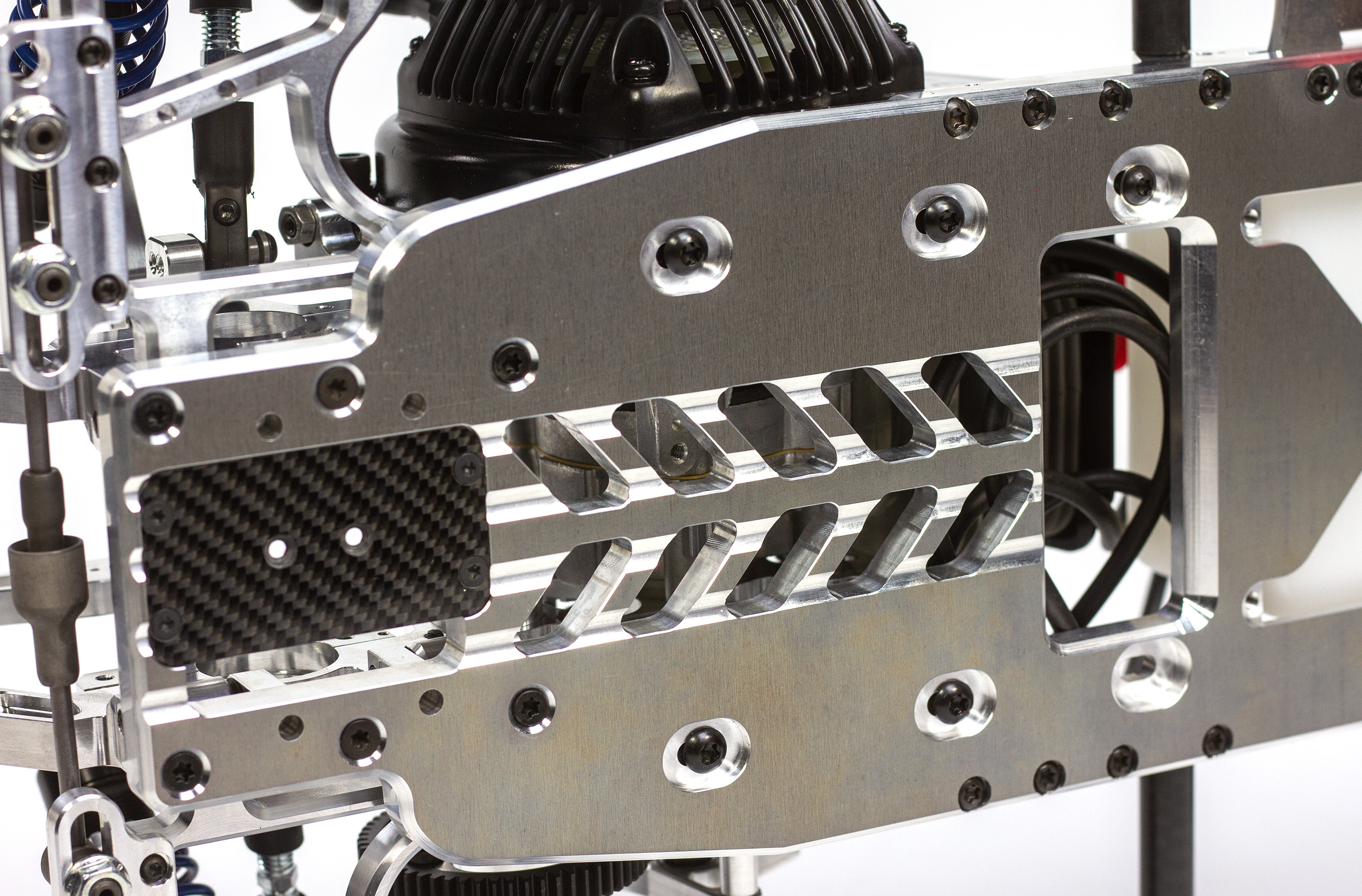 Einzigartig unter den Großmodellen. Neue Stabilisator-Konstruktion vorne und hinten. Es können Kugelstabilisatoren oder Bügelstabilisatoren verwendet werden (Zubehör). 10 mm dickes Chassis aus T7075 Aluminium mit Ausfräsungen für Gewichte (auch unter dem Tank) und Rillen im vorderen Bereich. Somit kann das Fahrzeug perfekt an die Piste oder den Fahrer angepasst werden. Motor ist nun wieder mit dem Chassis verschraubt für mehr Steifigkeit.