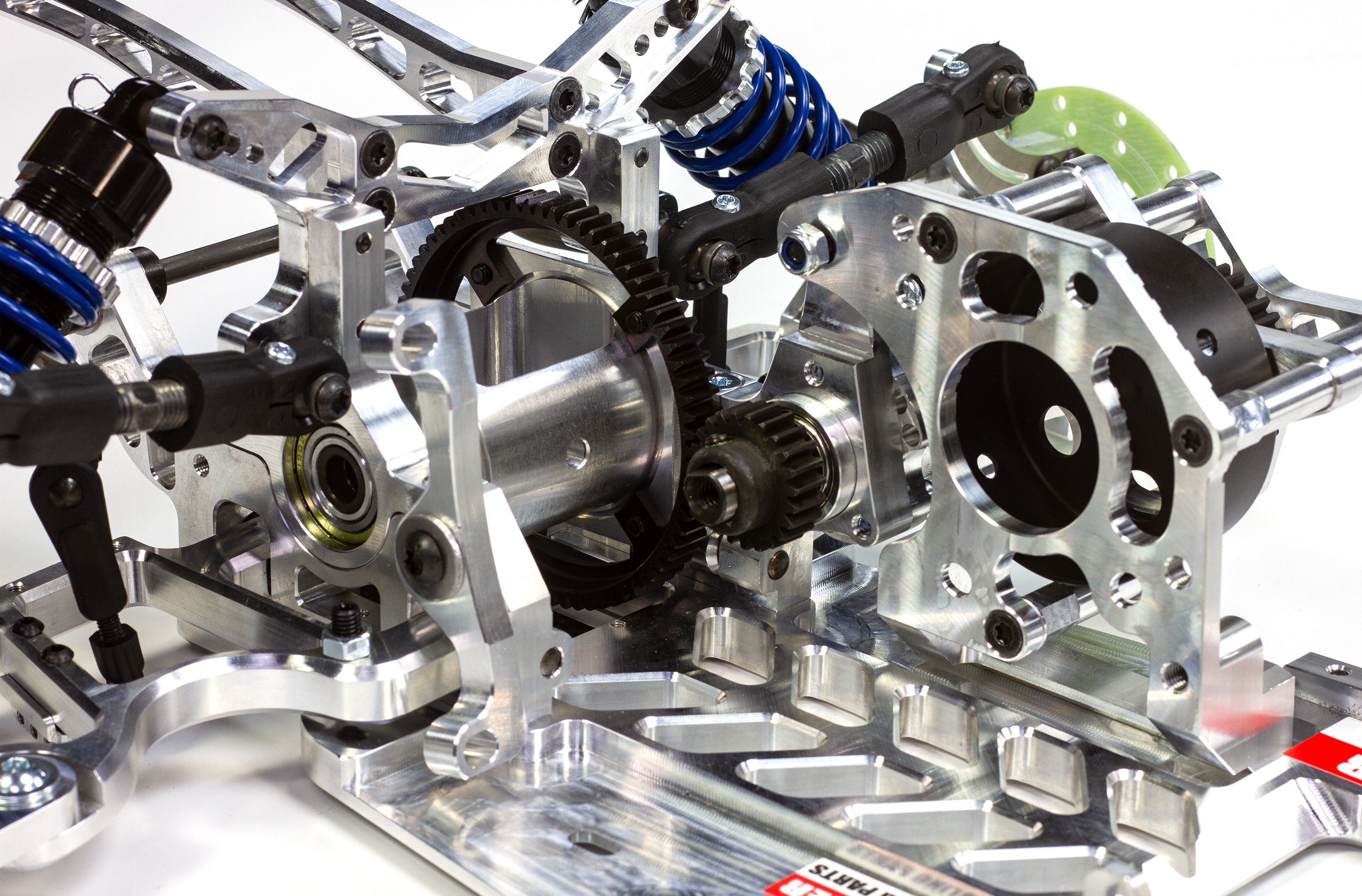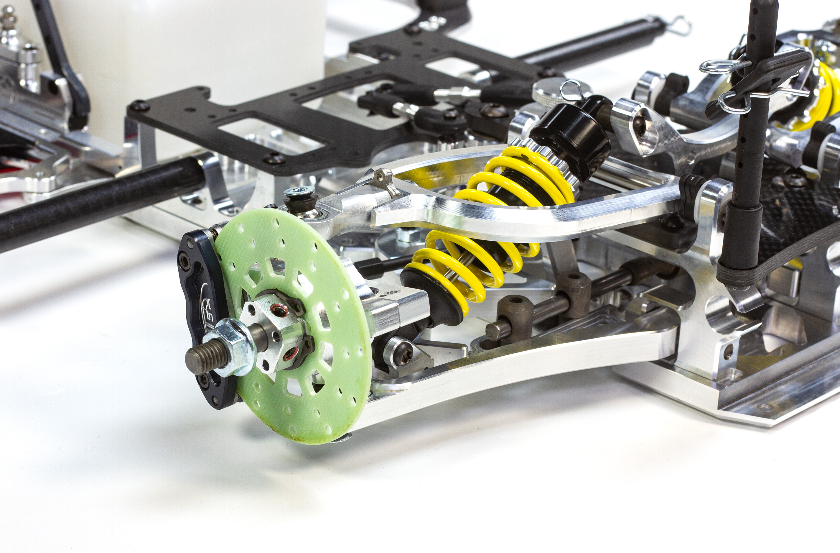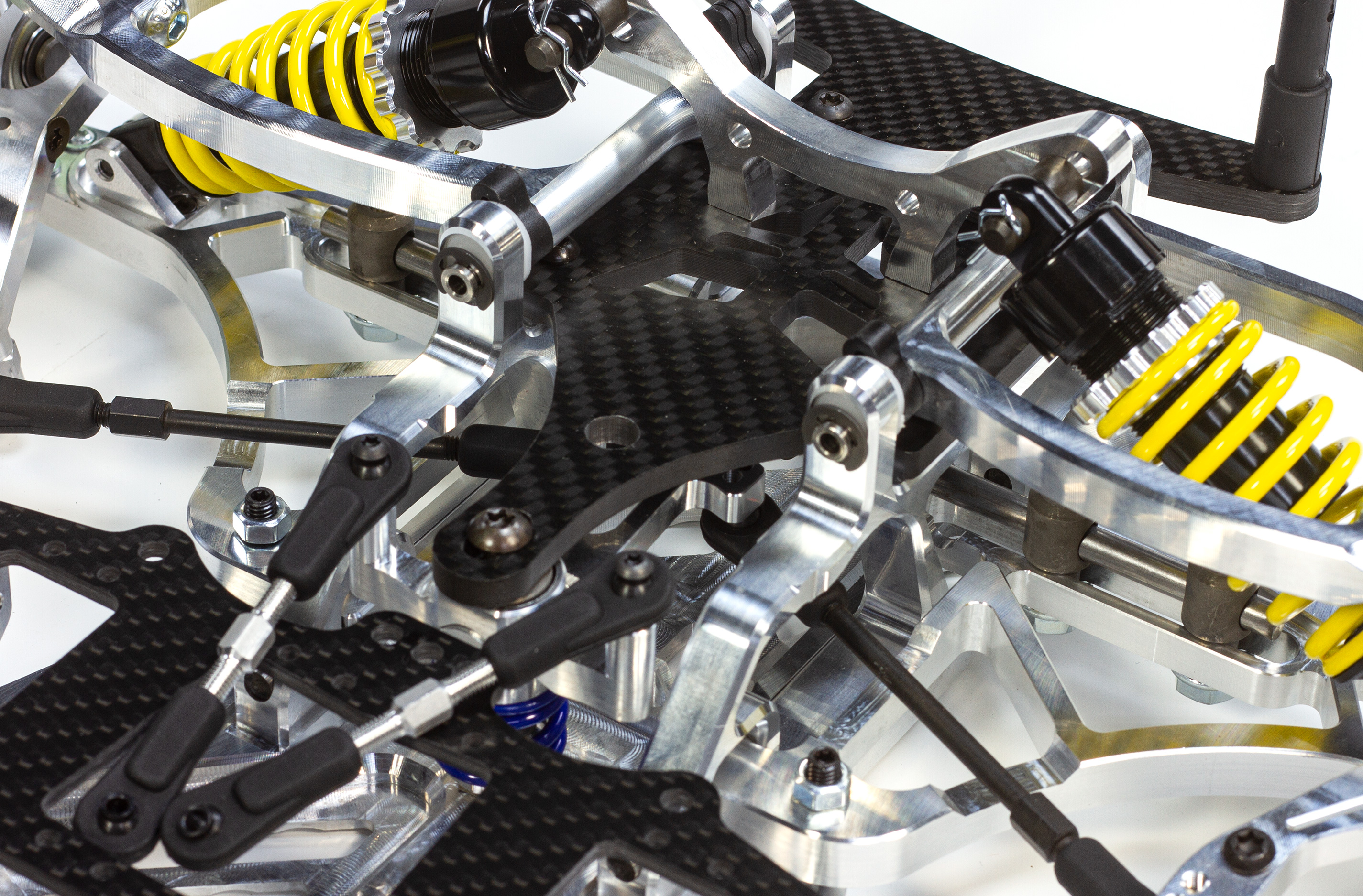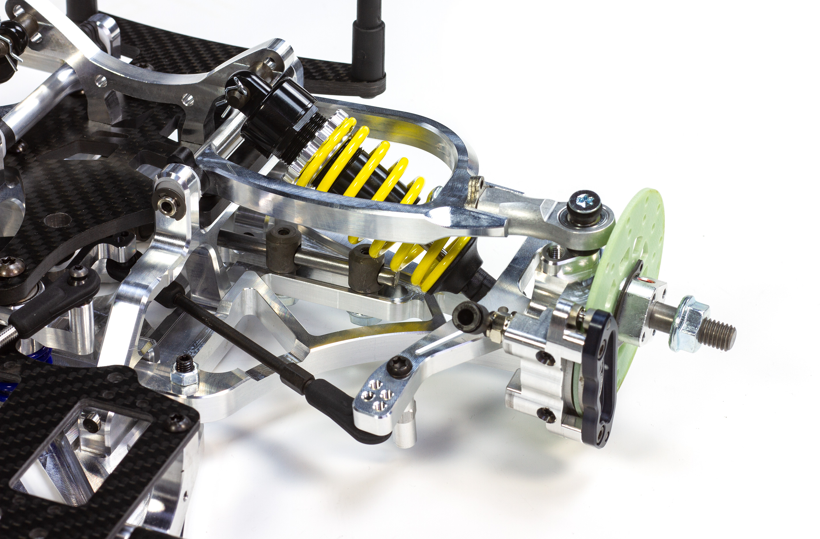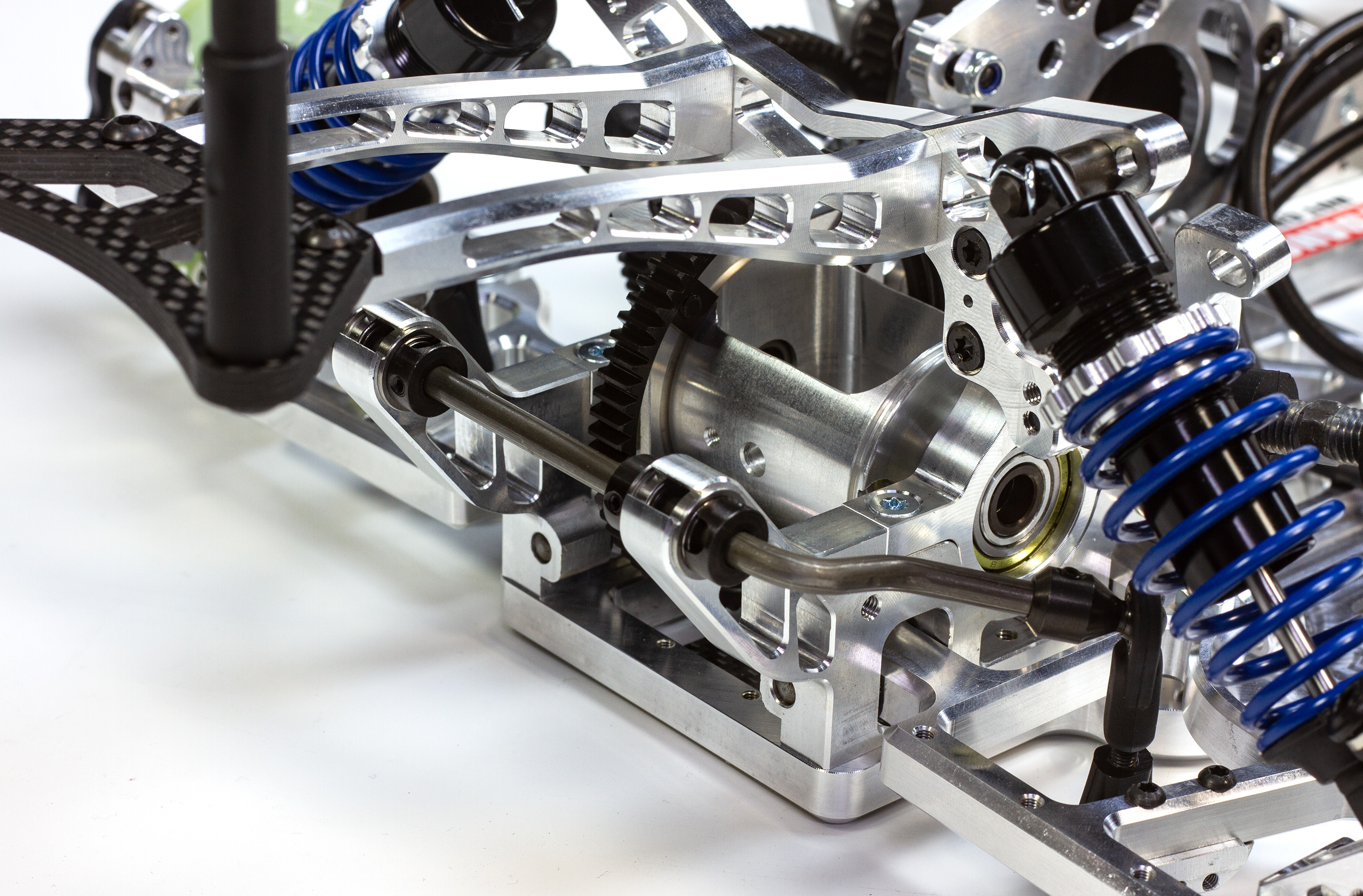 Optimal konstruierte Querlenker an der Vorder- und Hinterachse. Verstärkt und hinten mit Vorspureinstellung welche mit Alukeilen eingestellt werden. Querlenker vorne oben für mehr Einstellmöglichkeiten. Alle Zahnräder sind mit Feinverzahnung.