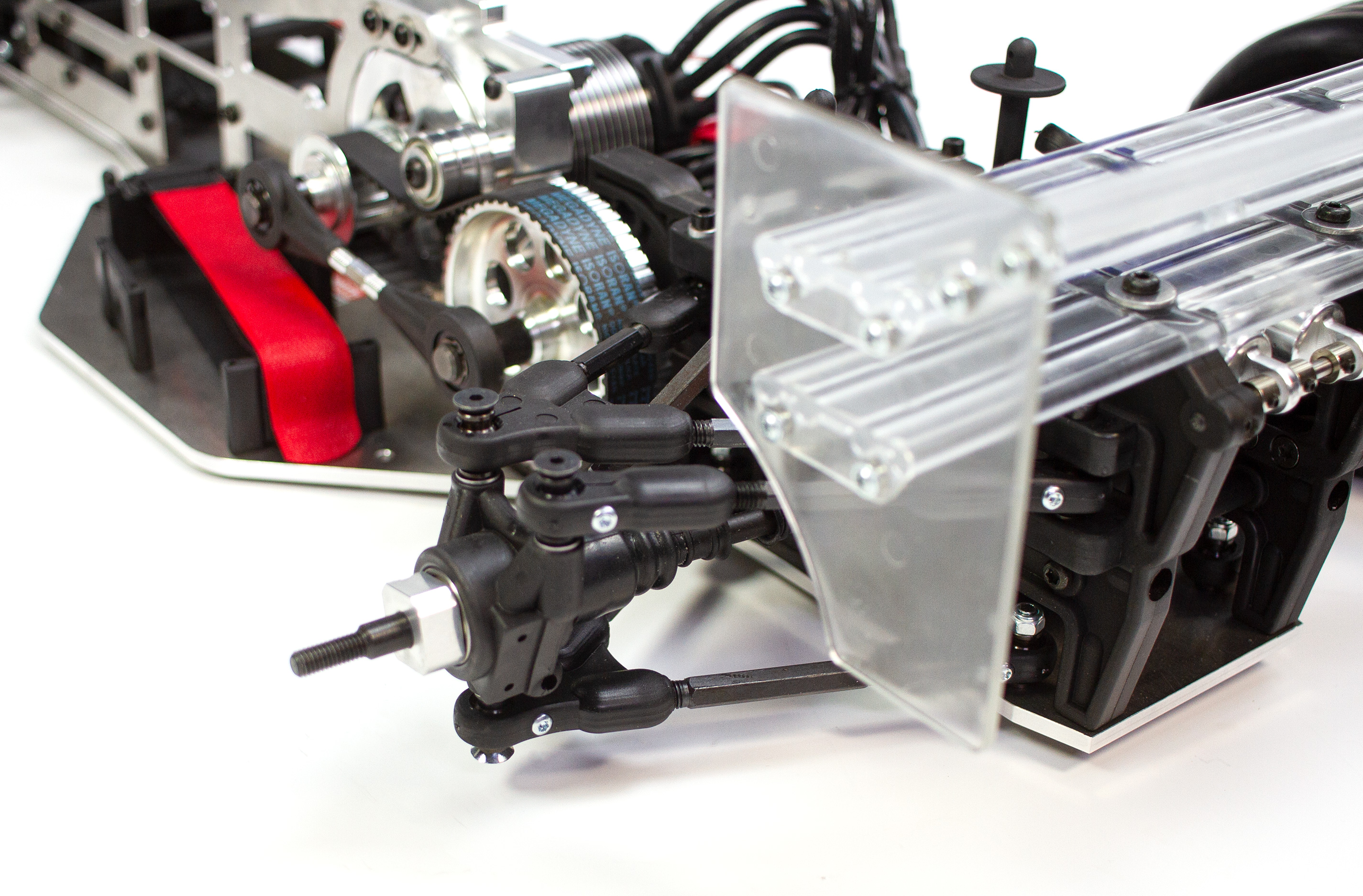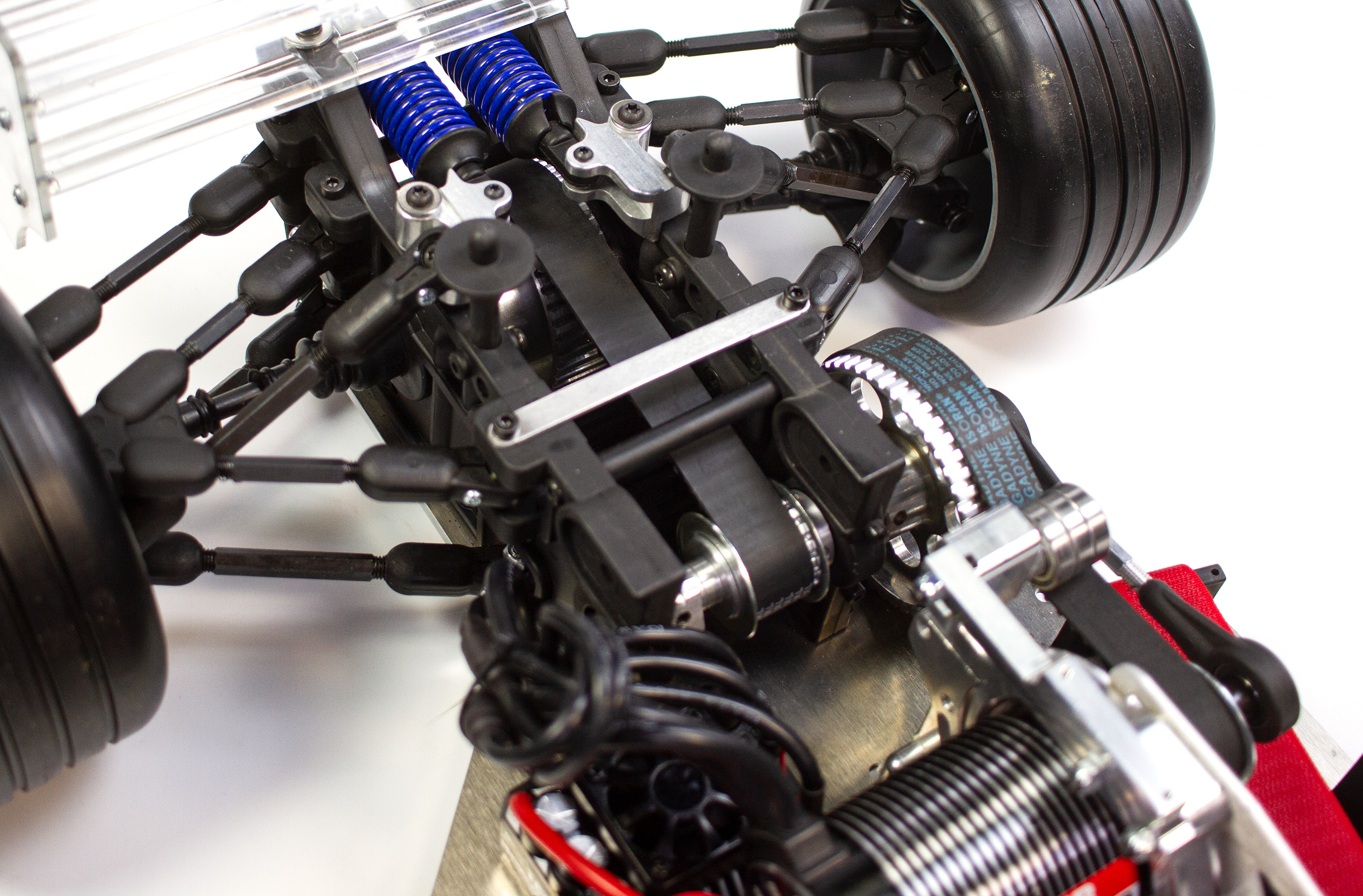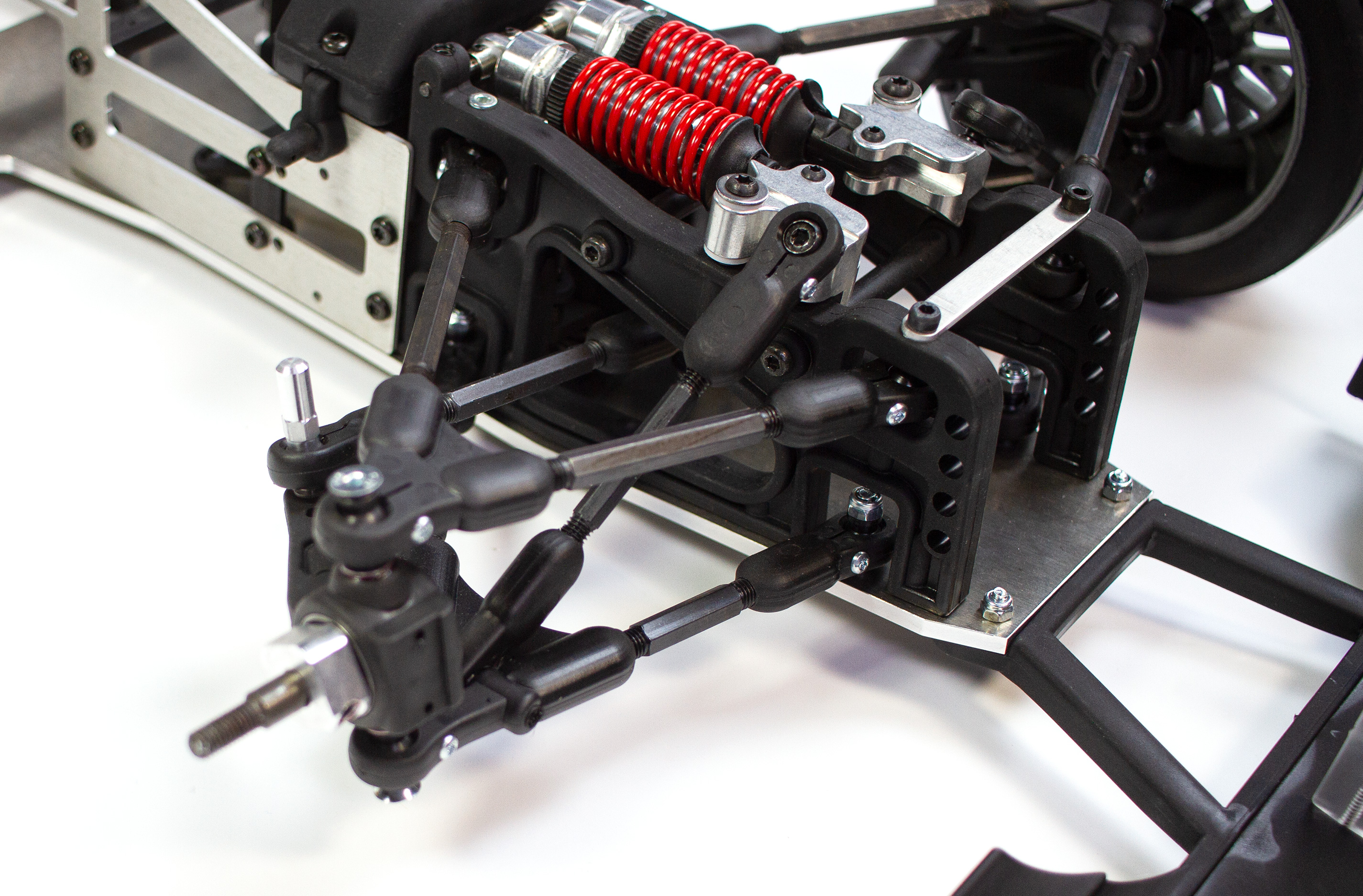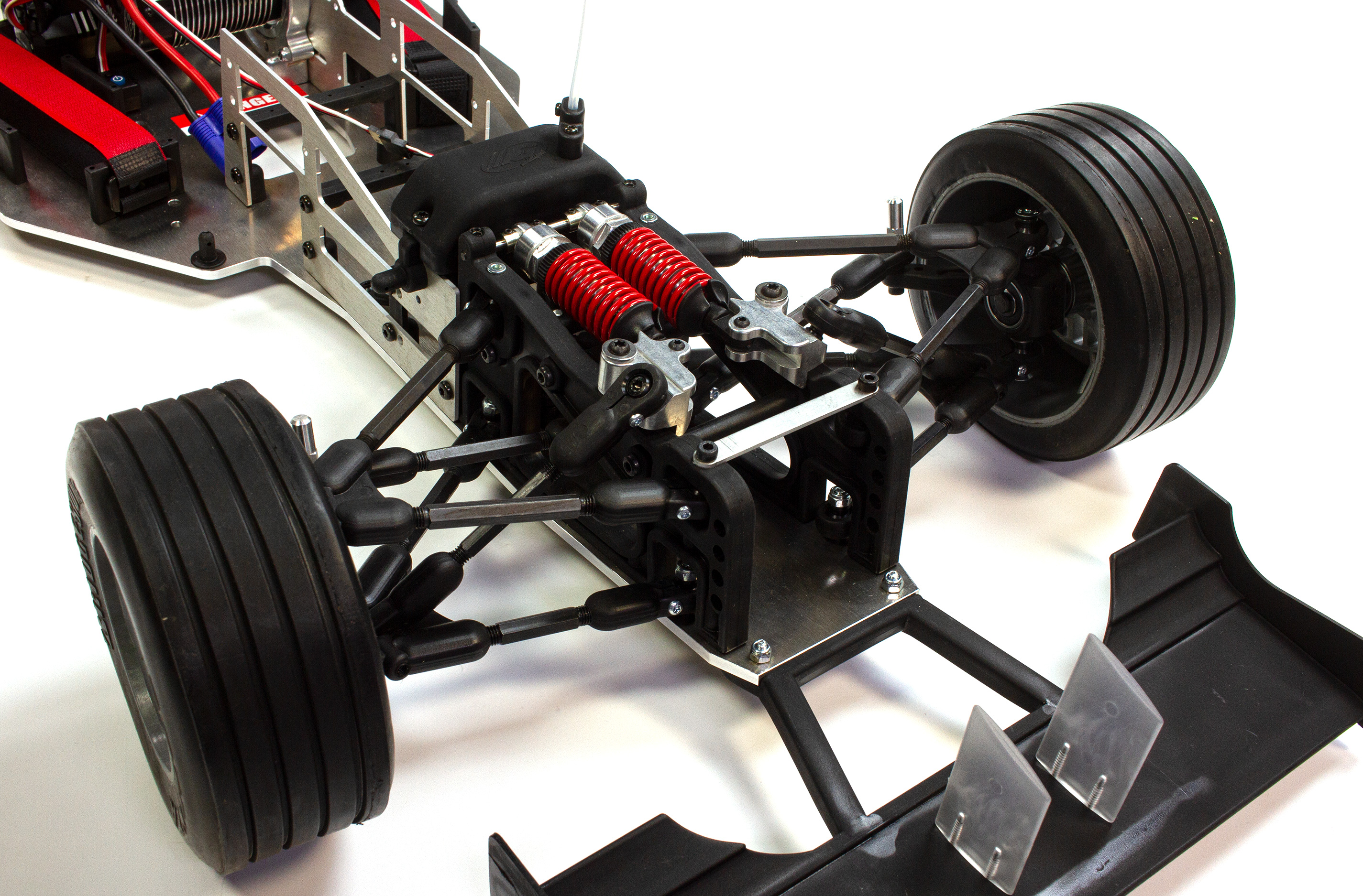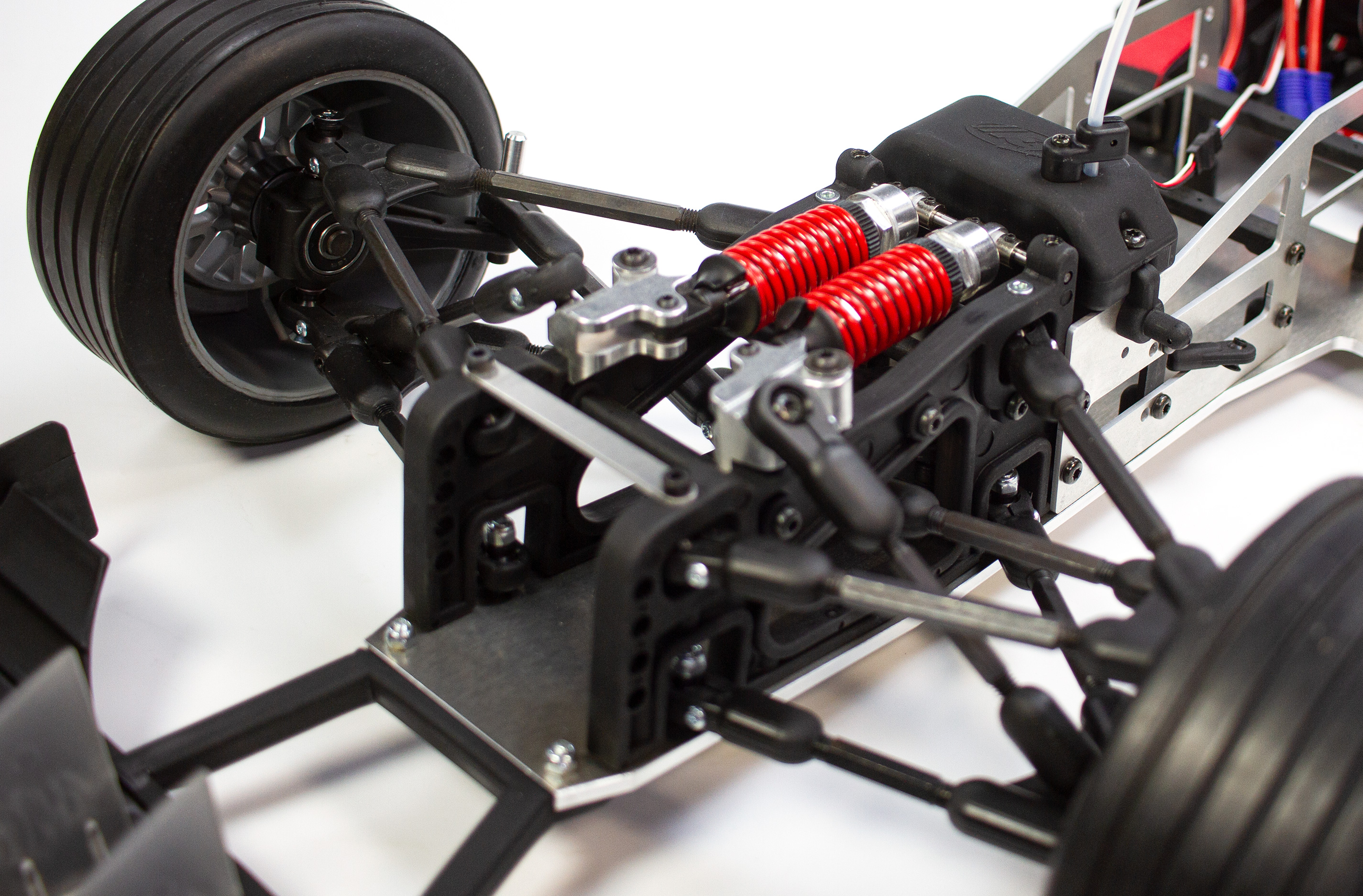Das Fahrwerk ist auf einer hochfesten 5mm Aluminium-Chassis-Platte aufgebaut und bietet dadurch extreme Stabilität. Senkungen in der Chassis-Platte ermöglichen ein bündiges Abschließen der Schrauben, somit ist unter dem Modell eine ebene Fläche gewährleistet. Durch vielseitige Einstellmöglichkeiten an der Vorder- und Hinterachse kann das Modell den eigenen Bedürfnissen perfekt angepasst werden. Das Einstellen wie Sturz, Nachlauf usw. stellt selbst für den Hobby-Einsteiger keinerlei Probleme dar und erfolgt über die Doppel-Dreiecksquerlenker, welche an der Hinterachse durch zusätzliche Spurstangen für maximale Stabilität sorgen. Auch die einstellbaren Aluminium Öldruck-Stoßdämpfer überzeugen auf voller Länge und bieten selbst auf einem sehr schwierigen Untergrund maximale Perfomance. Die bereits erwähnte Push-Rod Aufhängung ermöglicht eine spielfreie Kraftübertragung von den Radaufhängungen zu den Stoßdämpfern, was für eine präzise Fahrweise unerlässlich ist.