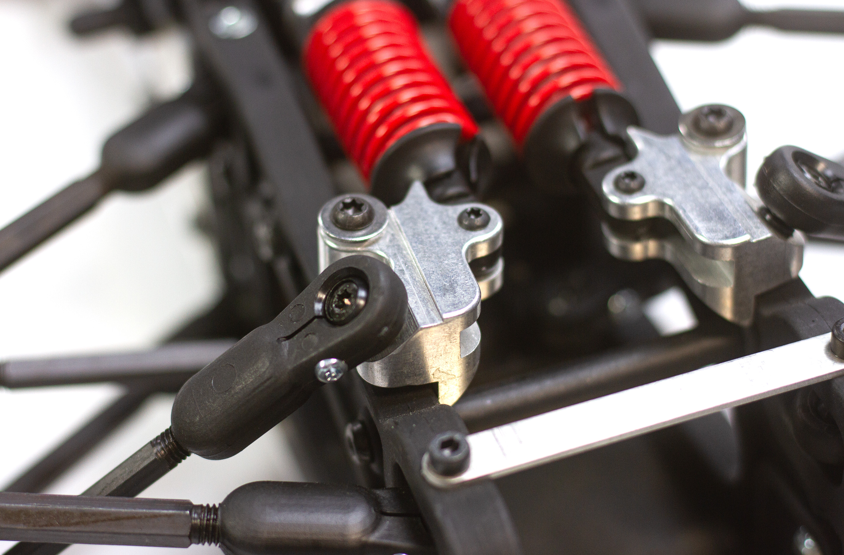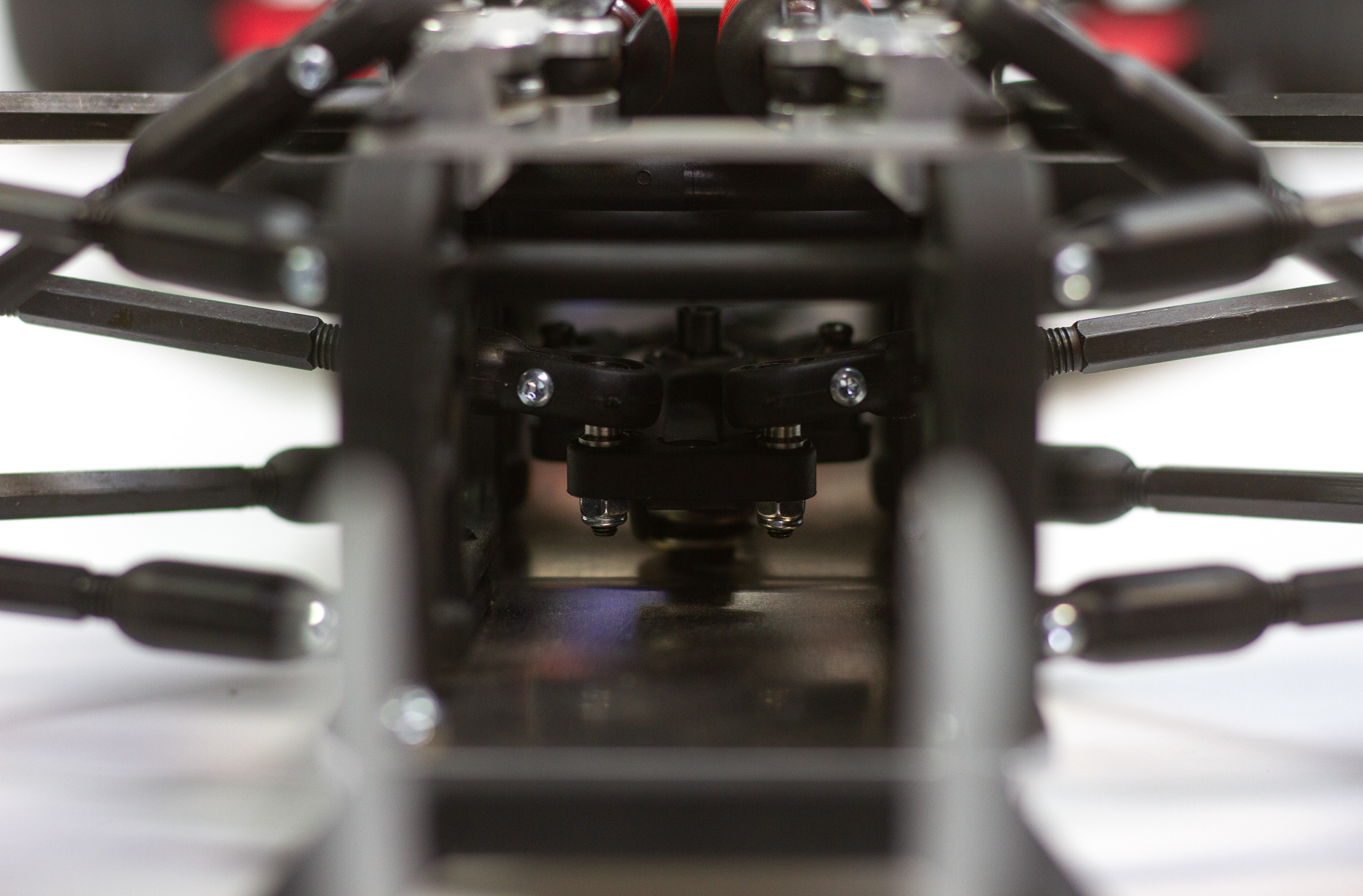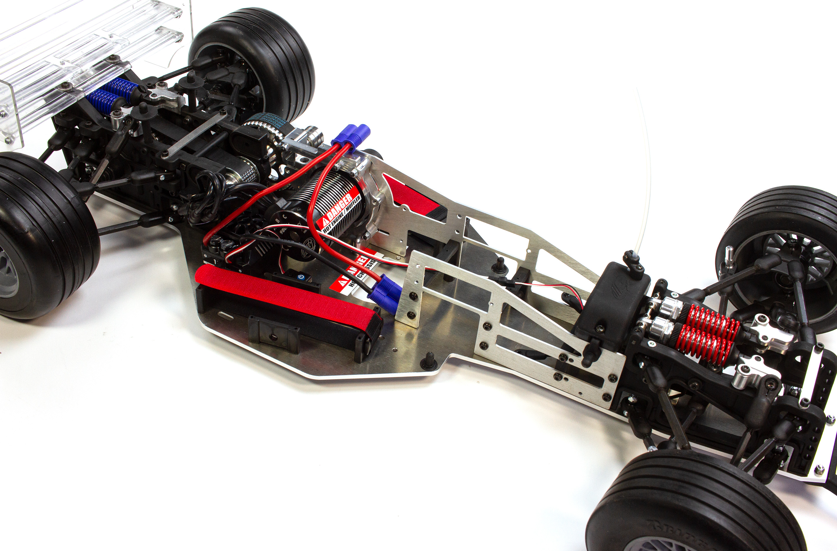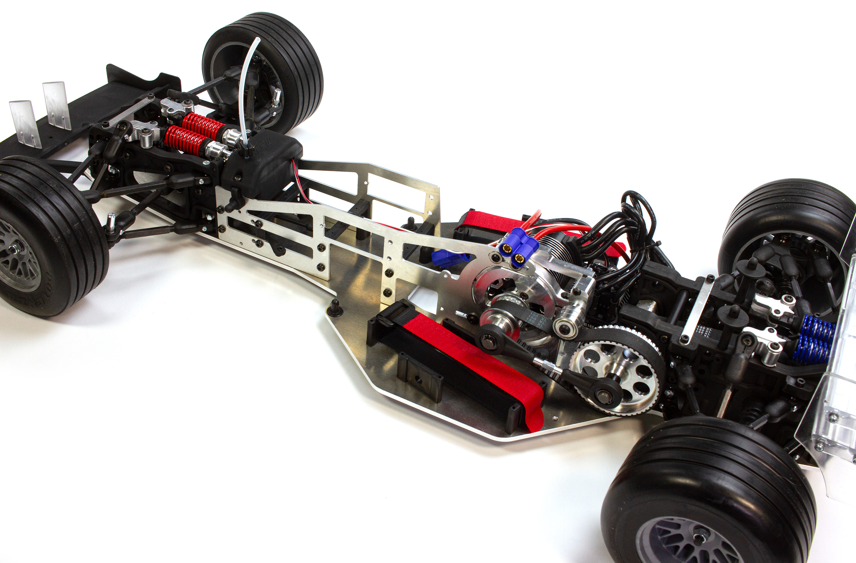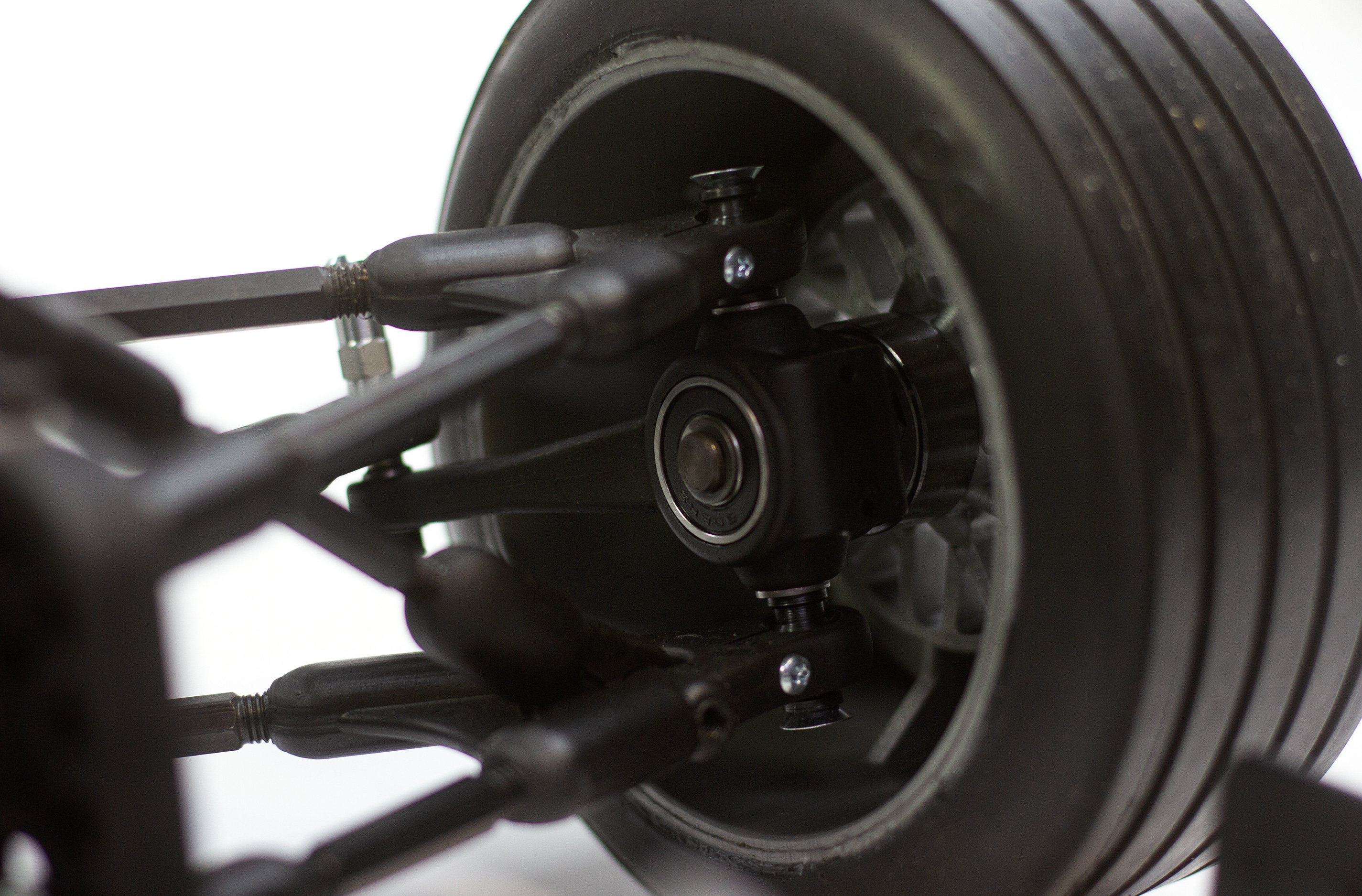 Das Fahrwerk ist auf einer hochfesten 5mm Aluminium-Chassis-Platte aufgebaut und bietet dadurch extreme Stabilität. Senkungen in der Chassis-Platte ermöglichen ein bündiges Abschließen der Schrauben, somit ist unter dem Modell eine ebene Fläche gewährleistet. Durch vielseitige Einstellmöglichkeiten an der Vorder- und Hinterachse kann das Modell den eigenen Bedürfnissen perfekt angepasst werden. Das Einstellen wie Sturz, Nachlauf usw. stellt selbst für den Hobby-Einsteiger keinerlei Probleme dar und erfolgt über die Doppel-Dreiecksquerlenker, welche an der Hinterachse durch zusätzliche Spurstangen für maximale Stabilität sorgen. Auch die einstellbaren Aluminium Öldruck-Stoßdämpfer überzeugen auf voller Länge und bieten selbst auf einem sehr schwierigen Untergrund maximale Perfomance. Die bereits erwähnte Push-Rod Aufhängung ermöglicht eine spielfreie Kraftübertragung von den Radaufhängungen zu den Stoßdämpfern, was für eine präzise Fahrweise unerlässlich ist.