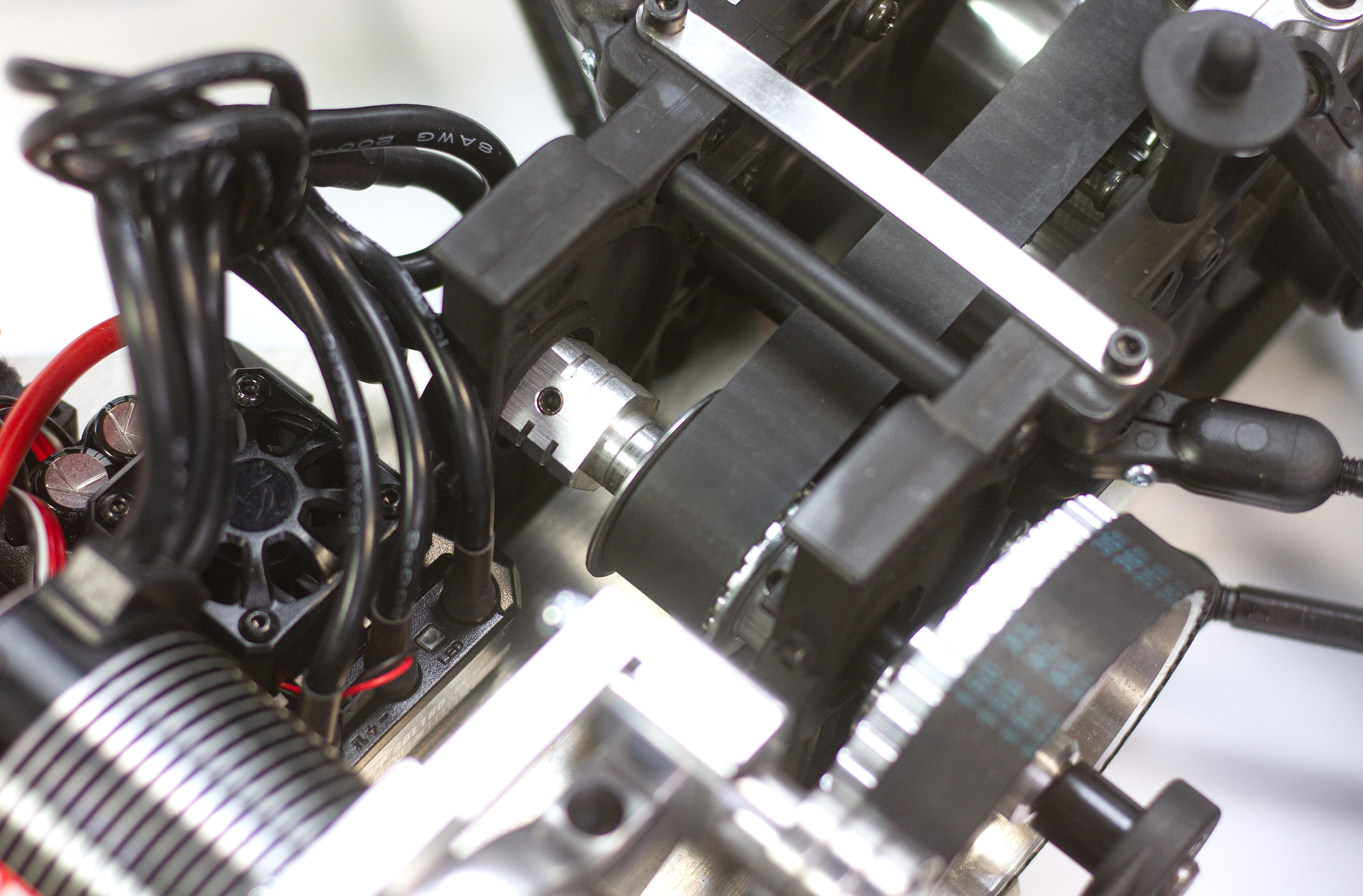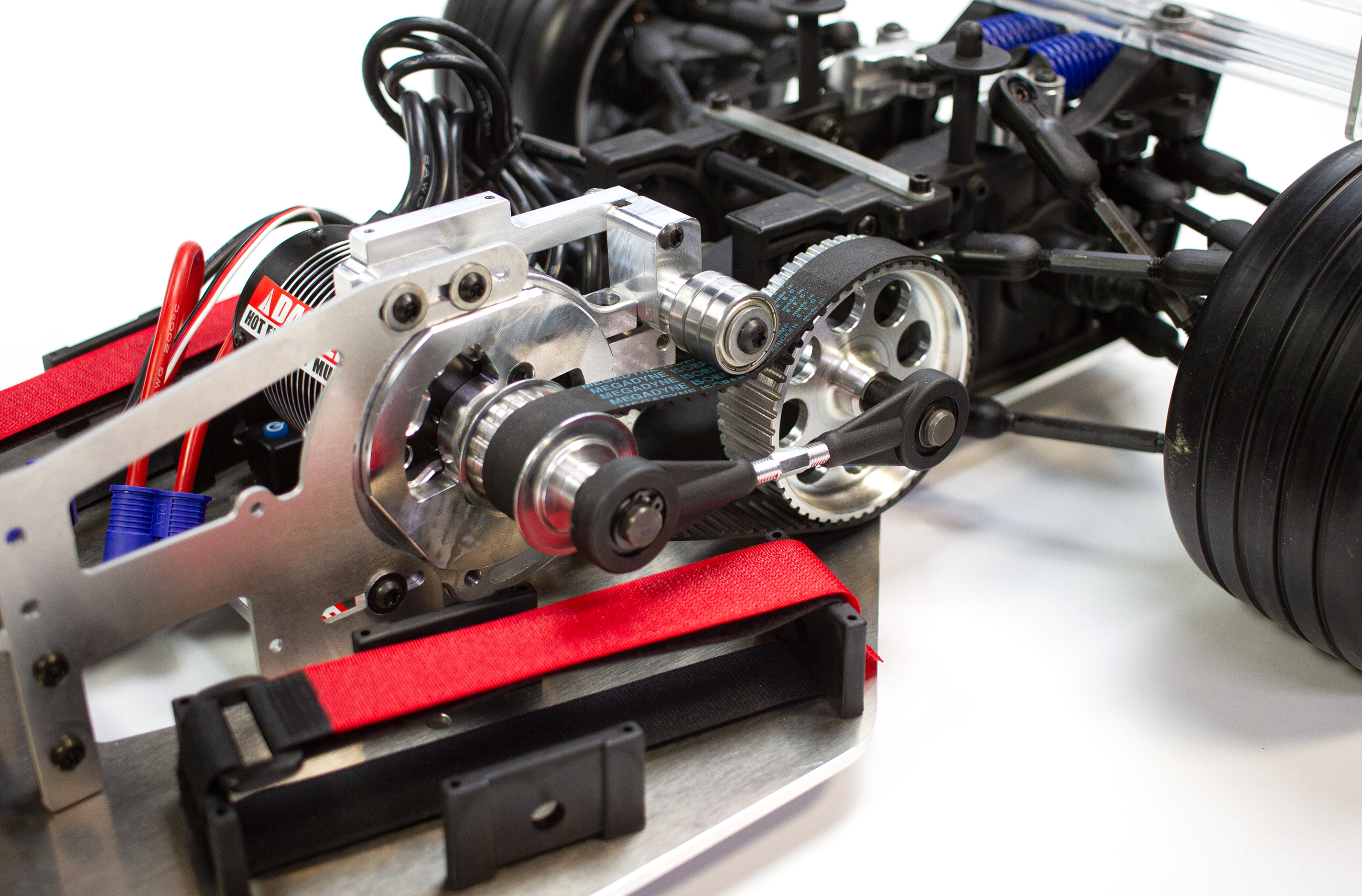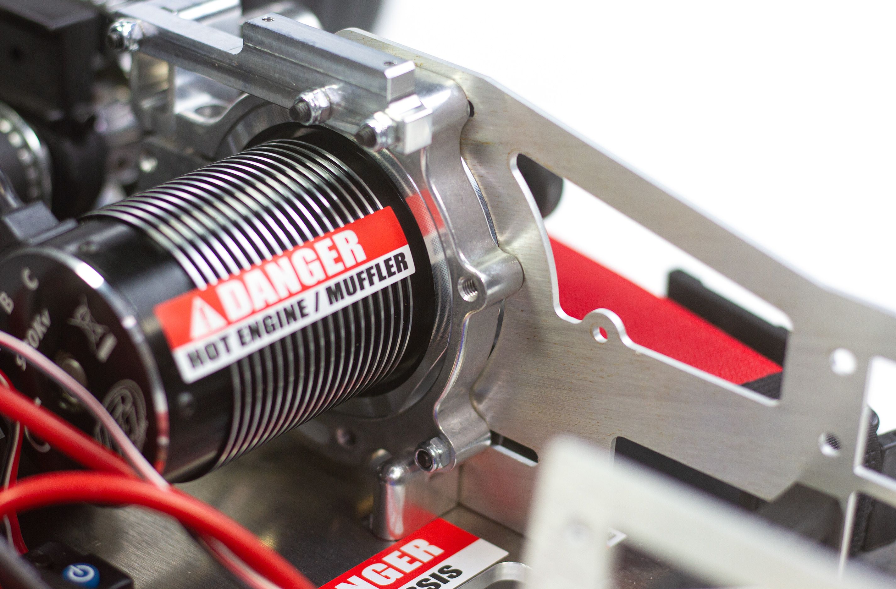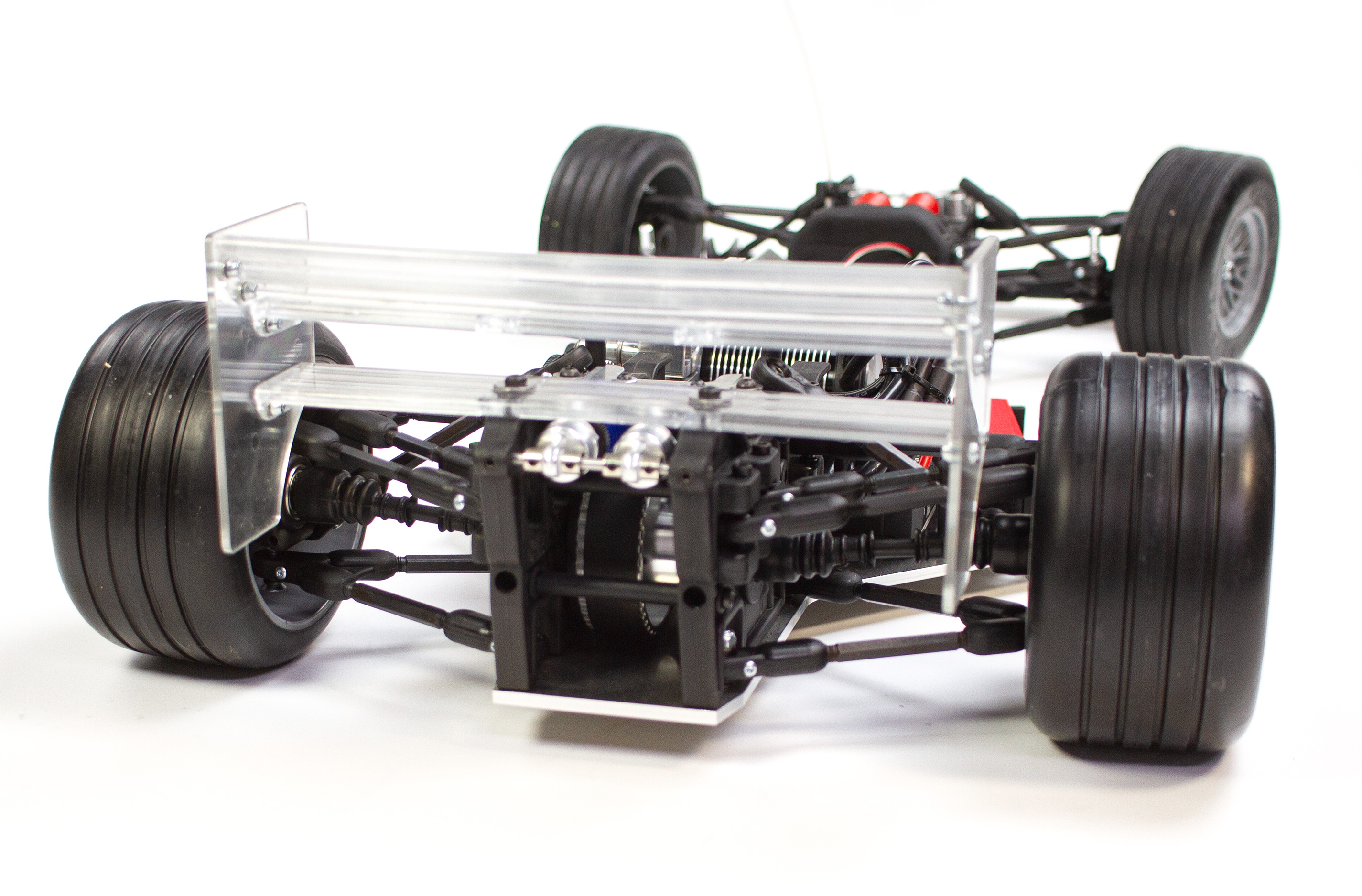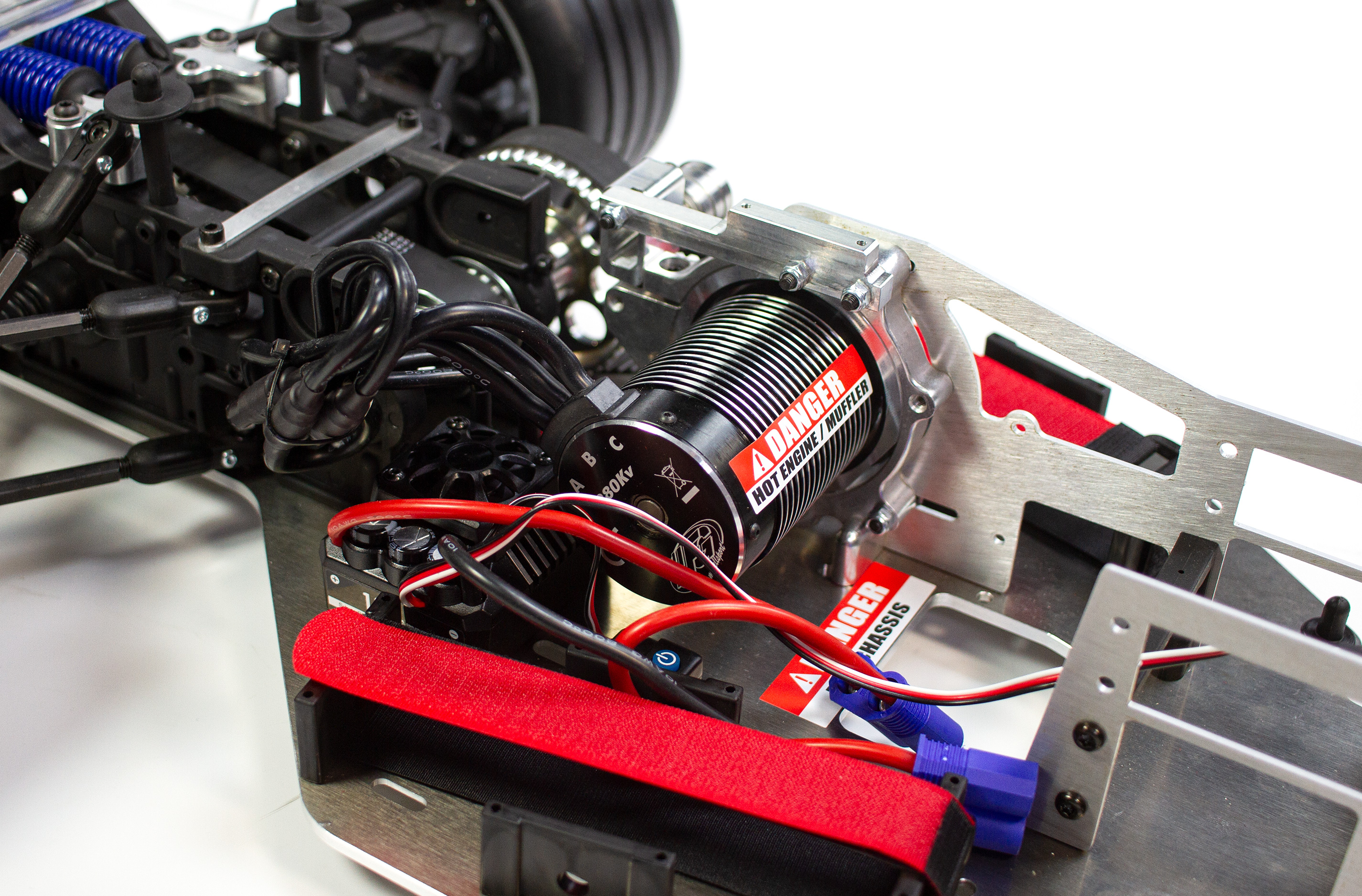 Das Fahrwerk ist auf einer hochfesten 5mm Aluminium-Chassis-Platte aufgebaut und bietet dadurch extreme Stabilität. Senkungen in der Chassis-Platte ermöglichen ein bündiges Abschließen der Schrauben, somit ist unter dem Modell eine ebene Fläche gewährleistet. Durch vielseitige Einstellmöglichkeiten an der Vorder- und Hinterachse kann das Modell den eigenen Bedürfnissen perfekt angepasst werden. Das Einstellen wie Sturz, Nachlauf usw. stellt selbst für den Hobby-Einsteiger keinerlei Probleme dar und erfolgt über die Doppel-Dreiecksquerlenker, welche an der Hinterachse durch zusätzliche Spurstangen für maximale Stabilität sorgen. Auch die einstellbaren Aluminium Öldruck-Stoßdämpfer überzeugen auf voller Länge und bieten selbst auf einem sehr schwierigen Untergrund maximale Perfomance. Die bereits erwähnte Push-Rod Aufhängung ermöglicht eine spielfreie Kraftübertragung von den Radaufhängungen zu den Stoßdämpfern, was für eine präzise Fahrweise unerlässlich ist.