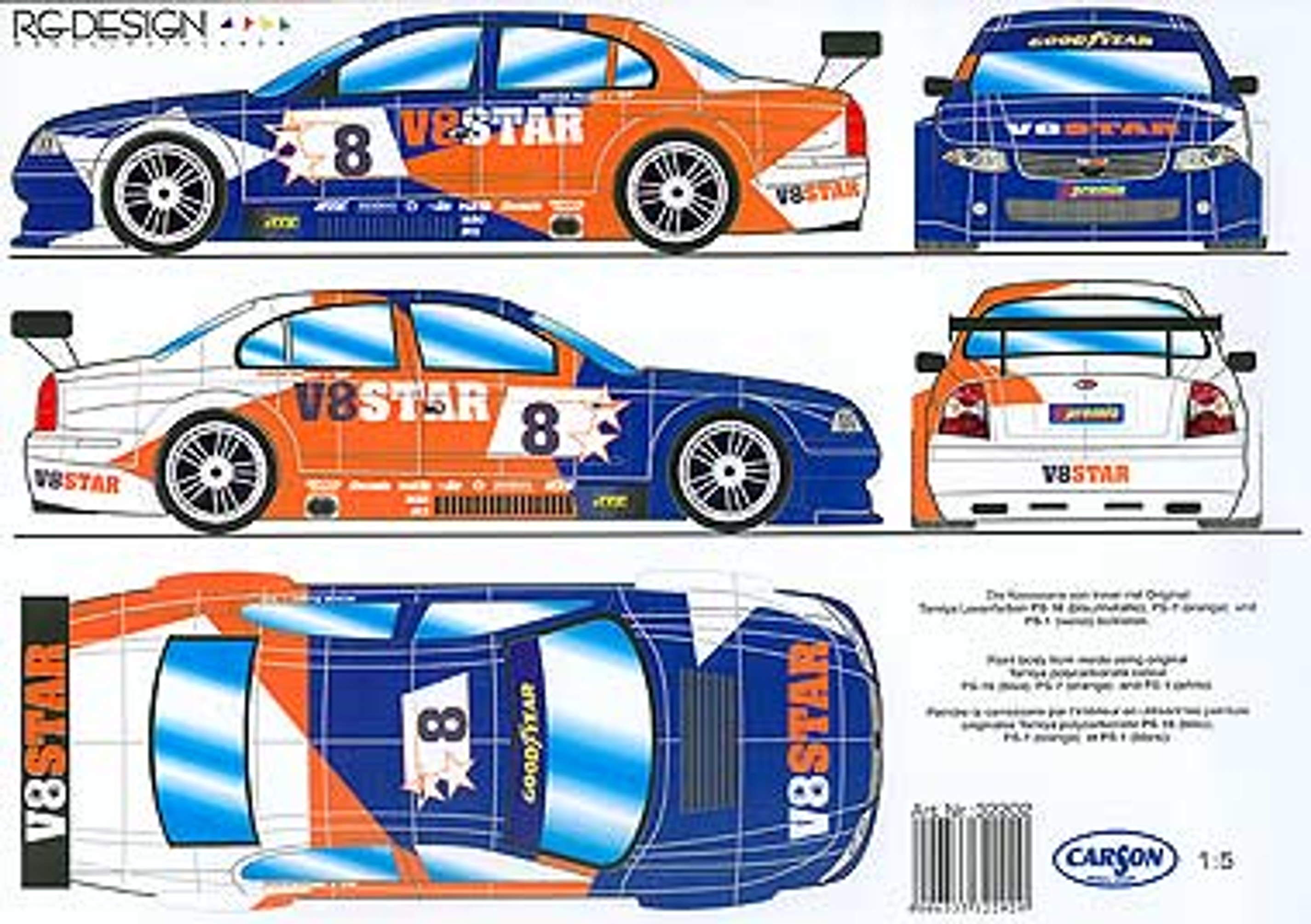 Set with team decals "V8 Star", 475 x 225 mm, and a sheet with silver colored pinstripes.