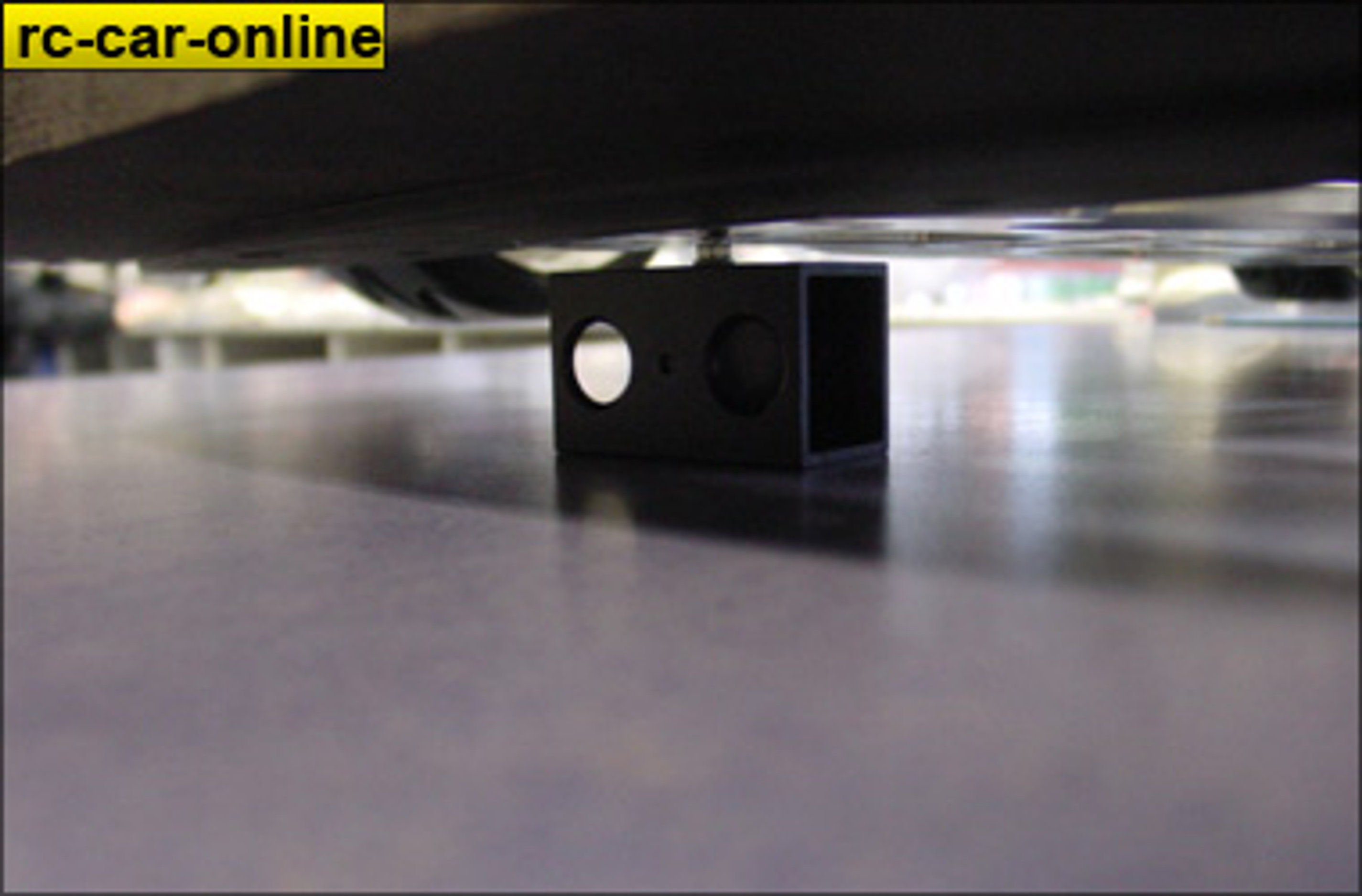 Remove the wheels and tyres from your car and put the car onto the support blocks. Ideally the rear block is positioned to the back of car and the front one just where the servo saver is fixed to the chassis. The car is now propped on the support blocks safely and cannot bounce. Please make sure that no dirt or rubber is trapped between the Support blocks and the chassis.