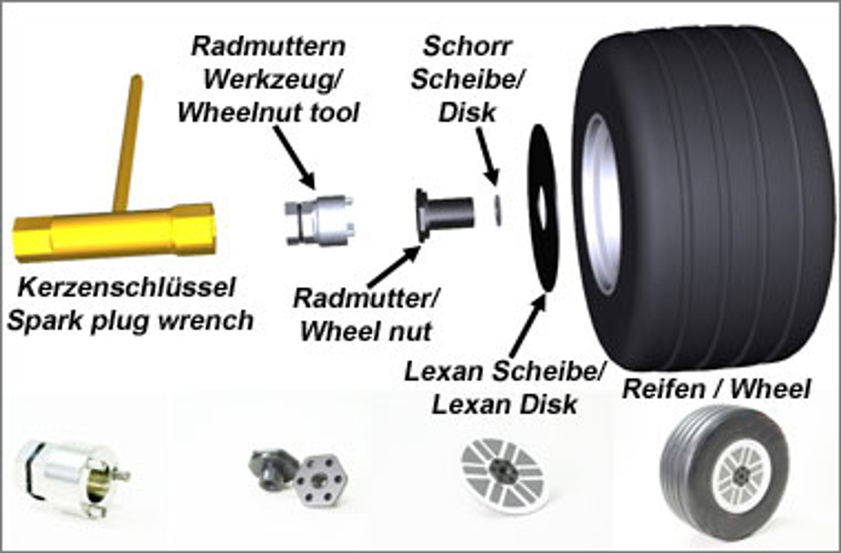 Optional parts: Tool for Lightscale wheel nuts item code 50100000, Lightscale lexan disc item code 51009500 and spare rifled conical washers item code 881200058801. Due to the high torque load on the bonding of tires on largescale cars, checking the bonding from time to time and re-glueing (y0067) if necessary is unavoidable.
