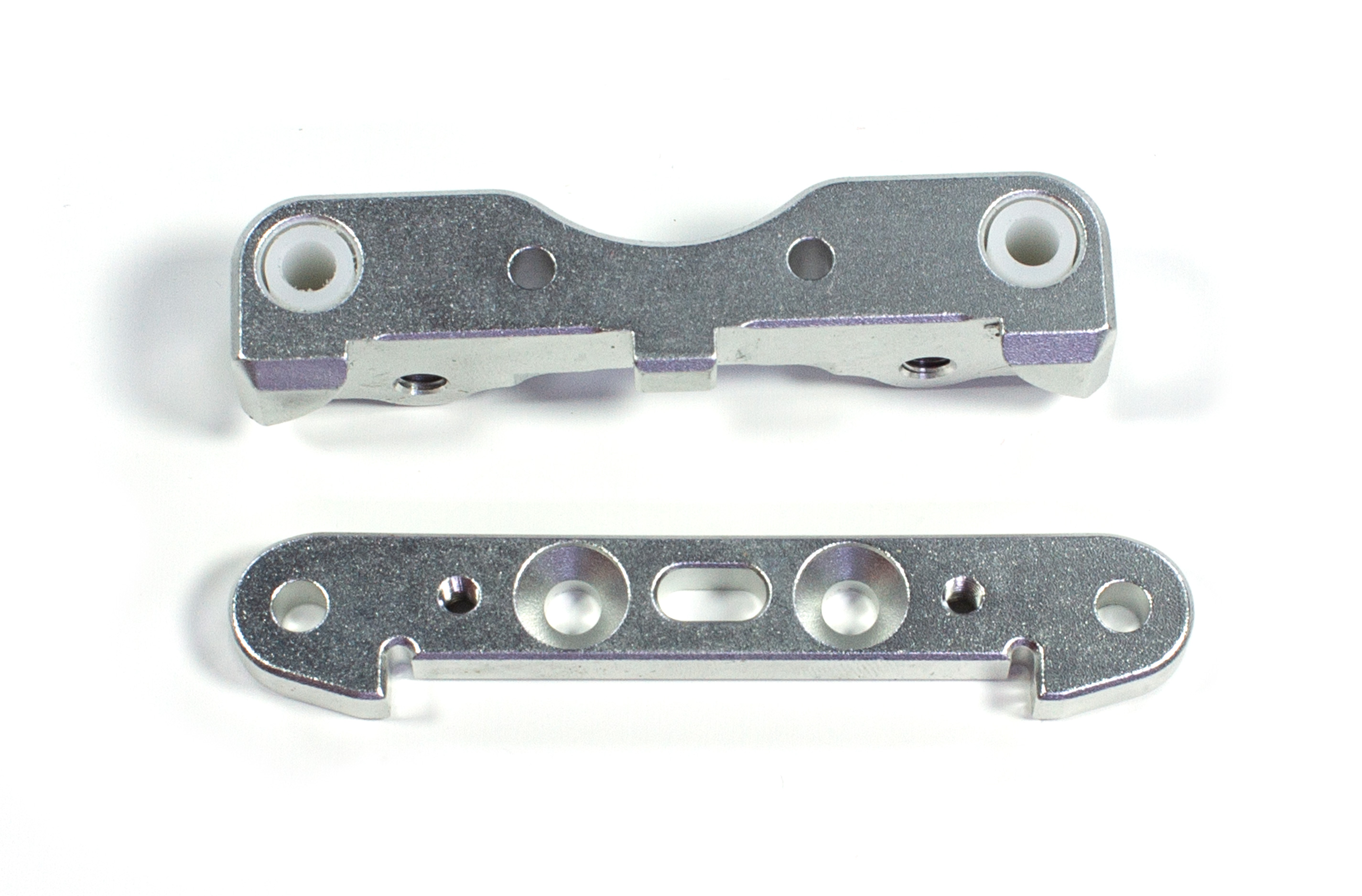 GPM aluminum lower hinge pin brackets rear axle for Arrma Kraton / Outcast 8S, CNC- machined from 6061-T6 aluminum. With this set, the multi-part front bracket is replaced by a one-piece design with plastic bushings.