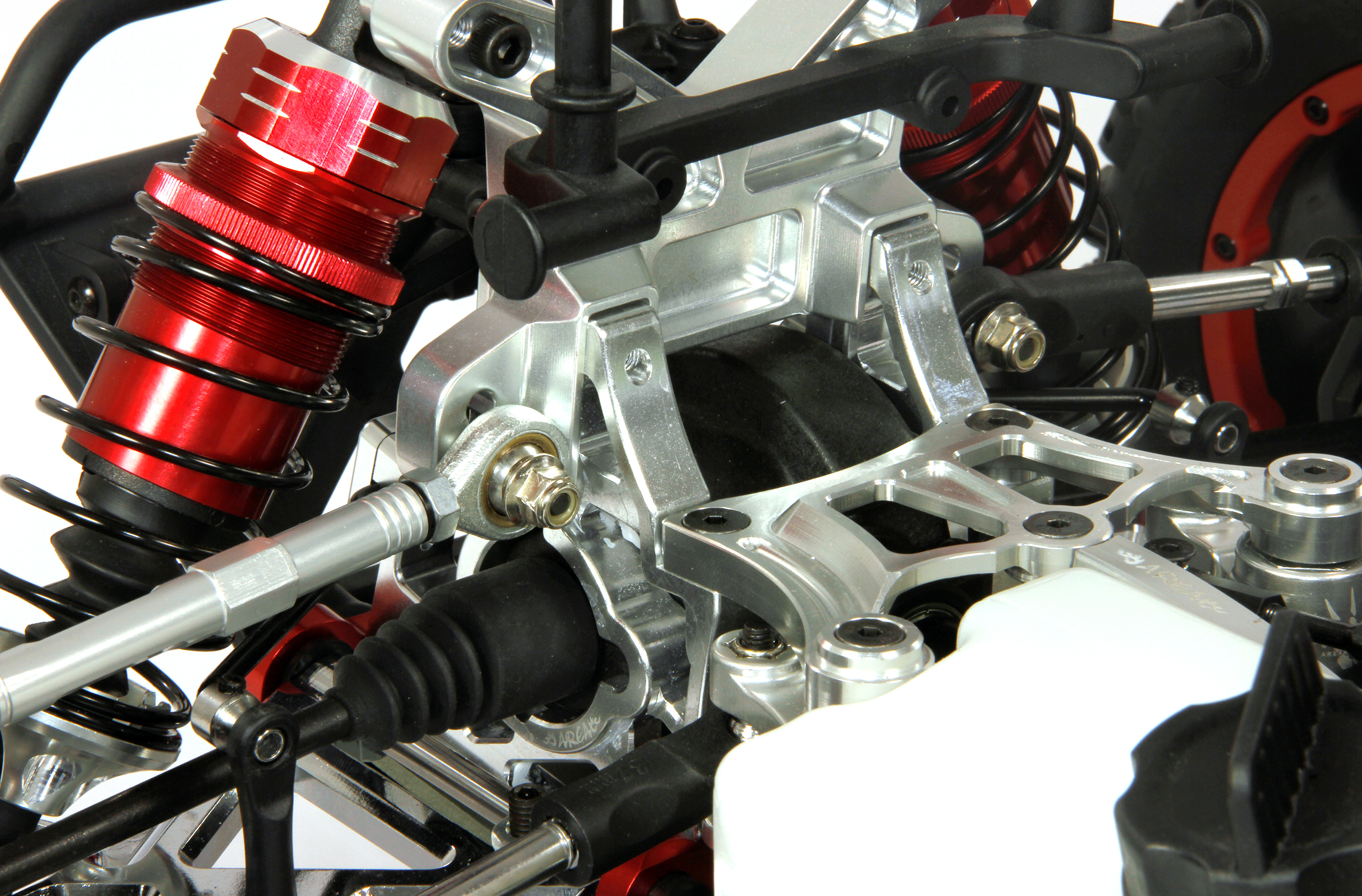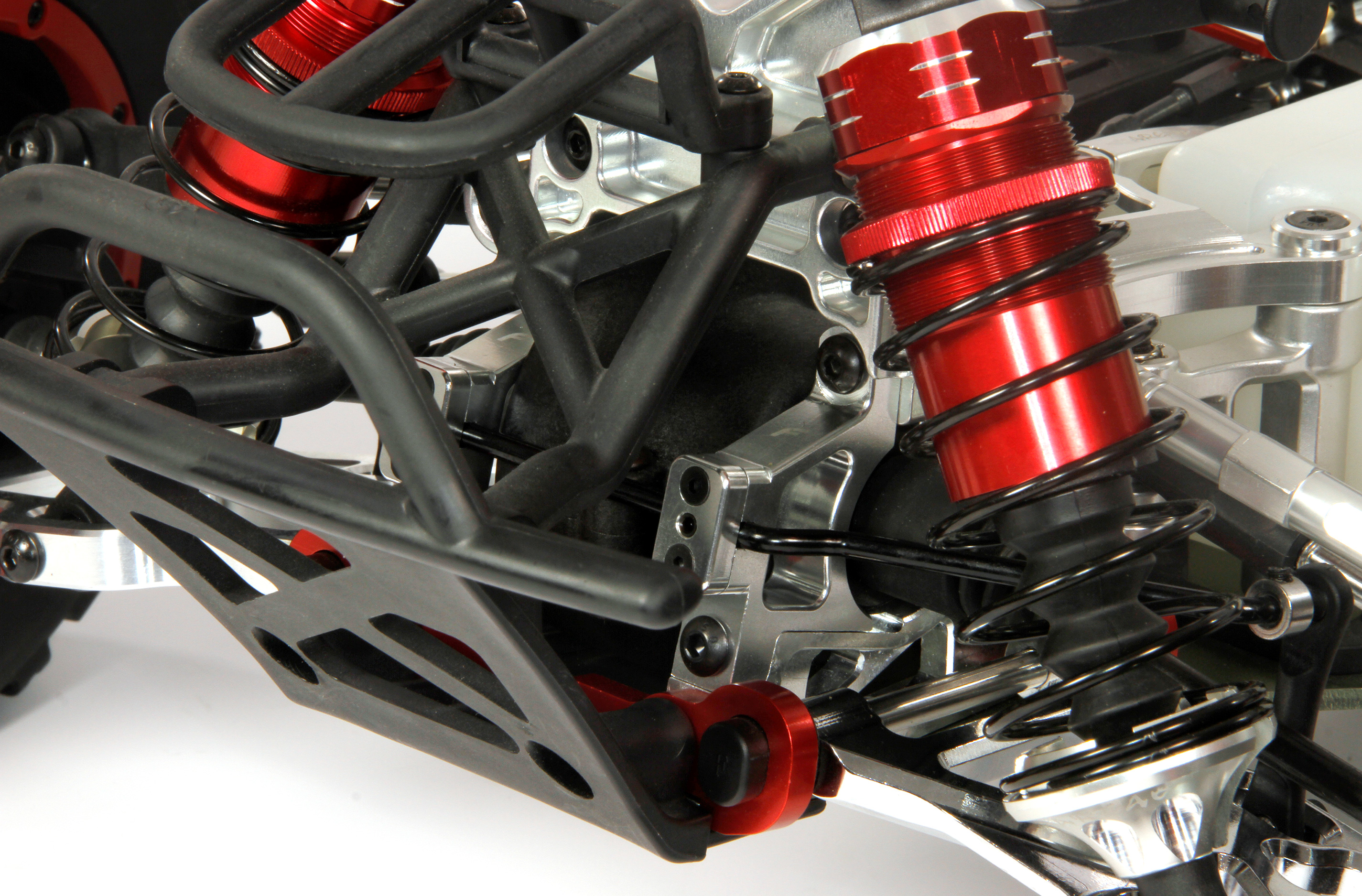 Through the use of aluminum, the problem of torn out threads (incl. the front bumper installation) is eliminated. At the same time the chassis section under the transmission is strengthened and the mounting points for the shock towers are reinforced.