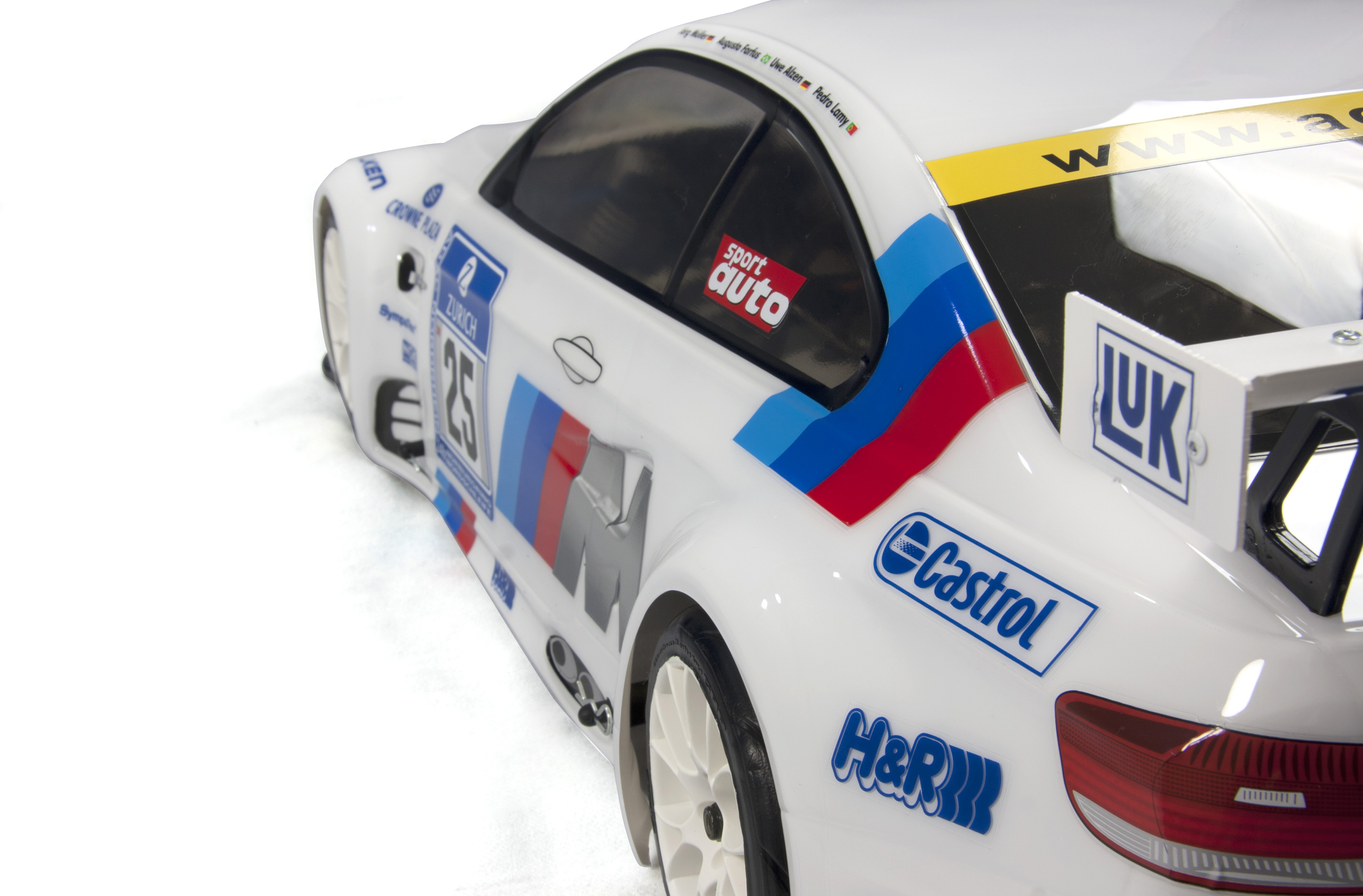 The model has a 530 wheelbase. The models are built on a 4 mm alloy chassis with double wishbones at front and rear axle. All borings of the alloy chassis are countersunk to prevent the screw heads from bearing out. The models are serial equipped with the 2-damper front axle which guarantees an optimal traction of both front wheels. At the front/rear axle you can adjust through track rods or adjusting screws with right-/left-handed thread the king pin angle, trailing effect and toe-in.