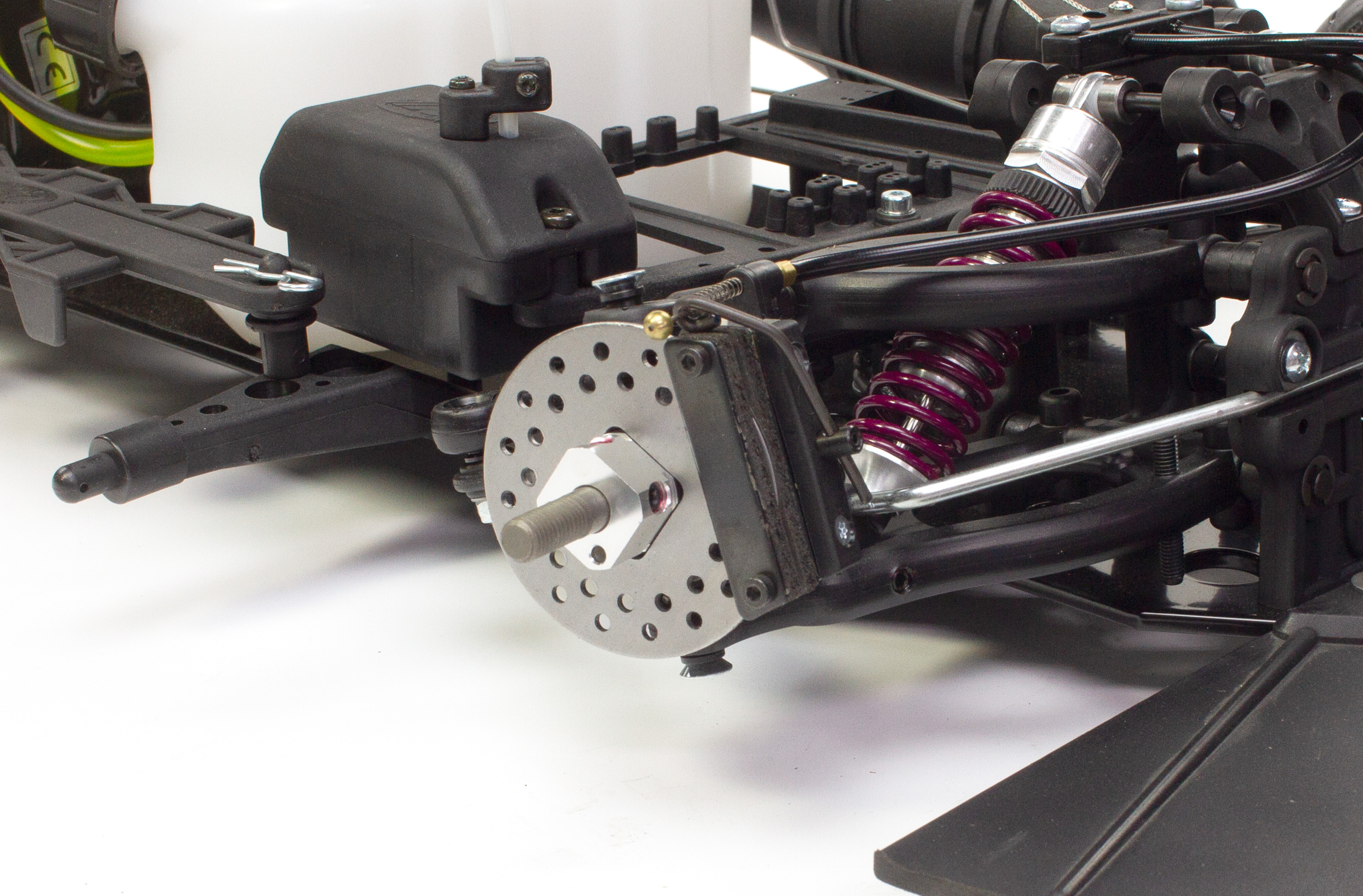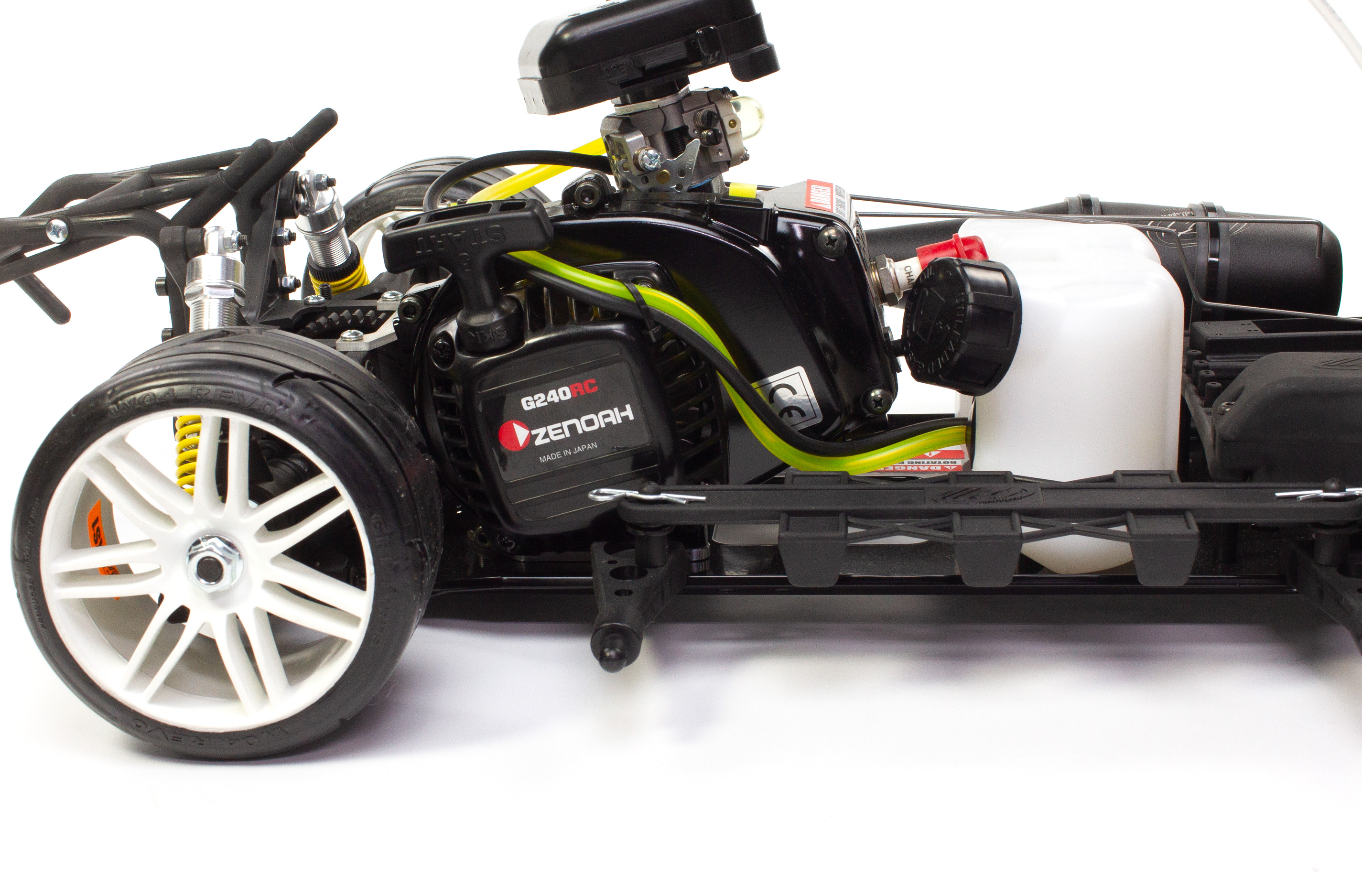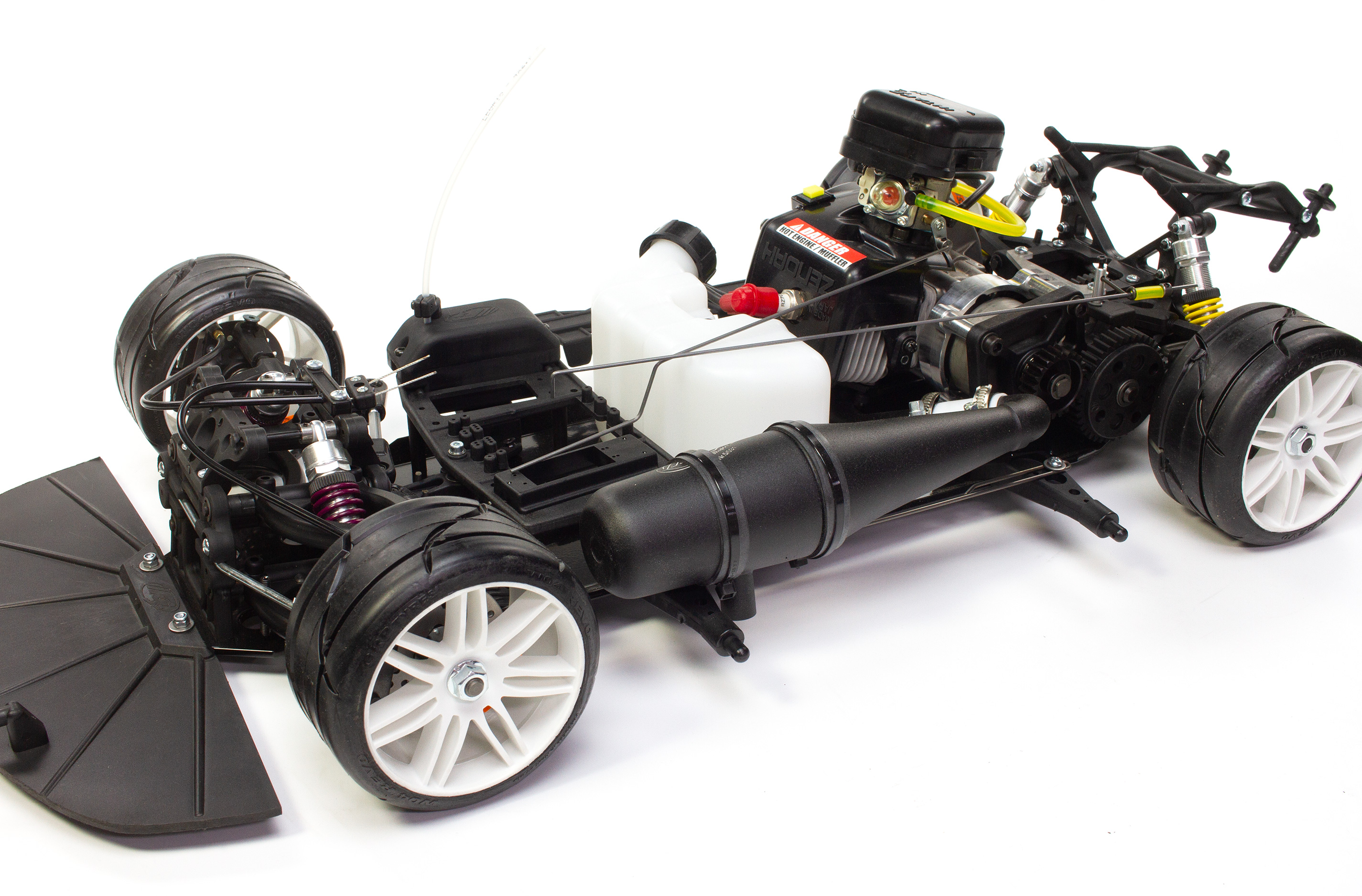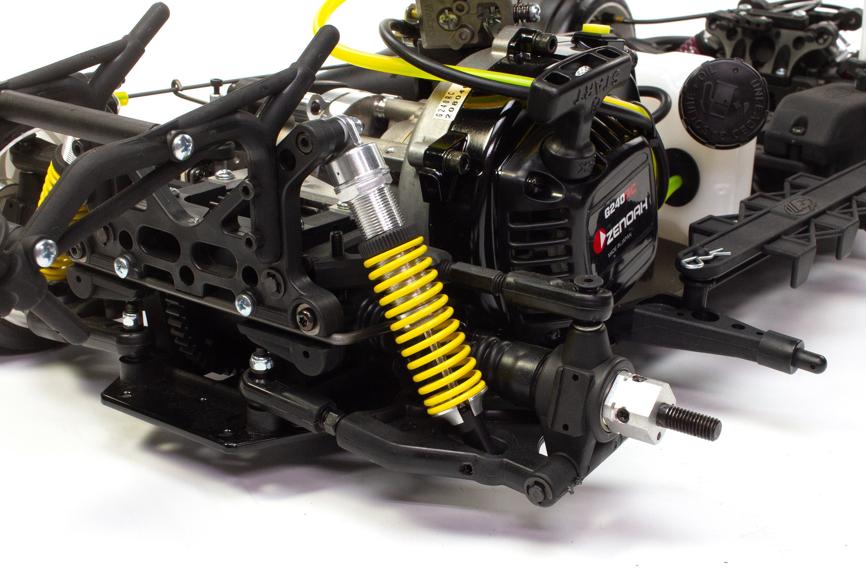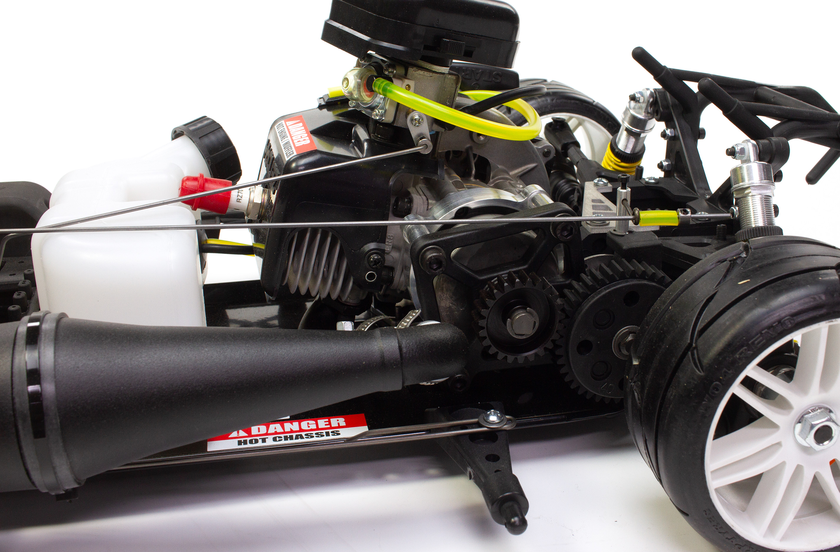 The model has a 465 wheelbase. The models are built on a 4mm alloy chassis with double wishbones at front and rear axle. All borings of the alloy chassis are countersunk to prevent the screw heads from bearing out. The models are serial equipped with the 2-damper front axle which guarantees an optimal traction of both front wheels. At the front/rear axle you can adjust through track rods or adjusting screws with right-/left-handed thread the king pin angle, trailing effect and toe-in. Further equipment points are front disk brakes, differential gear, easy-running FG ball drive, alloy brake calliper with big brake disk, stabilizer bar front and rear, tuned pipe muffler, rear brace, 24T steel pinion, spark plug cap suppression cover, latest version (Evo) oil-pressure shock absorbers with volume control and external adjusting ring for the initial spring preload. All rotating parts as shafts, axles and clutch bells a.s.o. are supported by ball bearings.