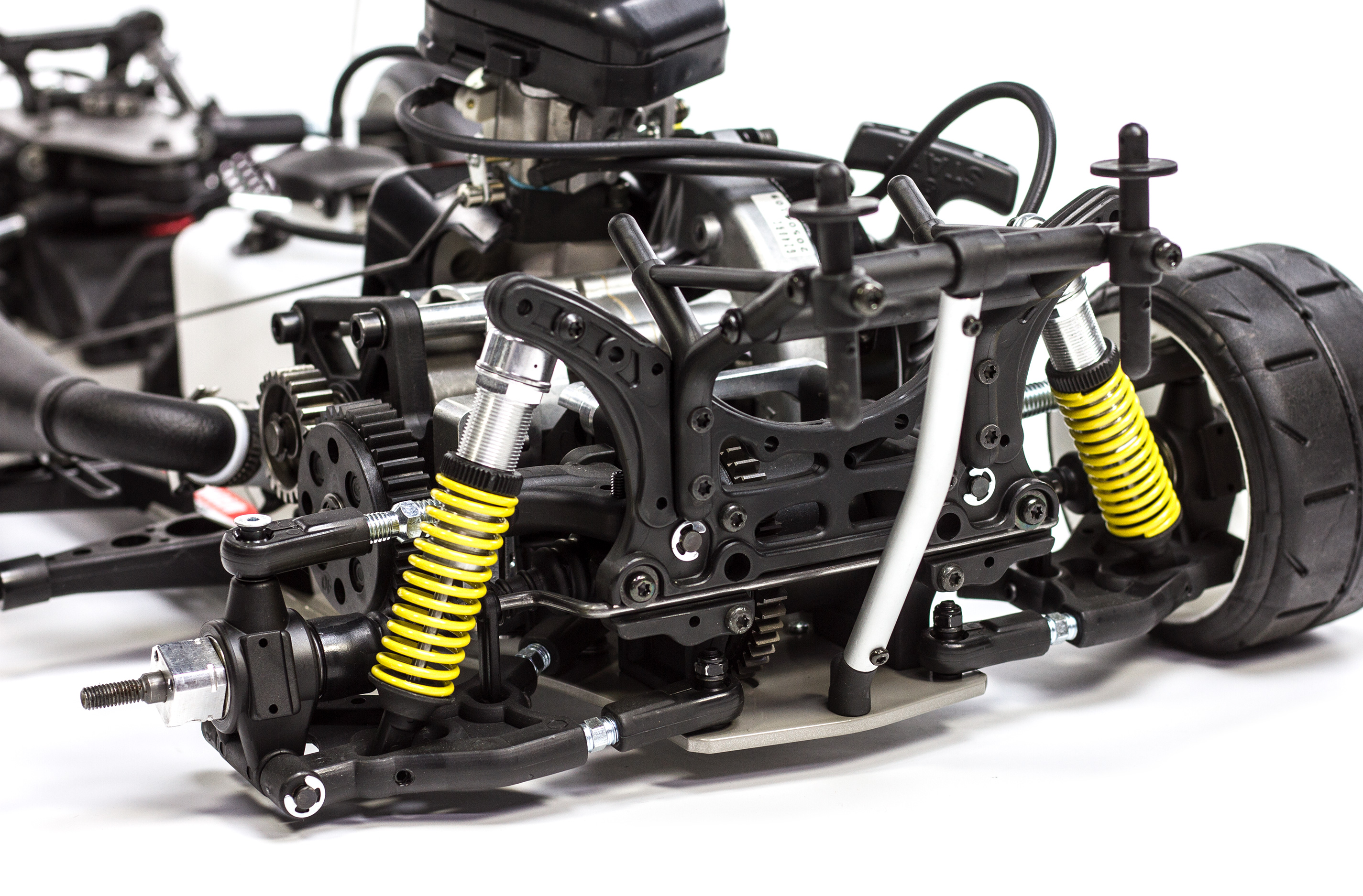 The model has a 535 wheelbase. The models are built on a 4mm alloy chassis with double wishbones at front and rear axle. All borings of the alloy chassis are countersunk to prevent the screw heads from bearing out. The models are serial equipped with the 2-damper front axle which guarantees an optimal traction of both front wheels. At the front/rear axle you can adjust through track rods or adjusting screws with right-/left-handed thread the king pin angle, trailing effect and toe-in. Further equipment points are front disk brakes, differential gear, easy-running FG ball drive, alloy brake calliper with big brake disk, stabilizer bar front and rear, tuned pipe muffler, Evo gas tank, rear brace, 24T steel pinion, spark plug cap suppression cover, latest version (Evo) oil-pressure shock absorbers with volume control and external adjusting ring for the initial spring preload. All rotating parts as shafts, axles and clutch bells a.s.o. are supported by ball bearings.