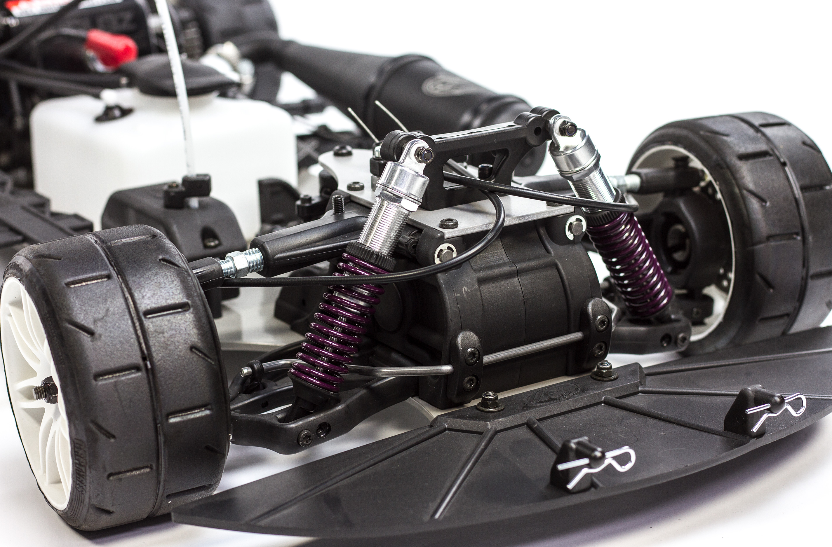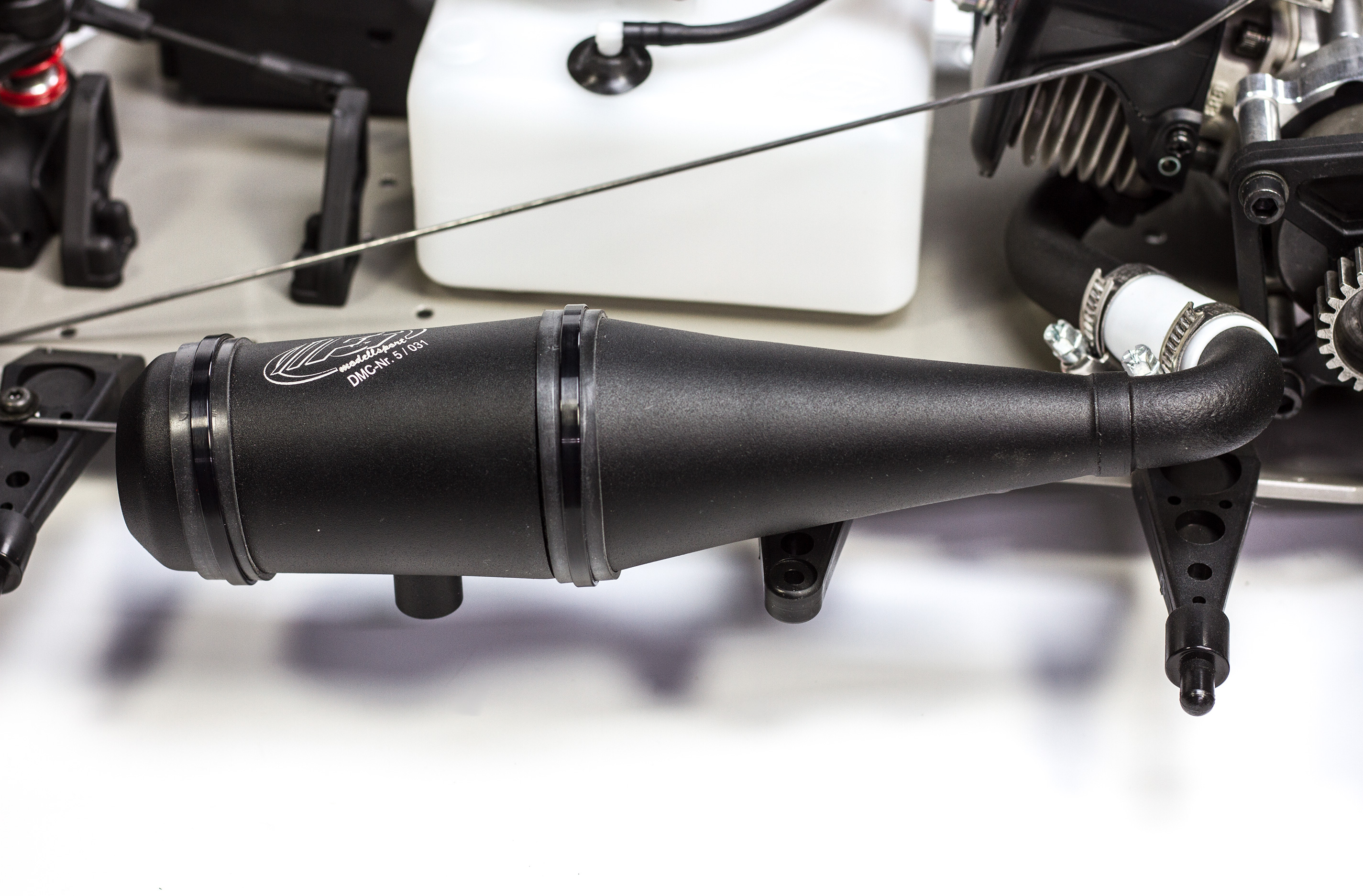 The model has a 535 wheelbase. The models are built on a 4mm alloy chassis with double wishbones at front and rear axle. All borings of the alloy chassis are countersunk to prevent the screw heads from bearing out. The models are serial equipped with the 2-damper front axle which guarantees an optimal traction of both front wheels. At the front/rear axle you can adjust through track rods or adjusting screws with right-/left-handed thread the king pin angle, trailing effect and toe-in. Further equipment points are front disk brakes, differential gear, easy-running FG ball drive, alloy brake calliper with big brake disk, stabilizer bar front and rear, tuned pipe muffler, Evo gas tank, rear brace, 24T steel pinion, spark plug cap suppression cover, latest version (Evo) oil-pressure shock absorbers with volume control and external adjusting ring for the initial spring preload. All rotating parts as shafts, axles and clutch bells a.s.o. are supported by ball bearings.