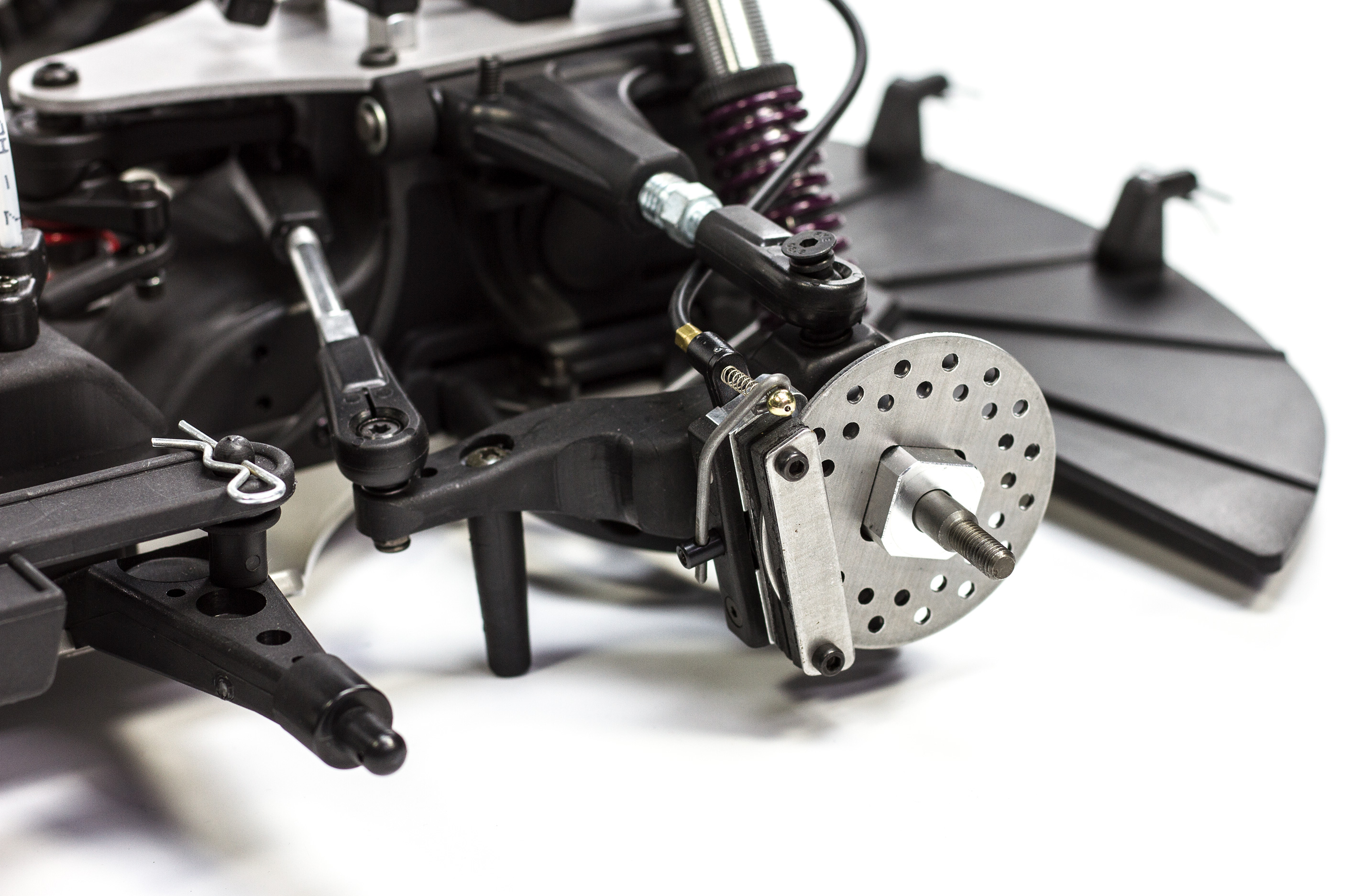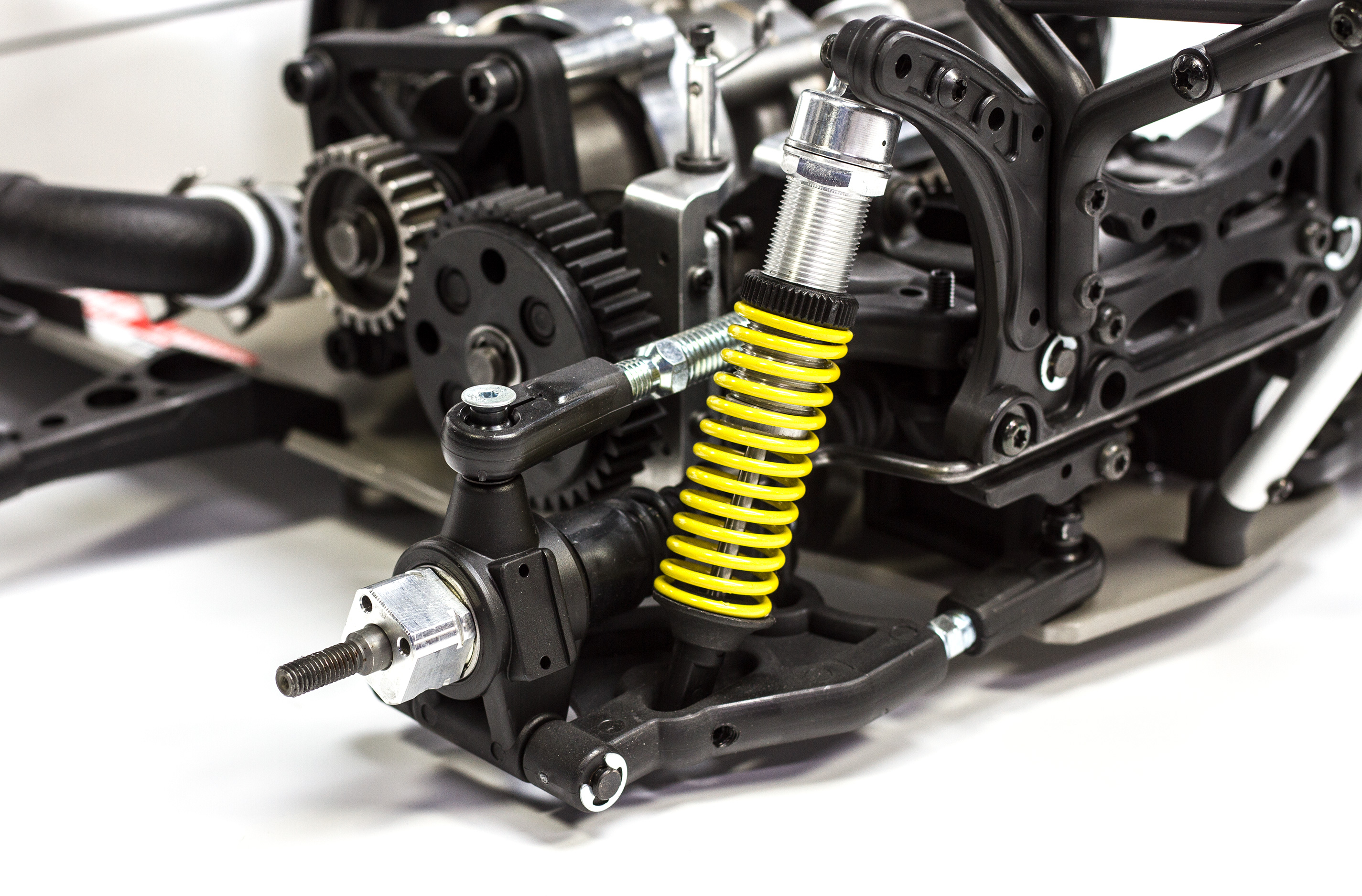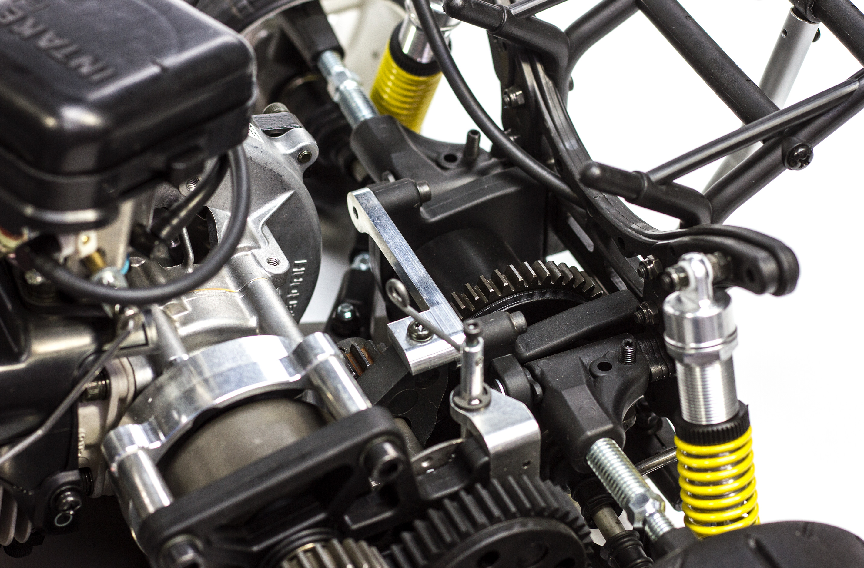 The model has a 535 wheelbase. The models are built on a 4mm alloy chassis with double wishbones at front and rear axle. All borings of the alloy chassis are countersunk to prevent the screw heads from bearing out. The models are serial equipped with the 2-damper front axle which guarantees an optimal traction of both front wheels. At the front/rear axle you can adjust through track rods or adjusting screws with right-/left-handed thread the king pin angle, trailing effect and toe-in. Further equipment points are front disk brakes, differential gear, easy-running FG ball drive, alloy brake calliper with big brake disk, stabilizer bar front and rear, tuned pipe muffler, Evo gas tank, rear brace, 24T steel pinion, spark plug cap suppression cover, latest version (Evo) oil-pressure shock absorbers with volume control and external adjusting ring for the initial spring preload. All rotating parts as shafts, axles and clutch bells a.s.o. are supported by ball bearings.