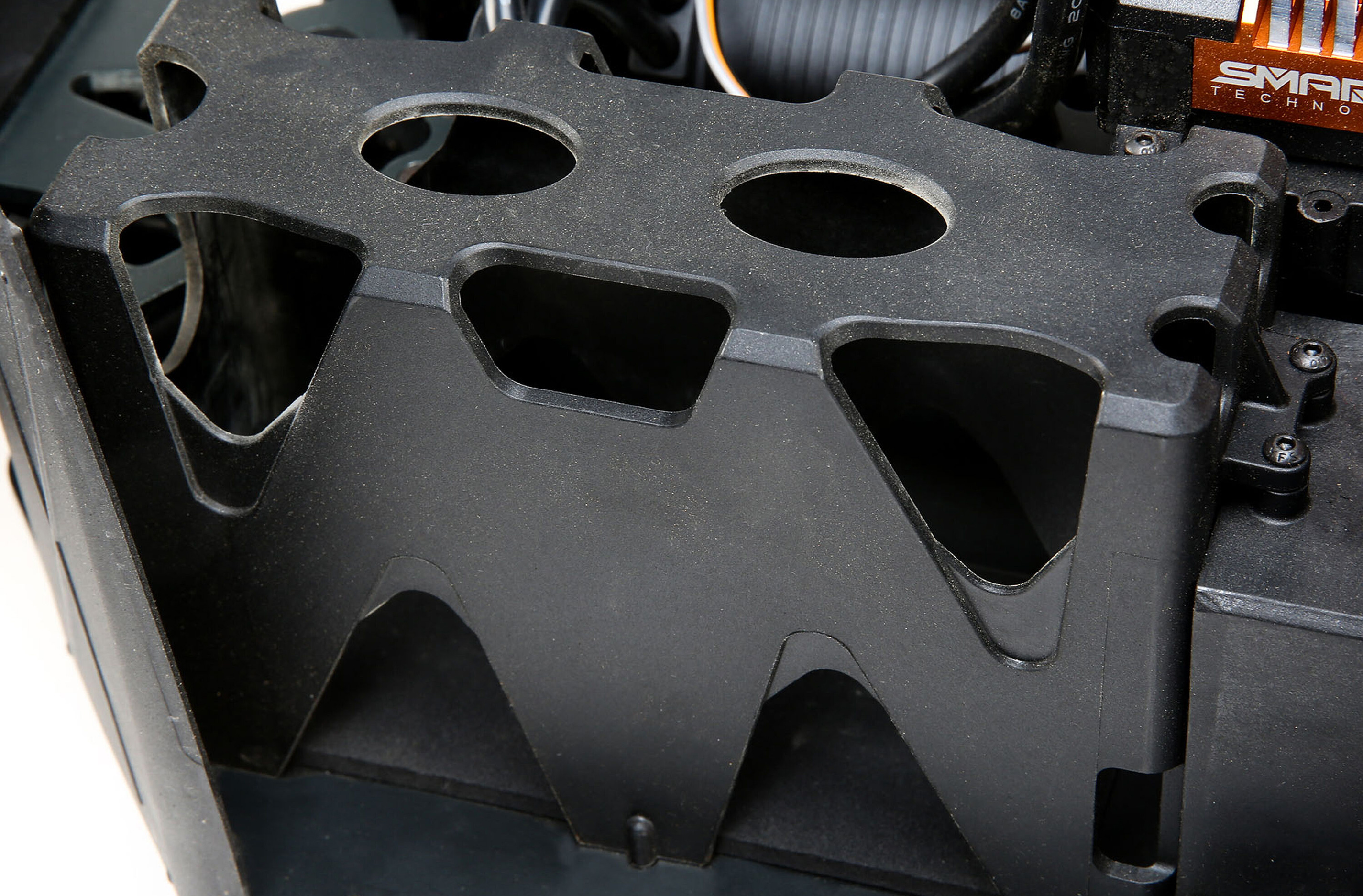 Just like the 1:1 desert trucks, the Super Baja Rey 2.0 comes with a super-rigid roll cage made of super-tough composite material that enhances the truck"s scale looks and durability. It is integrated with the 4mm anodized aluminum chassis plate providing the ultimate protection for your truck and electronics.