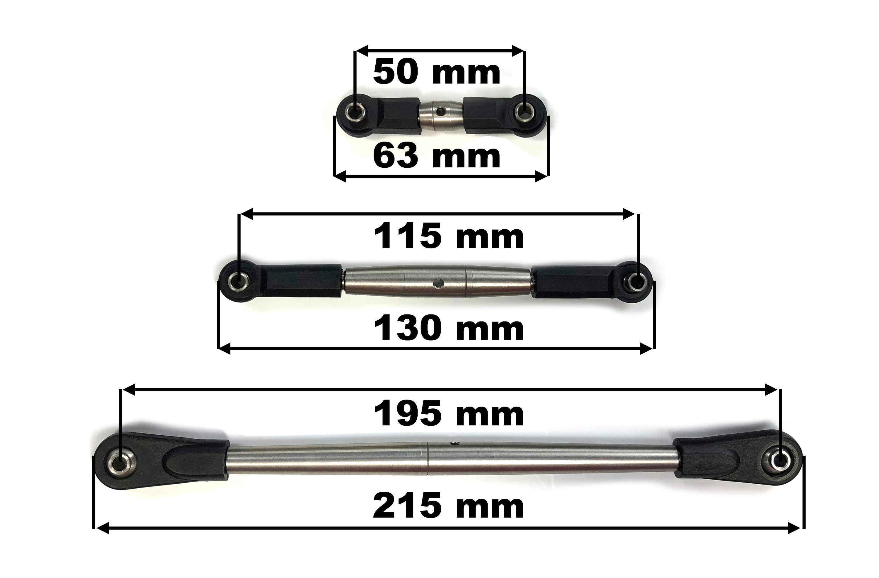 The GPM stainless steel trailing arm and steering linkage set for Losi Super Baja Rey contains a billet aluminum servo arm, the link rod from servo to servo saver, the steering rods and the upper trailing arms. Turnbuckle style rods made of stainless steel are used. This allows to change the length of these rods easily without disassembly and the suspension setup can be changed.