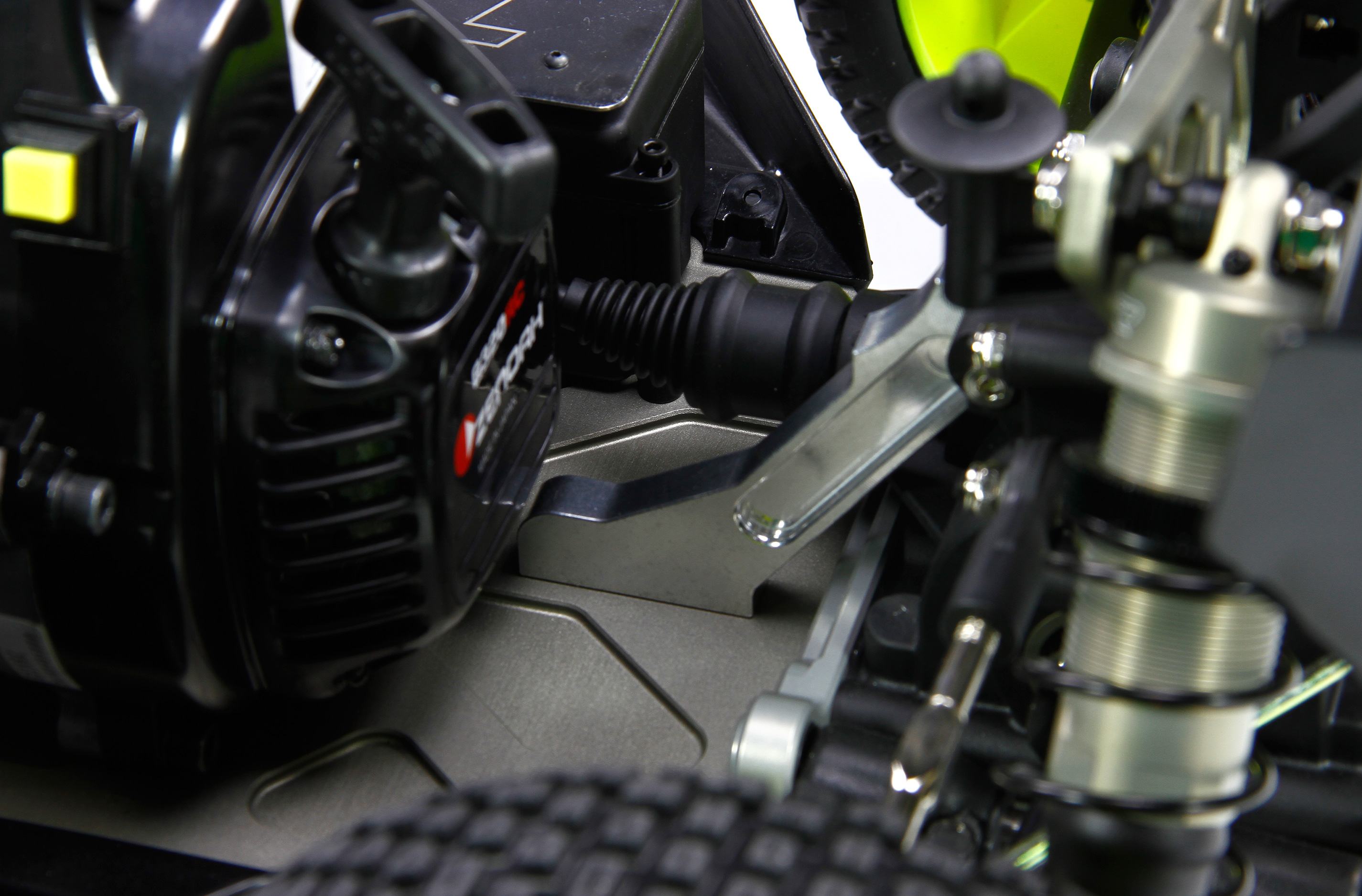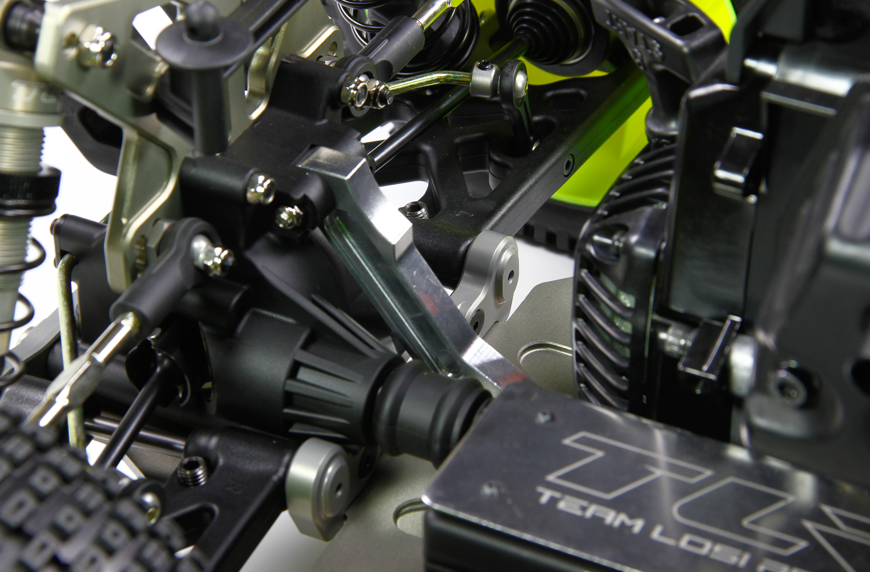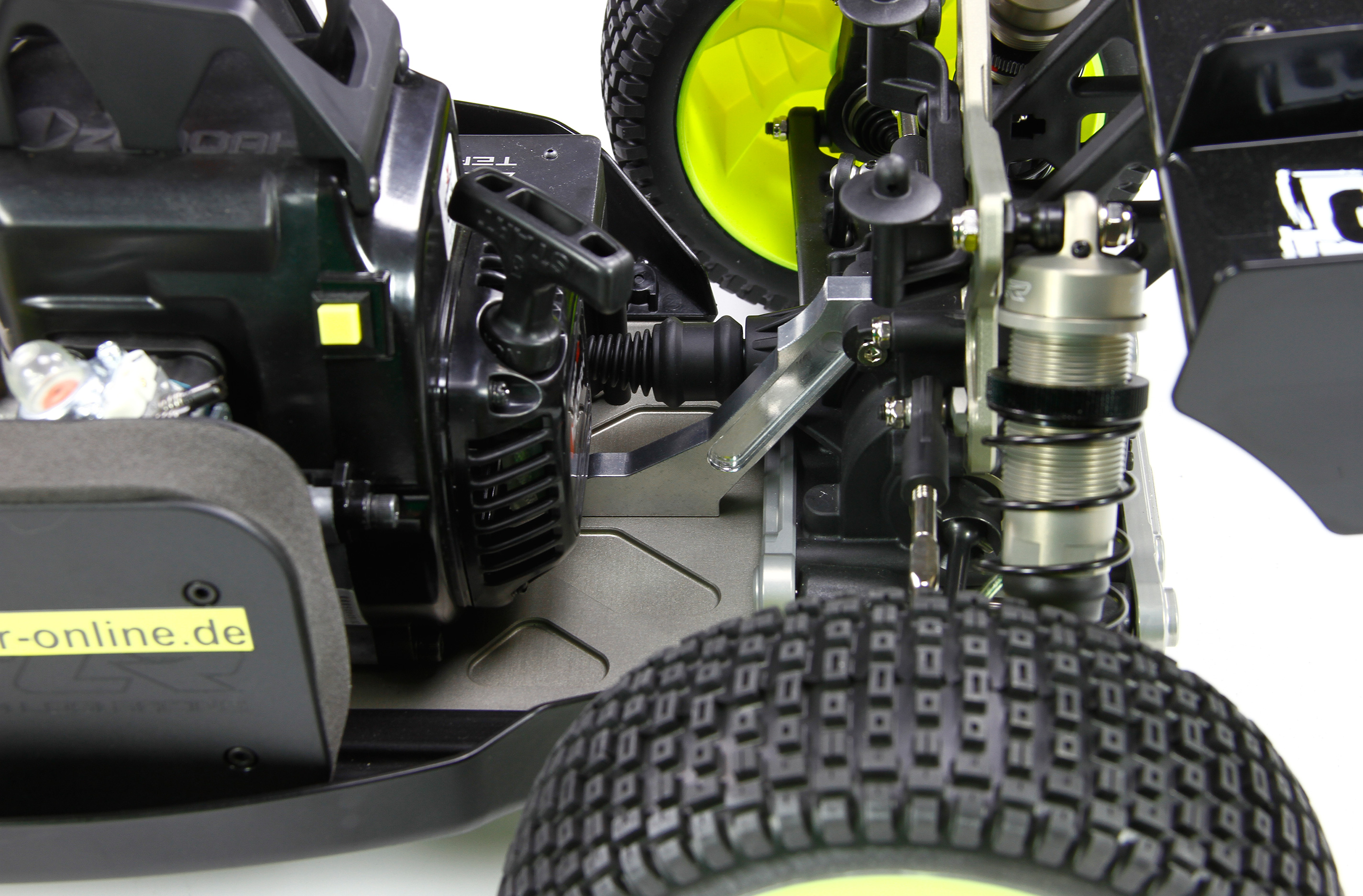 The shape of the TLR 5ive-B rear brace with its much steeper angle compared to the 5ive-T and Mini makes the use of aluminum for this application particularly interesting. The standard plastic part cannot provide the desired dimensional stability in the long run. The material strength and temperature resistance of aluminum offer a significant advantage.