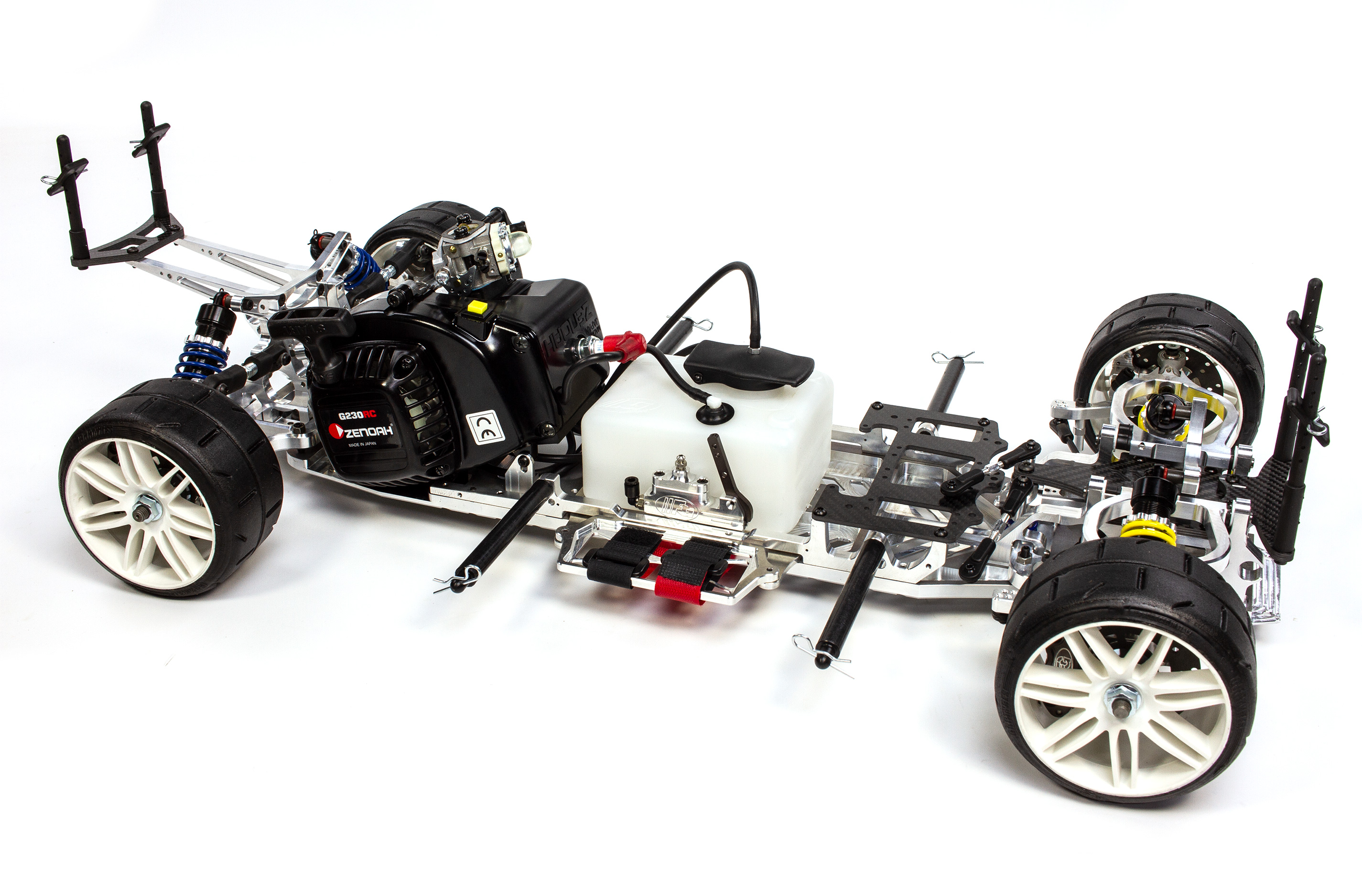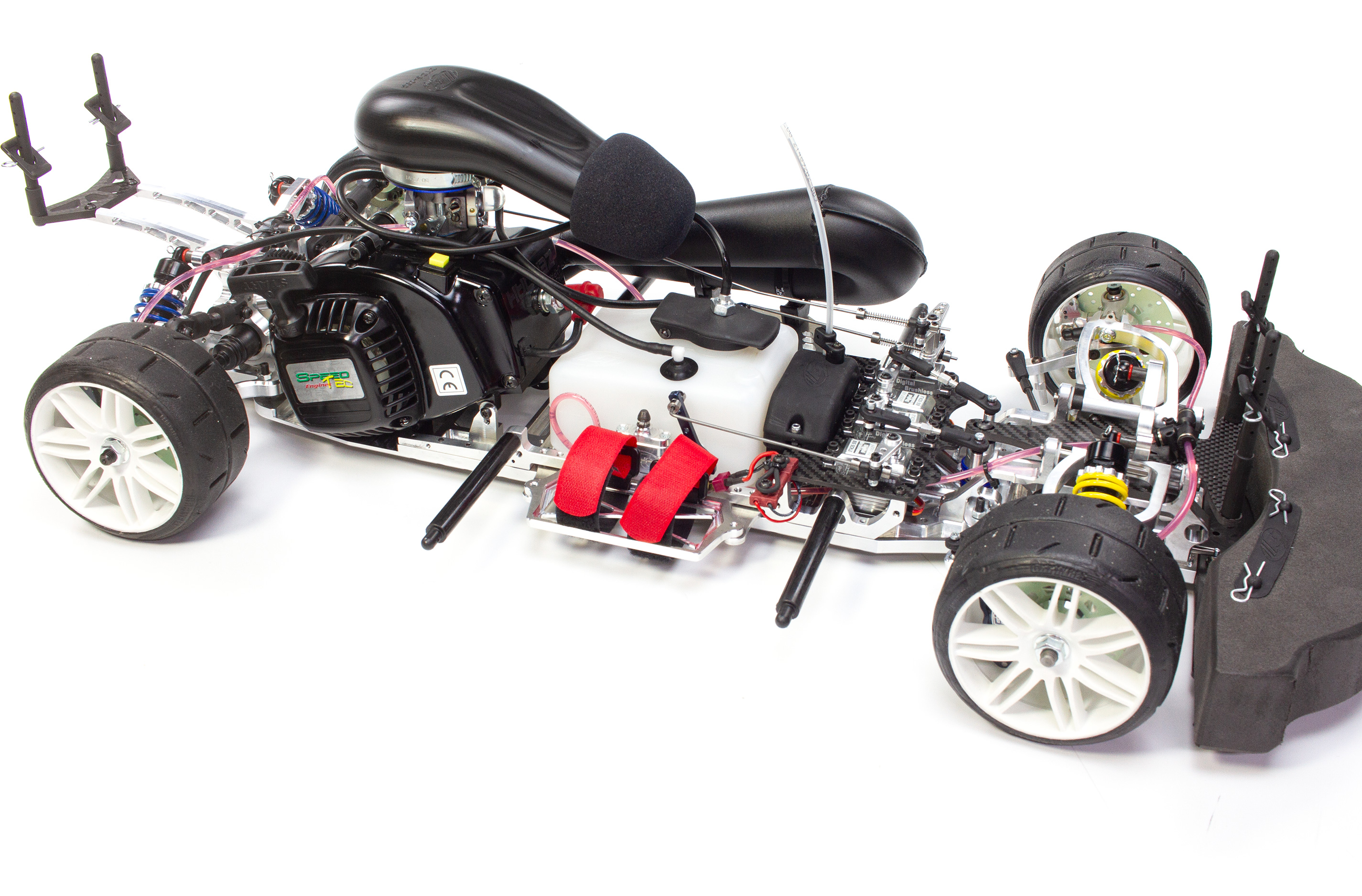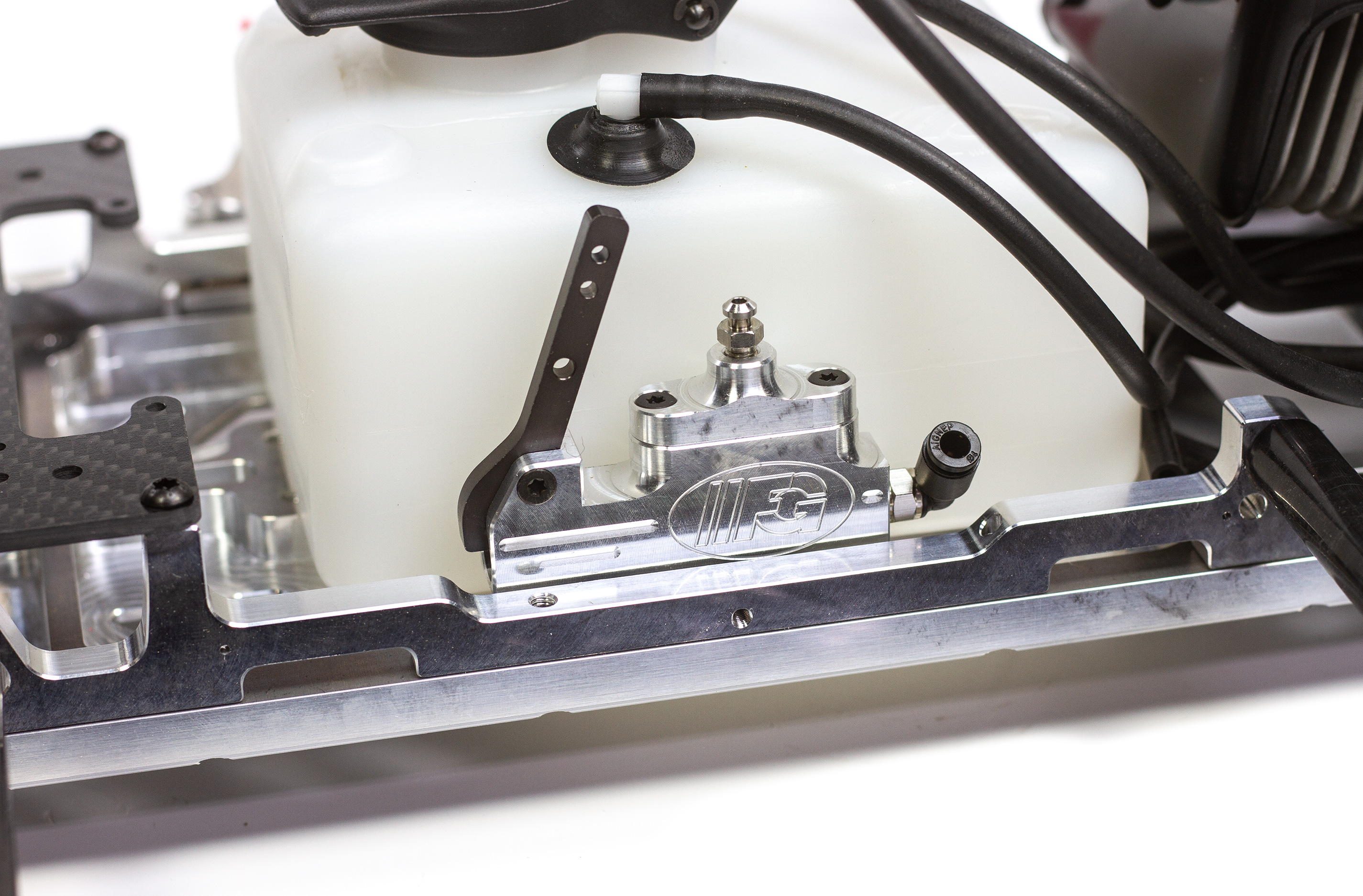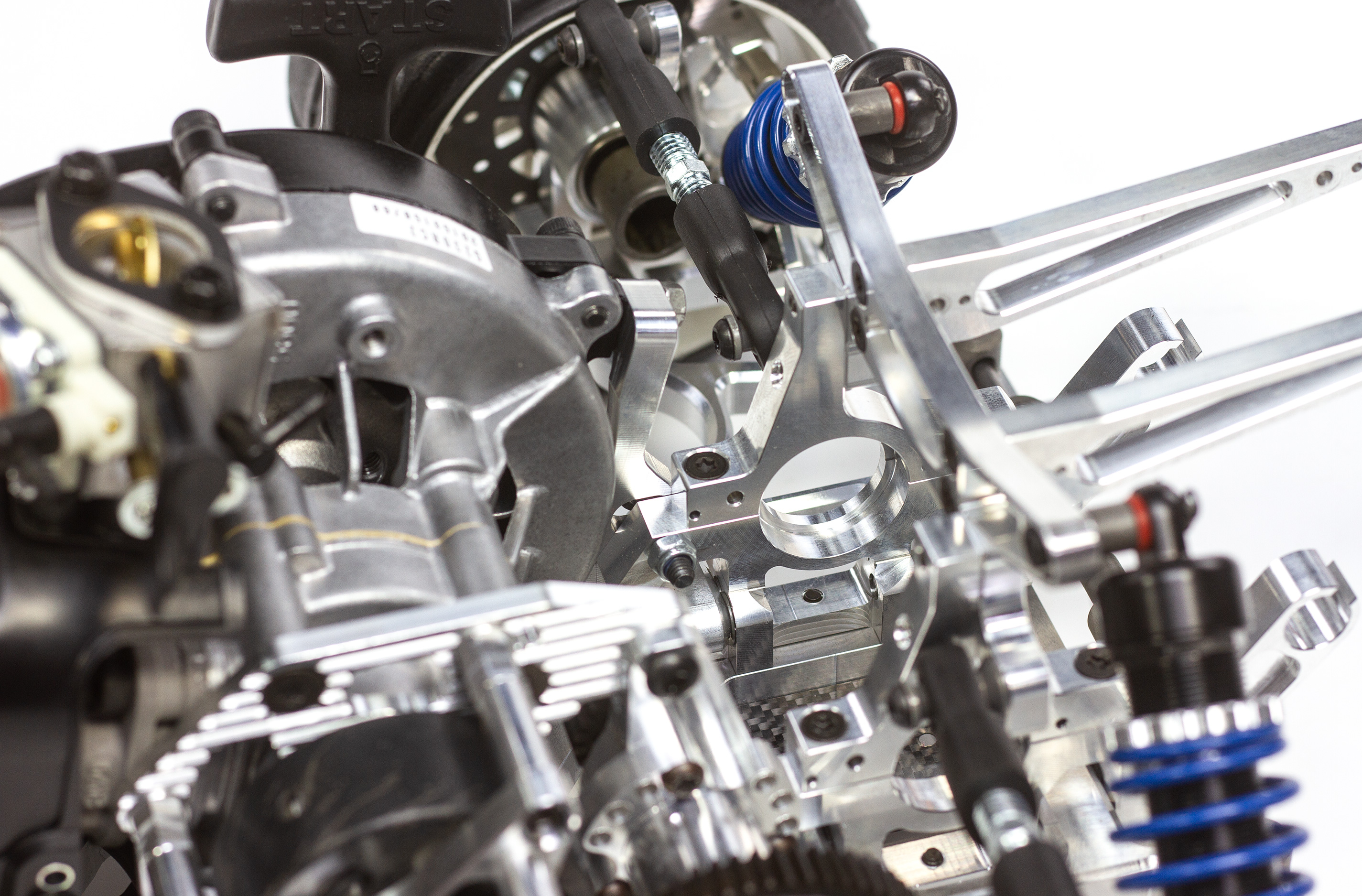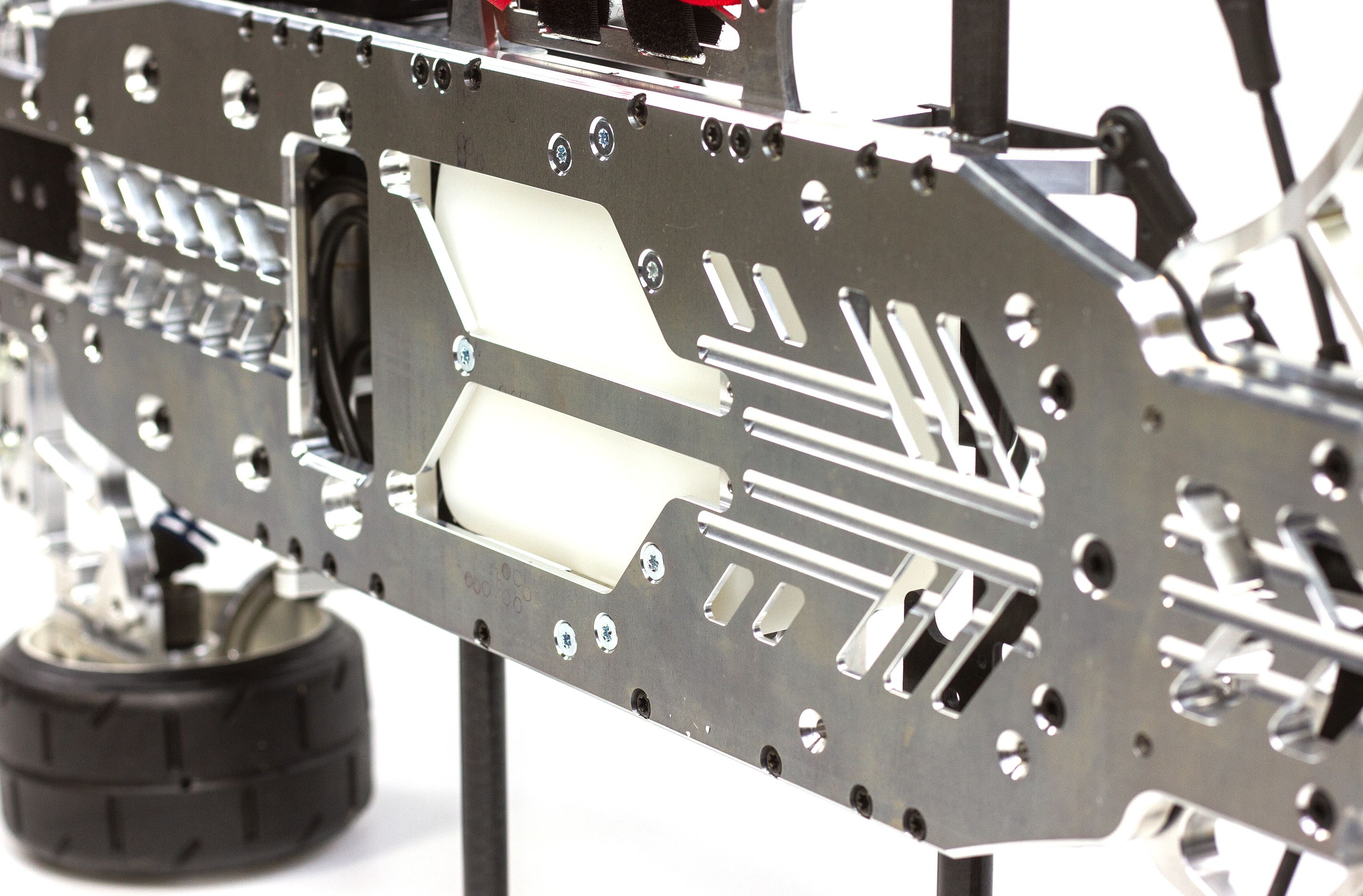 Unique among the large scale models. New stabilizer bar construction front and rear. Ball stabiliszers or frame stabilizers can be used (accessories). 10 mm thick chassis made of T7075 aluminium with cut-outs for weights (also under the tank) and grooves in the front area. This allows the vehicle to be perfectly adapted to the track or the driver. The engine is now again bolted to the chassis for more stiffness.