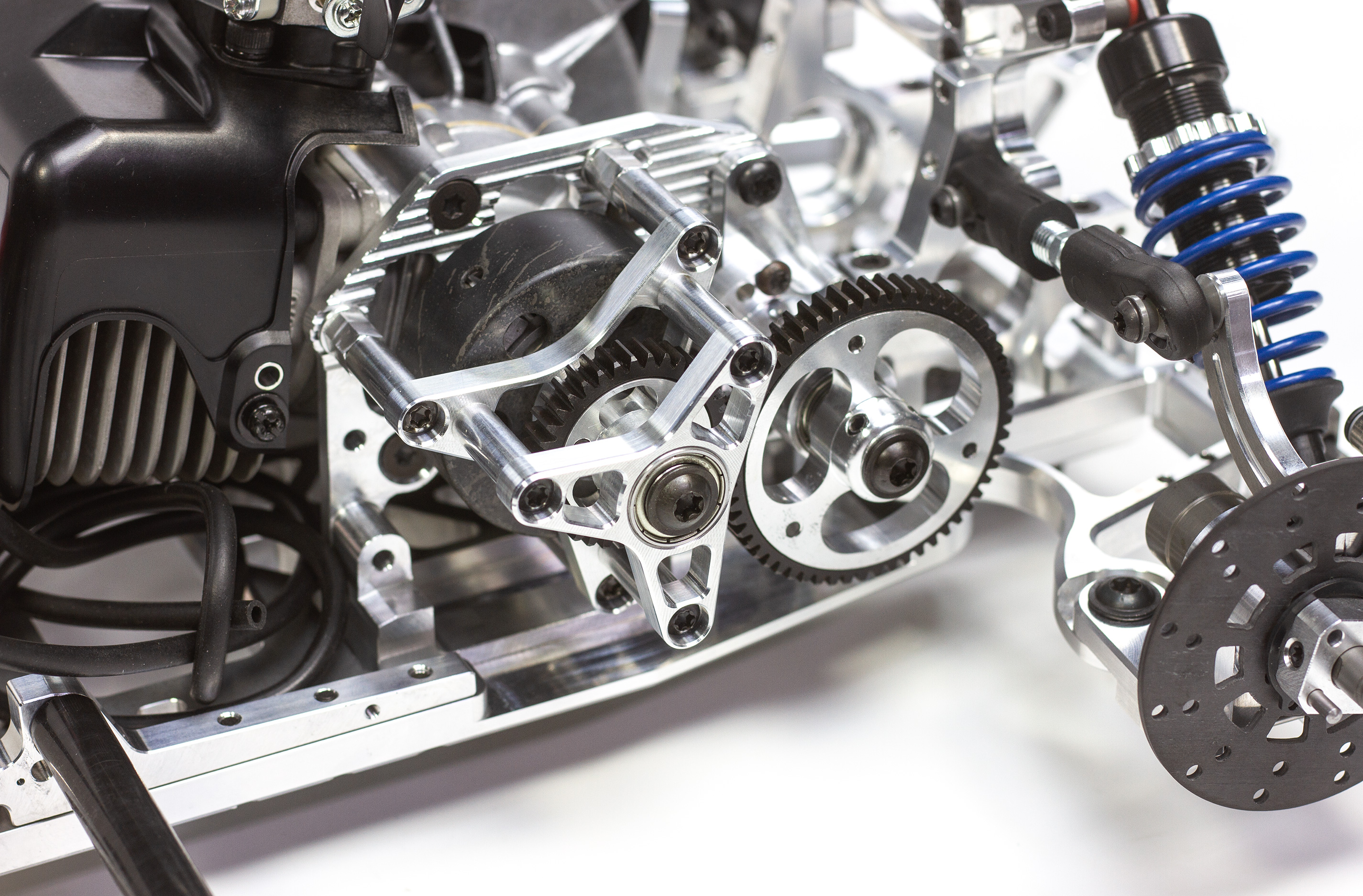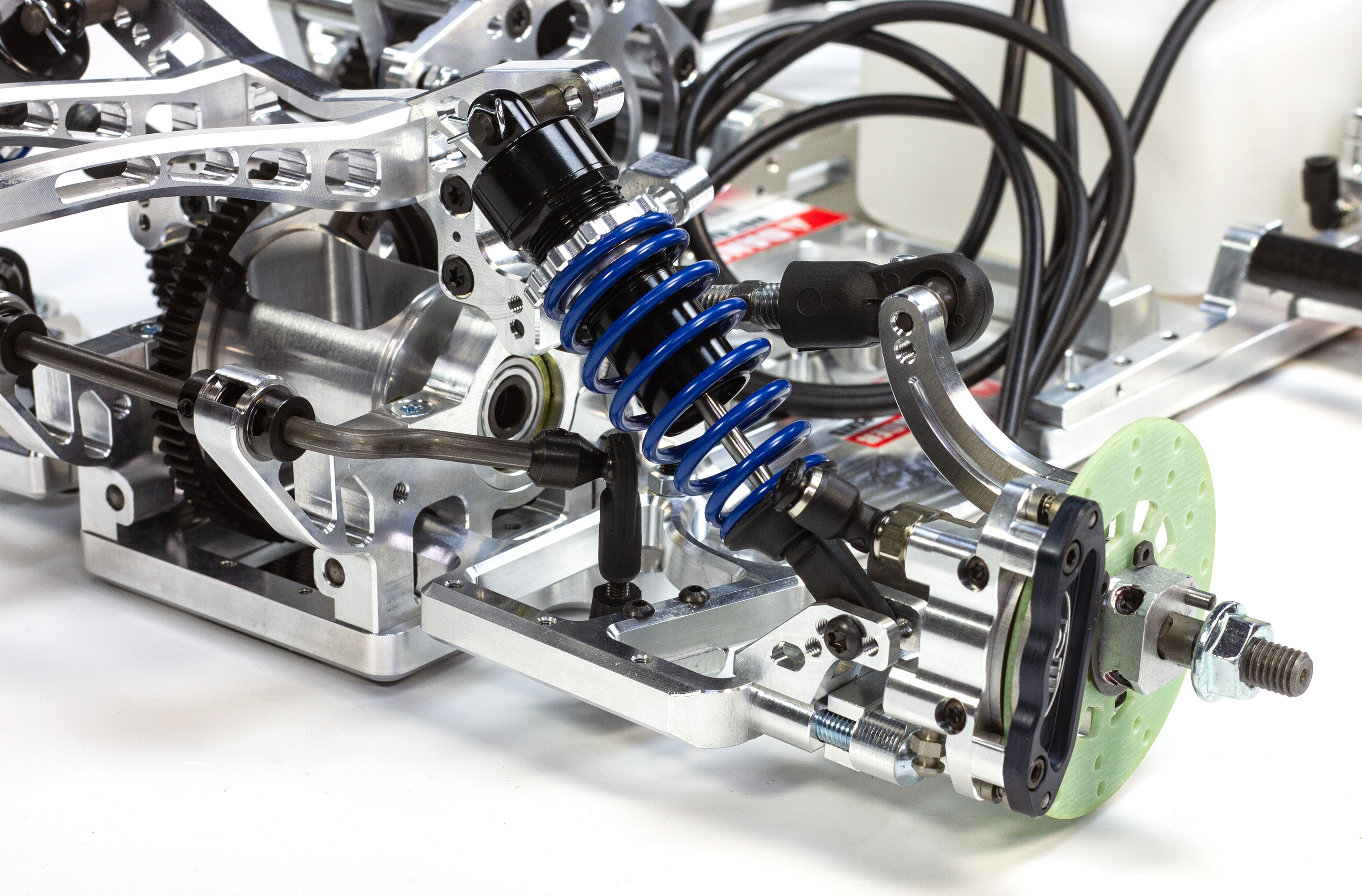 Optimally designed wishbones on front and rear suspension. Reinforced and with toe-in adjustability, which is performed via aluminum wedges. Front upper wishbone for more adjustment possibilities. All gears with fine pitch.