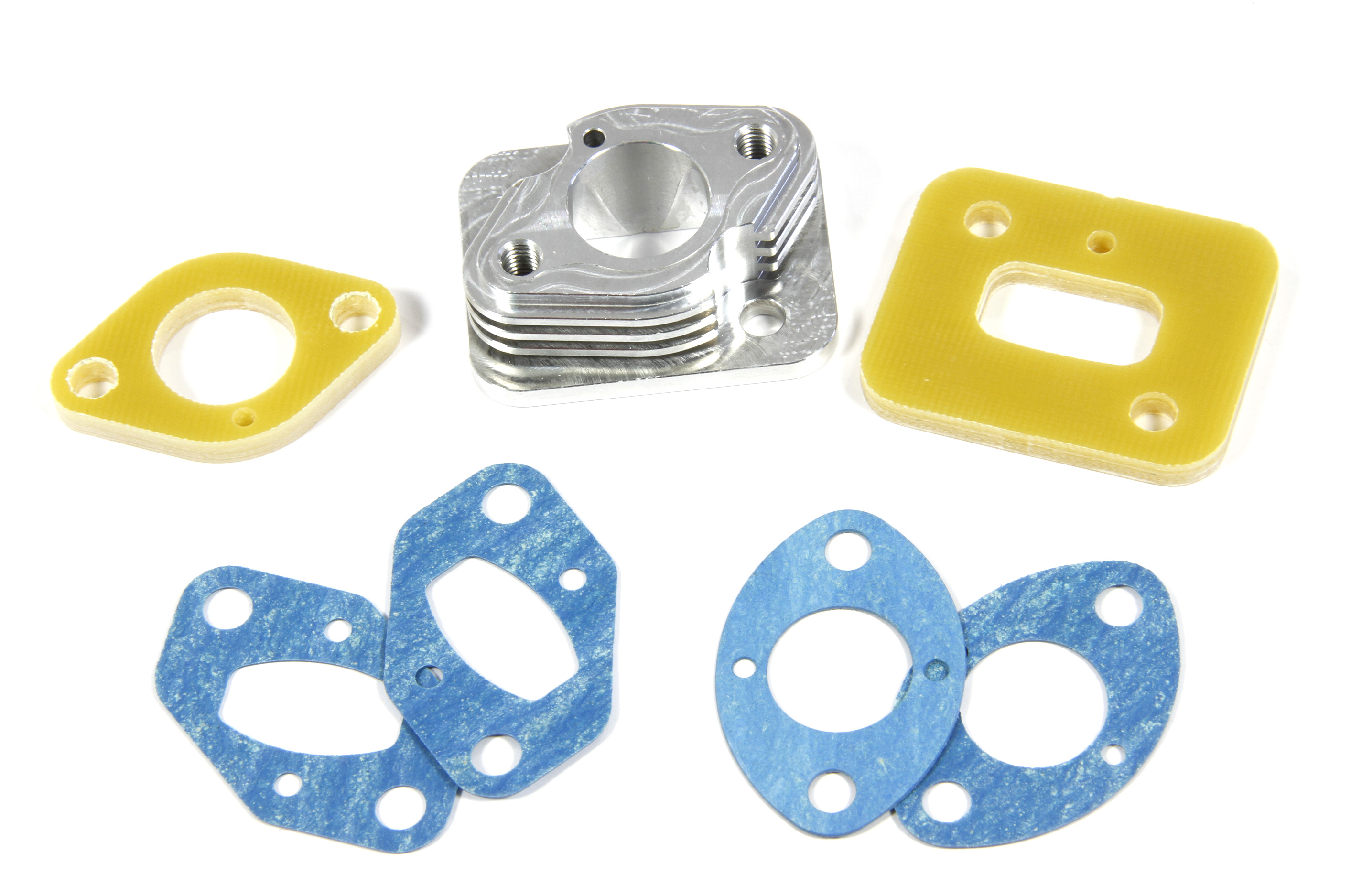 Made from T7075 aluminum with wide epoxy insulator plates to protect against engine heat transfer. Venturi-shaped bore increases engine performance.