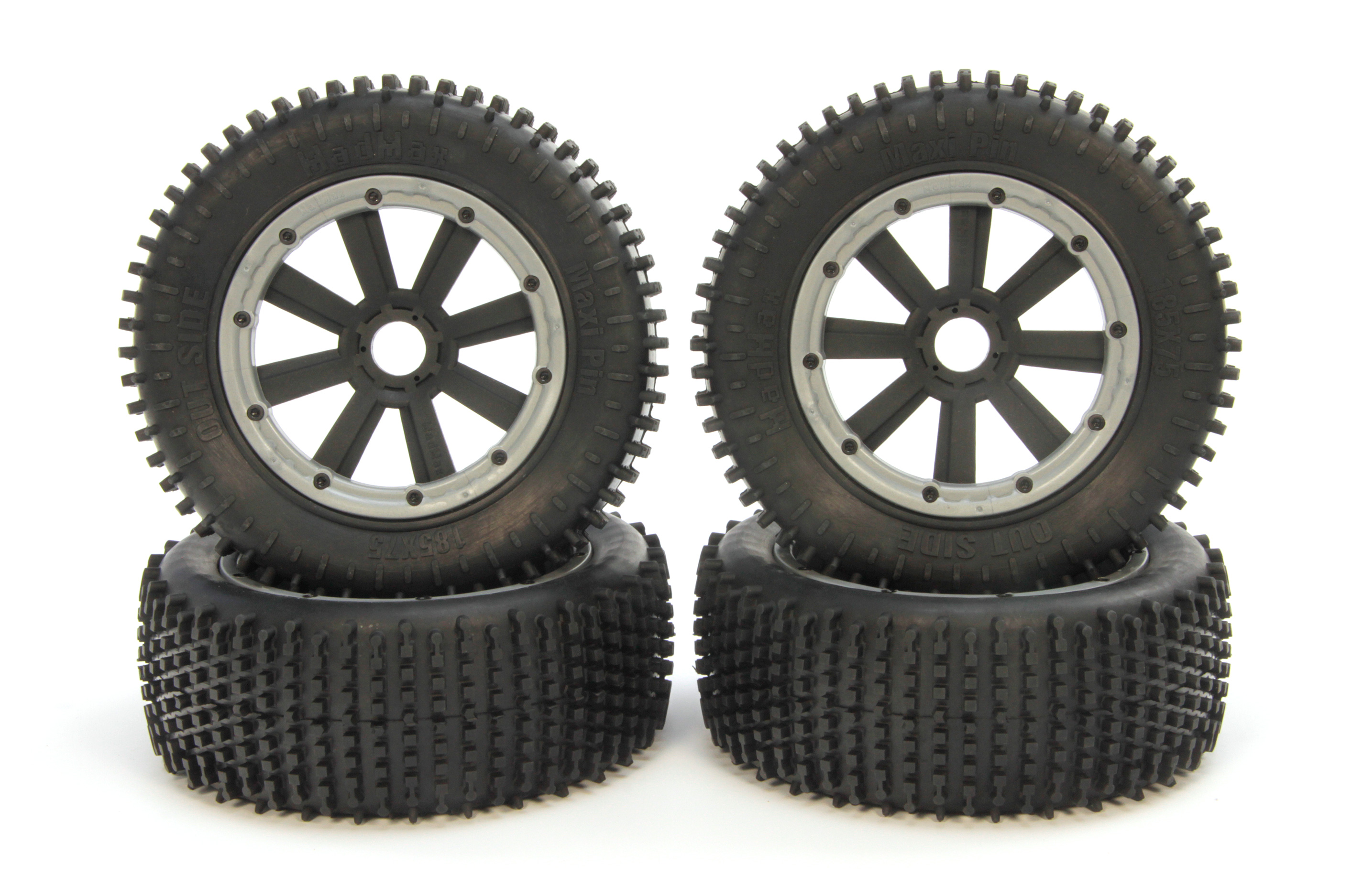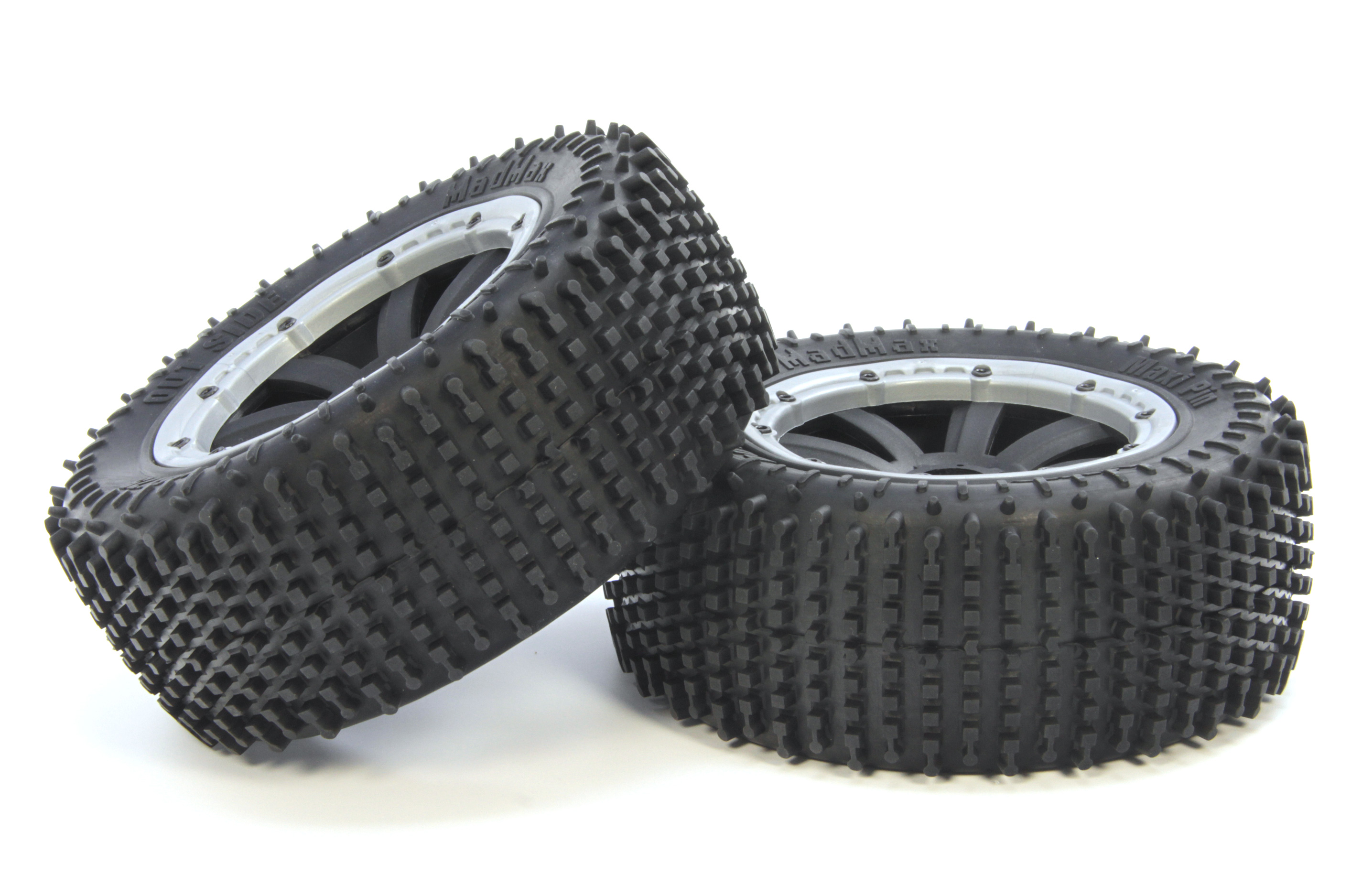MadMax MAXI PIN tire was developed specifically for astro turf tracks! The special tread design with 480 studs per tire provides excellent grip, but also a high load on tire and rim! To stabilize the tire, the outer shoulder features radial ribs which minimizes the tilting under load and counteract the shear forces during cornering. Furthermore, the MAXI PIN tire has studs positioned on the outside shoulder, which support the steering in corners.